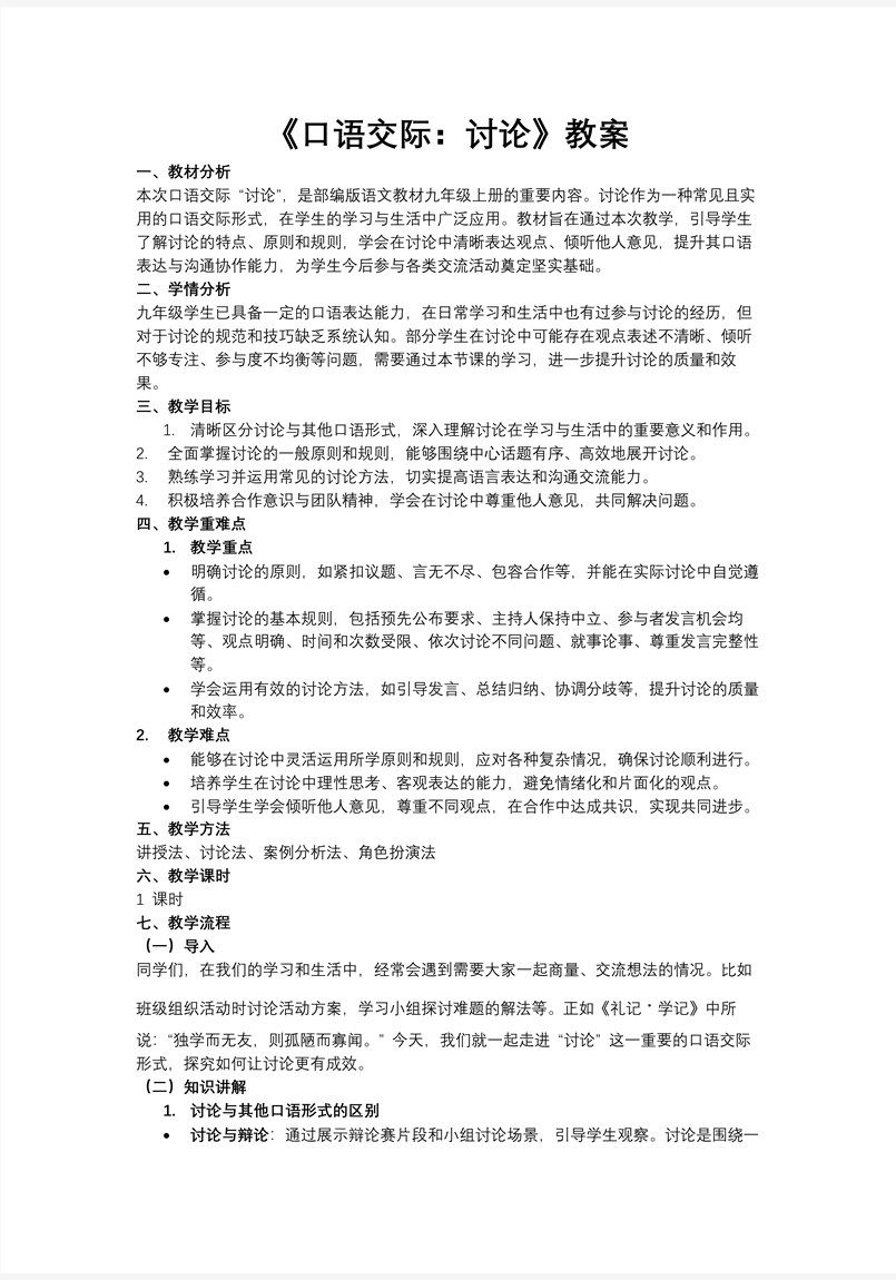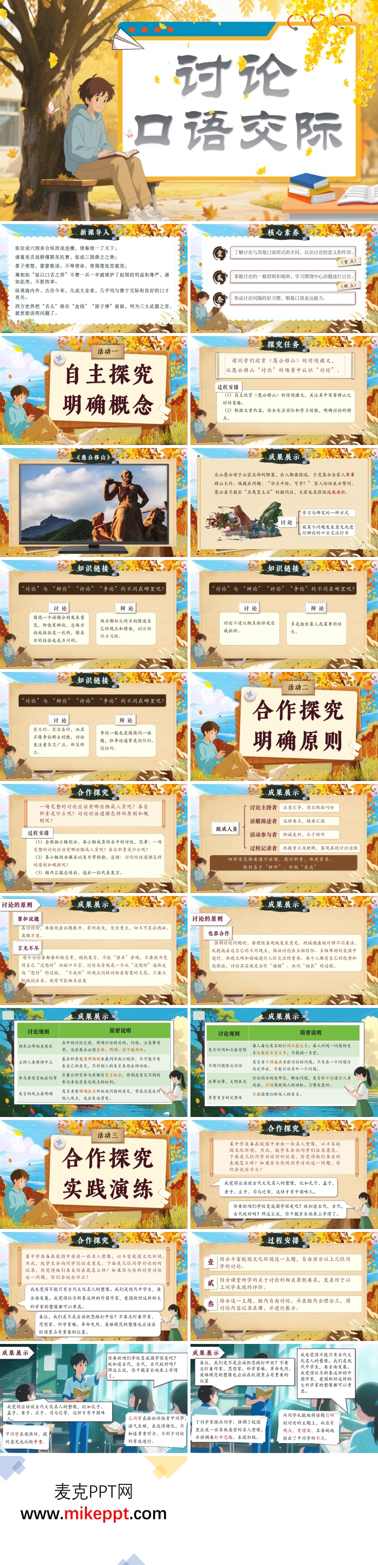 这套为部编版语文九年级上册《口语交际:讨论》量身定制的PPT课件共28张,其立意在于让学生真切感受到“讨论”不仅是课堂环节,更是贯穿学习与生活的关键能力;通过系统的方法指导与情境演练,使他们能够熟练运用常见的讨论策略,提升语言组织与即时应对的水平,同时在合作中学会倾听、尊重异见,培育团队精神,最终形成“以理服人、共同进步”的价值追求。 课件以“三幕式”结构循序展开。第一幕“自主探究·明确概念”借助经典寓言《愚公移山》创设情境:PPT先播放一段动画,再现愚公召集家人商议移山的场景,随后抛出“他们真的在讨论吗?讨论与争论、辩论有何区别?”这一核心问题。学生在观看、对比、质疑的过程中,自主提炼“讨论”是为了达成目标而进行的平等、有序、合作式的口头交流,并初步总结出“有议题、有听众、有规则、求共识”的四大特征。 第二幕“合作探究·明确原则”从“人”与“规则”两条线并行深入。先以思维导图形式呈现一场完整讨论的“角色谱系”——主持人、记录员、时间管理员、发言人、补充人、观察员,并用卡通图标提示各自职责;随后进入“规则工作坊”,师生共同将“围绕议题、依次发言、倾听不打断、求同存异、文明用语、结论共享”六条黄金法则贴进电子黑板,并用星级评分表让学生现场互评,强化规则意识。 第三幕“合作探究·实践演练”将所学即时落地。教师发布贴近校园生活的议题:“九年级是否应统一取消早读?”学生按6人一组自由组队,现场分配角色,5分钟内完成“背景调研—观点梳理—理由归纳—反驳预设—结论提炼”五步讨论流程,随后各组用2分钟登台展示,由观察员依据“内容深度、表达效果、合作默契、文明礼仪”四维量表即时打分。教师最后以“金句回顾”形式提炼高频亮点与改进建议,并布置延伸任务:将课堂讨论纪要整理成一篇200字的“微提案”,上传班级云盘,真正实现从口头到书面、从课堂到生活的迁移。整节课在28张幻灯片的张弛之间,既见思维火花,又显团队温度。