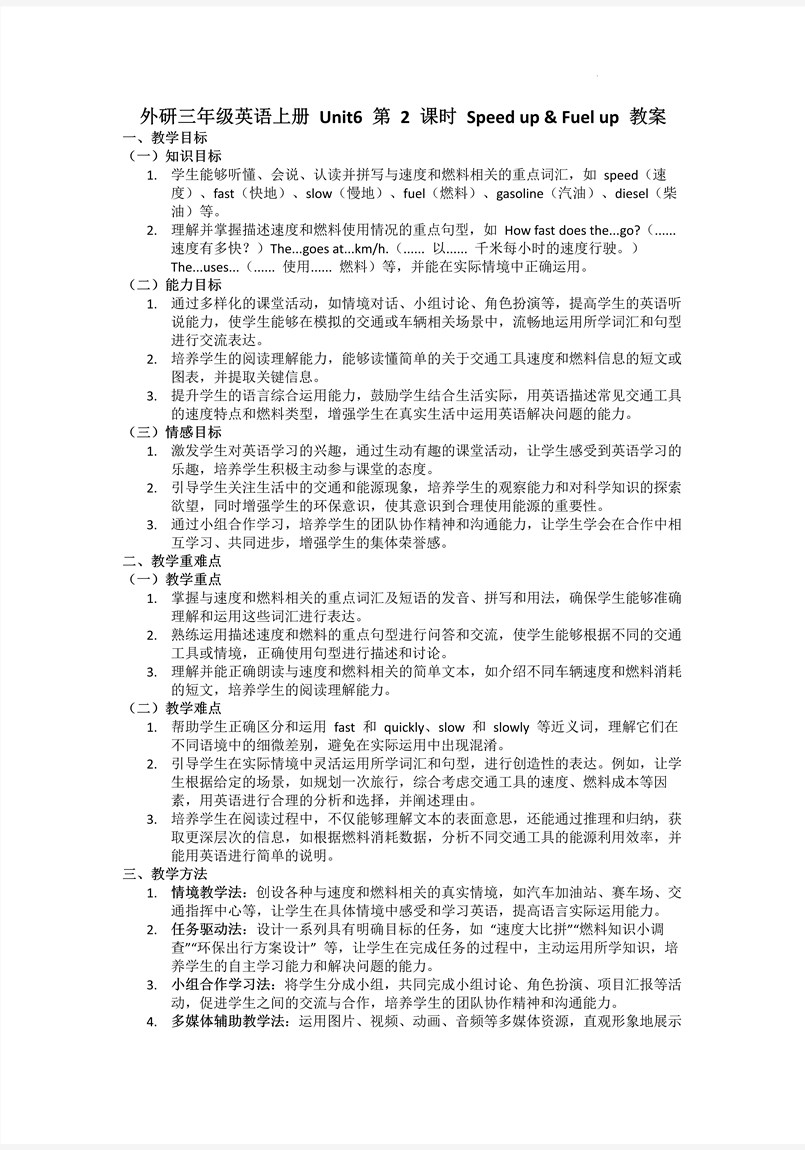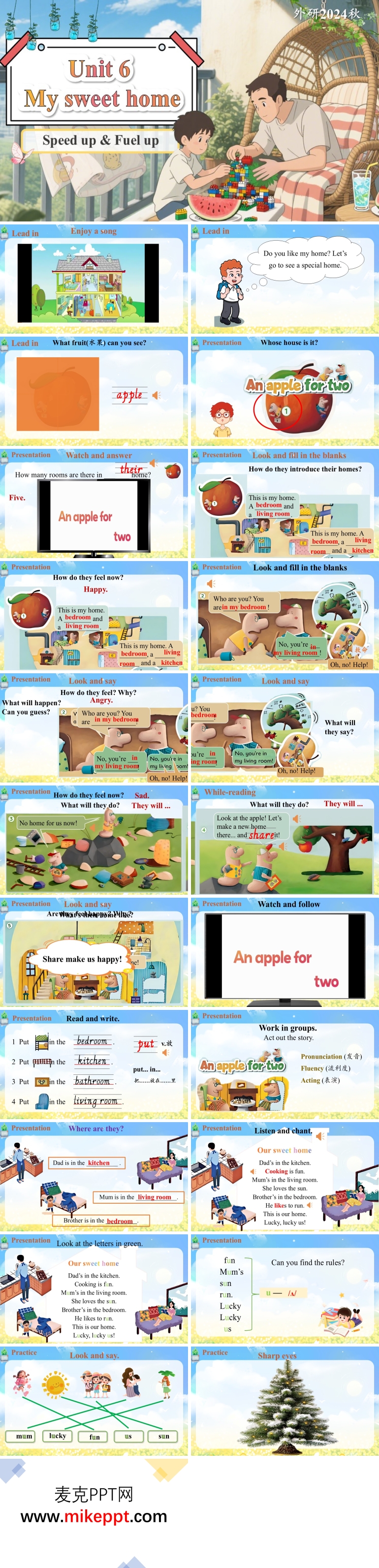 这套为外研社三年级英语上册 Unit 6 第二课时“Spend up & Fuel up”量身定制的 PPT 课件共 32 页,围绕“速度·燃料·生活”这一主题,为学生搭建了一条由“趣味导入—词汇建构—句型操练—语音突破—迁移运用—家庭巩固”六大环节衔接而成的完整学习路径,既关注语言知识,又呵护学习兴趣。 课堂伊始,教师播放一段 15 秒的趣味动画:小汽车在赛道上时而疾驰、时而加油,仪表盘上的 speed 与 fuel 指针随之跳动。动画戛然而止,屏幕上出现“What’s happening?”的提问,瞬间激活学生的前置经验,也自然引出本课核心词汇 speed、fuel、fast、slow、full、empty。紧接着,PPT 切换到“看图填空”任务:学生观察四幅车库场景图,根据提示把缺失的单词拖拽到正确位置,既完成了课本上的练习,又在情境中初步理解词义。 随后进入“口语提升”板块。课件呈现三组对比强烈的图片:一辆高速赛车与一辆慢速拖拉机、一个满油油箱与一个空油油箱、一条笔直公路与一条曲折山路。学生两人一组,用“How fast…? / How much fuel…?” 问答,教师巡回录音并即时投屏点评,帮助他们在真实语境中熟练运用重点句型。 在词汇巩固环节,课件巧妙穿插“房间主题词”小复习:屏幕上依次闪现 bedroom、chicken、bathroom、living room 四张图片,学生需在 5 秒内拼写并大声朗读;系统实时判断正误,红色闪烁提醒错误,绿色勾选奖励正确,既夯实旧知,又为新语音教学蓄势。 紧接着,学生被带往“音标探秘岛”。课件放大红色音标 /ʌ/,配上一段夸张的口型视频:老师读 bus、cup、sun、up,学生跟读并用手势感受下巴开合。随后进行“音标连连看”游戏:左右两栏分别列出单词与音标,学生拖拽匹配,正确连线触发“火箭加油”动画,错误则出现“油量不足”提示,趣味与知识同步升级。 课堂尾声,教师展示“今日任务卡”:1. 完成课本 P36 描述家庭环境和位置的练习题;2. 拍摄家中一间房的小视频,用至少三句话介绍“This is… It’s… There is…”并上传到班级 Padlet。任务卡配有时间轴与星级评价,鼓励学生在家继续“加油”,让所学真正驶进生活的每一个角落。