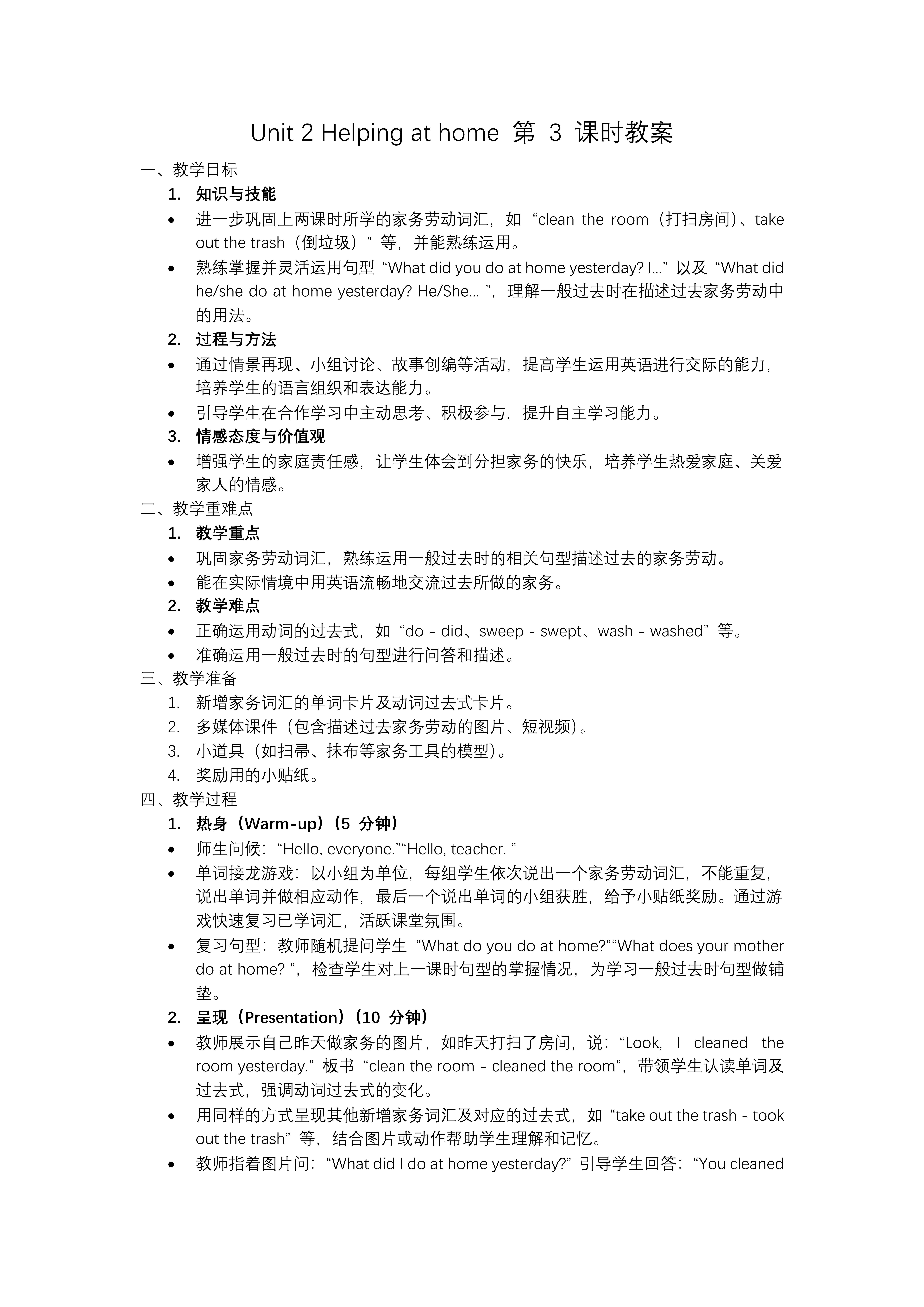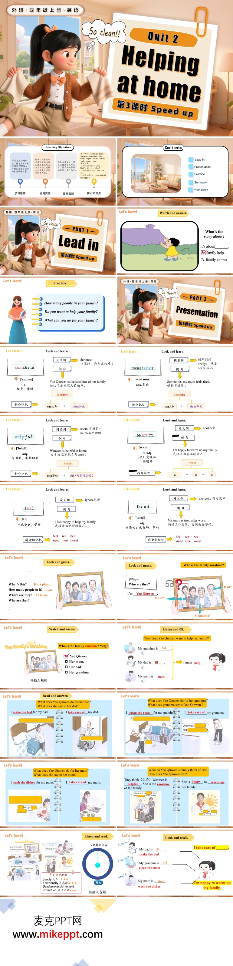 这是一套专为外研版四年级英语上册 Unit 2 第 3 课时 “Speed up” 设计的 PPT,共包含 38 页。本堂课通过多样化的课堂活动,如小组讨论和故事创编等,帮助学生进一步巩固上节课所学的词汇和句型。学生不仅能够熟练运用一般过去时的相关句型描述过去的家务劳动,还能在实际情境中用英语进行交流。此外,教师在教学过程中注重引导学生在合作交流中主动思考,从而有效提升他们的自主学习能力。 PPT 分为五个部分。第一部分是“课堂导入”环节。首先通过播放一段与家务劳动相关的英文视频,吸引学生的注意力并激发他们的学习兴趣。接着,教师引导学生对视频内容进行分析,帮助学生提取关键信息,培养他们的观察和分析能力。最后,通过师生自由交谈,自然过渡到本课的学习内容,为后续教学活动做好铺垫。 第二部分是“知识呈现”环节。这一部分重点呈现上节课所学重点单词和短语的反义词及例句。通过反义词的学习,学生能够更好地理解单词的含义和用法,同时丰富词汇储备。例句的展示则帮助学生在具体语境中理解单词和短语的用法,为后续的语言运用提供支持。 第三部分是“练习与巩固”环节。这一部分设计了《语法填空》和《单项选择》两种练习形式。《语法填空》通过填空的形式,帮助学生巩固一般过去时的语法知识,提升语法运用能力。《单项选择》则通过选择题的形式,检测学生对重点单词、短语和句型的掌握程度,同时培养他们的应试技巧。 第四部分是“知识小结”环节。通过回顾本课所学的重点知识,帮助学生梳理知识脉络,加深记忆。教师通过提问和讨论的形式,鼓励学生总结学习心得,培养自主学习能力。这一环节不仅巩固了学生的知识,还提升了他们的思维能力。 第五部分是“作业布置”环节。作业设计注重巩固课堂所学,同时鼓励学生将所学知识应用到实际生活中。作业包括基础练习、拓展任务和家庭作业,旨在满足不同层次学生的学习需求,帮助他们在课后进一步巩固知识,提升语言能力。 整个 PPT 以“巩固与提升”为主题,通过精心设计的五个环节,逐步引导学生从词汇复习到语法巩固,再到实际应用,形成一个完整的教学闭环。通过小组讨论、故事创编等多种教学活动,学生能够在互动中巩固知识,提升语言运用能力。同时,通过知识小结和作业布置,帮助学生巩固所学,培养自主学习习惯。这套 PPT 不仅注重知识的巩固,更强调学生自主学习能力和语言运用能力的提升,是一套实用性强、教学效果显著的教学资源。