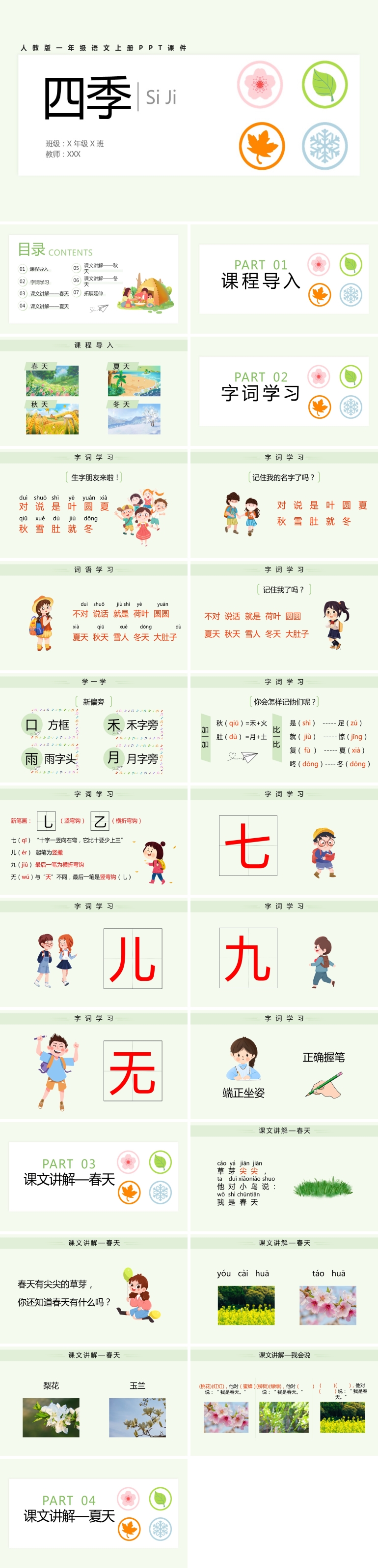PPT模板从七个部分来展开介绍关于语文课文《四季》的教学内容。PPT模板的第一部分通过展示四季的图片来导入课堂。第二部分展示了本节课的生字生词以及其读音。第三部分讲解了文中关于春天的描述内容。第四部分讲解了文中关于夏天的描述内容。第五部分讲解了文中关于秋天的描述内容。第六部分讲解了文中关于冬天的描述内容。第七部分对本节课的内容进行拓展延伸,并展示了相关练习题目。