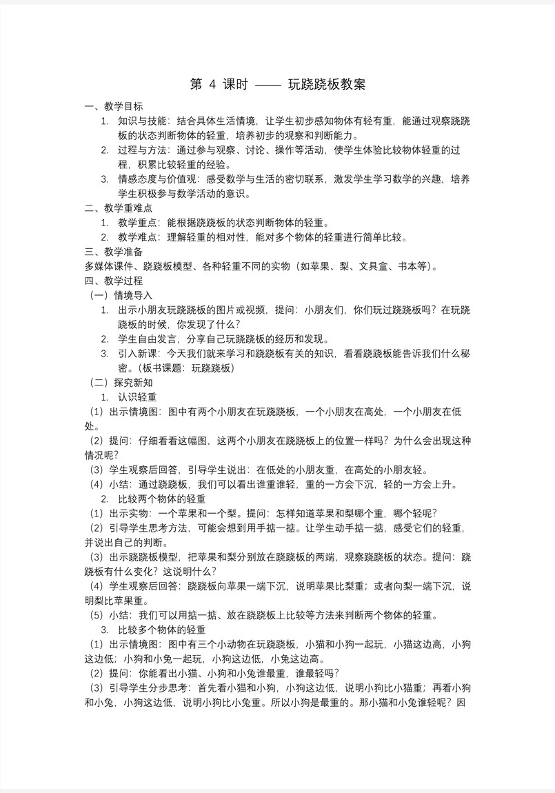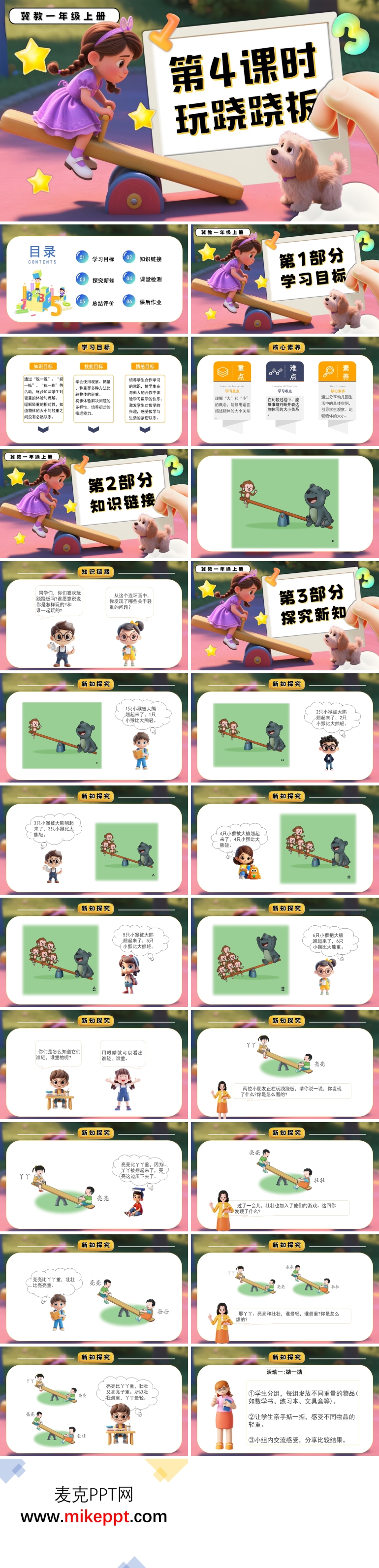 本套《玩跷跷板》PPT课件共34张,以“情境故事—直观体验—语言描述—迁移应用”为主线,带领一年级学生在生动有趣的“跷跷板”世界中,第一次系统感知“轻与重”的数学概念。课件首先用三维学习目标为整节课导航:知识维度,学生要能借助跷跷板的高低状态,判断两个或三个物体的相对轻重,并能用“谁比谁重”“谁比谁轻”等规范语言进行描述;技能维度,通过“看动画—说发现—做实验—玩游戏”的连续活动,培养学生有序观察、合理猜测及初步推理的能力;情感维度,让学生在合作探究中体验猜想被验证的快乐,激发对身边事物的好奇心与科学探究欲望,养成乐于表达、敢于质疑的学习品质。 “知识链接”环节从学生熟悉的游乐场场景切入:伴随着欢快的音乐,卡通小动物们依次登上跷跷板,屏幕定格在“小熊被高高翘起,小兔稳稳落地”的画面。教师顺势提问:“你看到了什么?想到了什么?”激活学生已有经验后,自然引出本节课的核心任务——用数学的眼光研究“轻与重”。 “探究新知”板块分三步推进。第一步“单组比较”:课件动态呈现“小猫 vs 小狗”“小猴 vs 小象”等组合,学生先大胆预测,再观察跷跷板倾斜方向,用“因为……所以……”完整句式说出判断理由;第二步“多组排序”:三只小动物依次坐上同一架跷跷板,学生动手拖动电子贴纸,把动物按从重到轻排队,屏幕即时反馈对错,强化“传递性”思想;第三步“动手验证”:每组学生领取简易纸板跷跷板及若干生活小物(积木、橡皮、回形针),亲自测试、记录并分享“和我的猜测一样吗?”在充分的操作与讨论中,学生体会到“观察—猜想—验证—结论”的科学过程。 “课堂检测”设计了三层练习:第一层“谁是裁判”——看四格漫画判断对错并说明理由;第二层“小小推理家”——根据天平或跷跷板的静止画面,补全缺失的小动物,使其符合轻重逻辑;第三层“生活大发现”——投影展示书包、水杯、苹果等实物照片,让学生用“掂一掂、比一比、说一说”的方法现场排序,并拍照上传班级互动墙,实现知识向生活的无缝迁移。 “总结评价”环节采用“星星奖章”即时反馈:学生先在“跷跷板小护照”上给自己贴星——观察星、表达星、合作星、创意星,再邀请同伴补充点赞;教师则用“魔法转盘”随机抽取学生,复述今天的收获与疑惑,形成全班共享的“轻重知识锦囊”。 课后作业分梯度布置:A级“家庭跷跷板”——与父母自制简易杠杆,比较家中小物的轻重并拍照记录;B级“绘本小作家”——把今天的小动物故事续编成四格漫画,要求用上“轻、重、最轻、最重”四个关键词;C级“科学小达人”——查阅资料了解“天平、台秤、电子秤”的工作原理,下节课带来实物或图片与大家分享。整节课让学生在“玩”中思、在思中悟、在悟中用,让“轻与重”的数学种子悄然扎根于童心,为后续质量单位、测量及数据分析的学习奠定鲜活而扎实的经验基础。