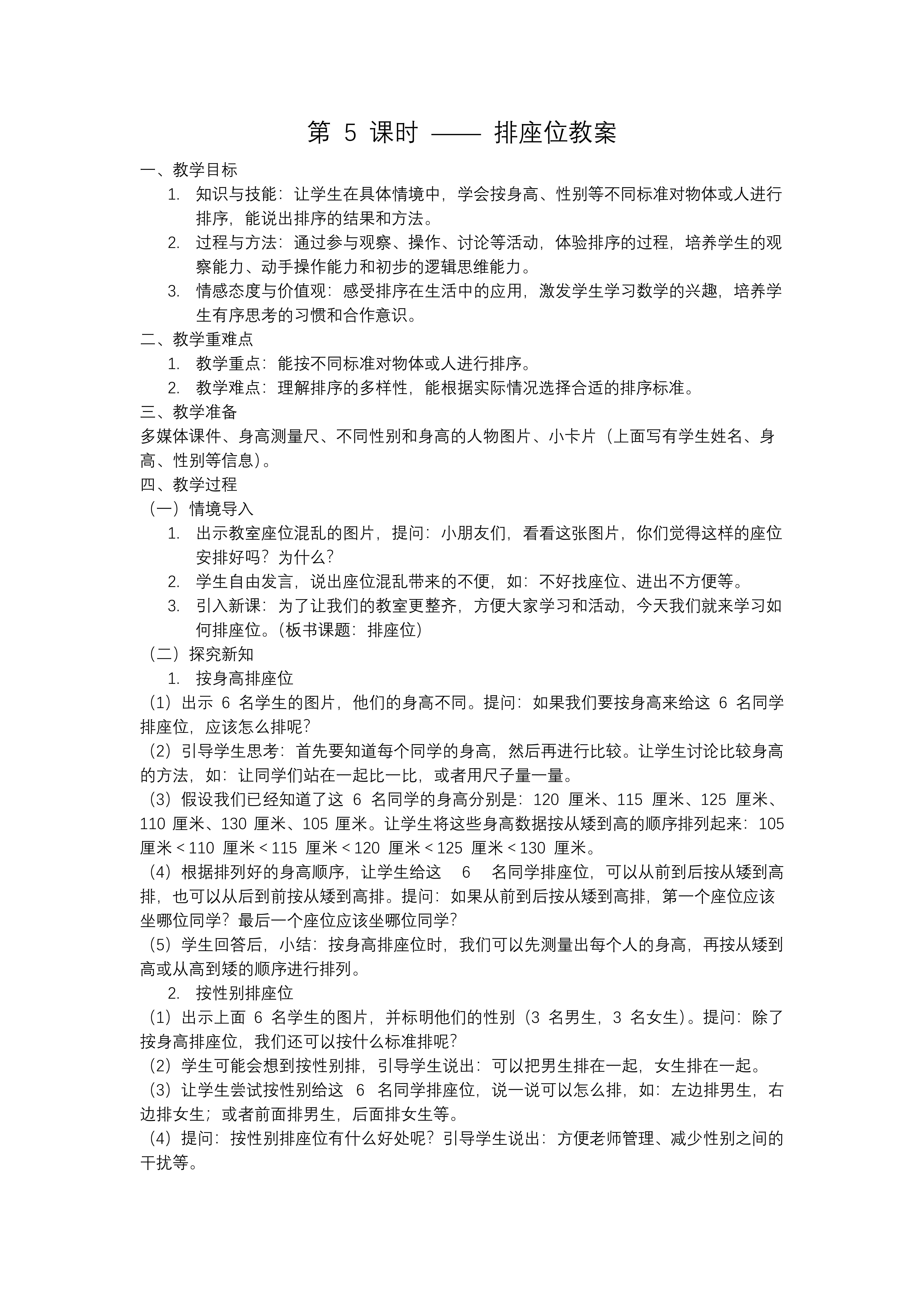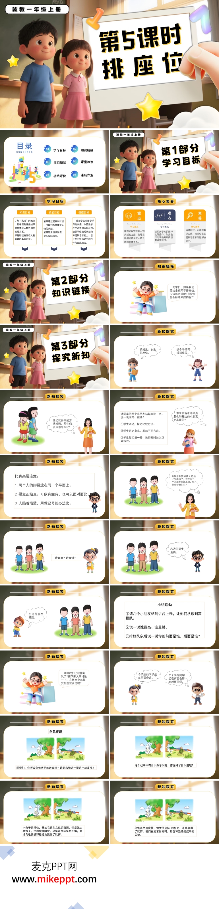 这套题为《排座位》的PPT课件共33张,以“真实任务驱动—多元标准建构—合作实践反思”为逻辑脉络,引导一年级学生在“给全班排座位”的大情境中,第一次系统地经历“排序”这一数学活动的完整过程。课件伊始便以三维学习目标为统领:知识维度,学生要能结合真实场景,理解并能运用“从高到矮、从矮到高;男生在前、女生在后;按学号、按小组”等不同标准对人或物品进行排序,会用“第一、第二……最后”等序数词清晰表达结果;技能维度,通过“观察—比较—记录—调整”的链式操作,发展学生的有序观察、动手实践与初步逻辑推理能力;情感维度,在小组协商、全班分享的民主氛围中,培养学生尊重规则、乐于合作、敢于表达的良好品质,体会“有序”带来的高效与美感。 “知识链接”环节以问题串点燃思考:“如果明天来了一位新班主任,他最想了解什么?”“怎样让全班同学快速而公平地坐好?”学生纷纷提出“按个子高矮”“按男女”“按早操队伍”等想法,教师及时板书并追问“为什么这样排?”自然引出本课主题——“排座位的学问”。 “探究新知”板块分三步展开。第一步“标准大讨论”:课件播放课前拍摄的班级合影,学生用电子笔圈画信息,发现“个子差异明显”“男生女生人数接近”等线索,师生共同确定“先按身高,再微调性别”的复合标准。第二步“现场来排队”:学生分组领取彩色姓名贴,先在桌面上用“小纸片排队”模拟,再到教室前方实地站位,教师用手机实时拍摄并同步上传大屏,出现争议时,引导学生用“比一比、量一量、说一说”的方式协商解决,体验“标准统一、结果唯一;标准不同、序列可变”的数学本质。第三步“符号来记录”:回到座位,学生在表格中用箭头、数字、色块记录排序结果,并尝试把“身高顺序”和“性别标记”合并成一条双色条形图,初识二维排序的雏形。 “课堂检测”设计了三层练习:基础层“小火车快快排”——拖拽动画人物按指定标准排队;进阶层“文具总动员”——对铅笔、橡皮、尺子等实物进行“先长短后颜色”的二重排序,拍照上传互评;拓展层“校园小向导”——给出操场示意图,请学生为“家长开放日”设计一条从校门到教室的参观路线,要求兼顾“从低到高”“先女生后男生”的双重规则,培养综合应用意识。 “总结评价”环节采用“排序明星卡”:学生自评“我会选标准、我会说清楚、我会听意见”三项达成度,同伴再送“合作星”“创意星”。教师用“魔法相机”随机回放课堂精彩瞬间,引导学生用“我印象最深的是……因为……”句式分享,共同完成“排序小窍门”思维导图:先定标准→再作比较→最后记录→必要时调整。 课后作业分梯度:A级“家庭小管家”——与家长一起整理书架,先按“高矮”再按“颜色”给图书双重排序,拍照记录;B级“快乐导演”——拍摄一段30秒小视频,展示为玩具排队的创意方法;C级“未来设计师”——用废旧纸盒制作可旋转的“身高转盘”,帮助家人快速排队,下周数学课带来展示。整节课让学生在真实、亲切、充满挑战的“排座位”任务中,感受标准的力量、体验有序的美妙,悄然播下逻辑思维与规则意识的种子。