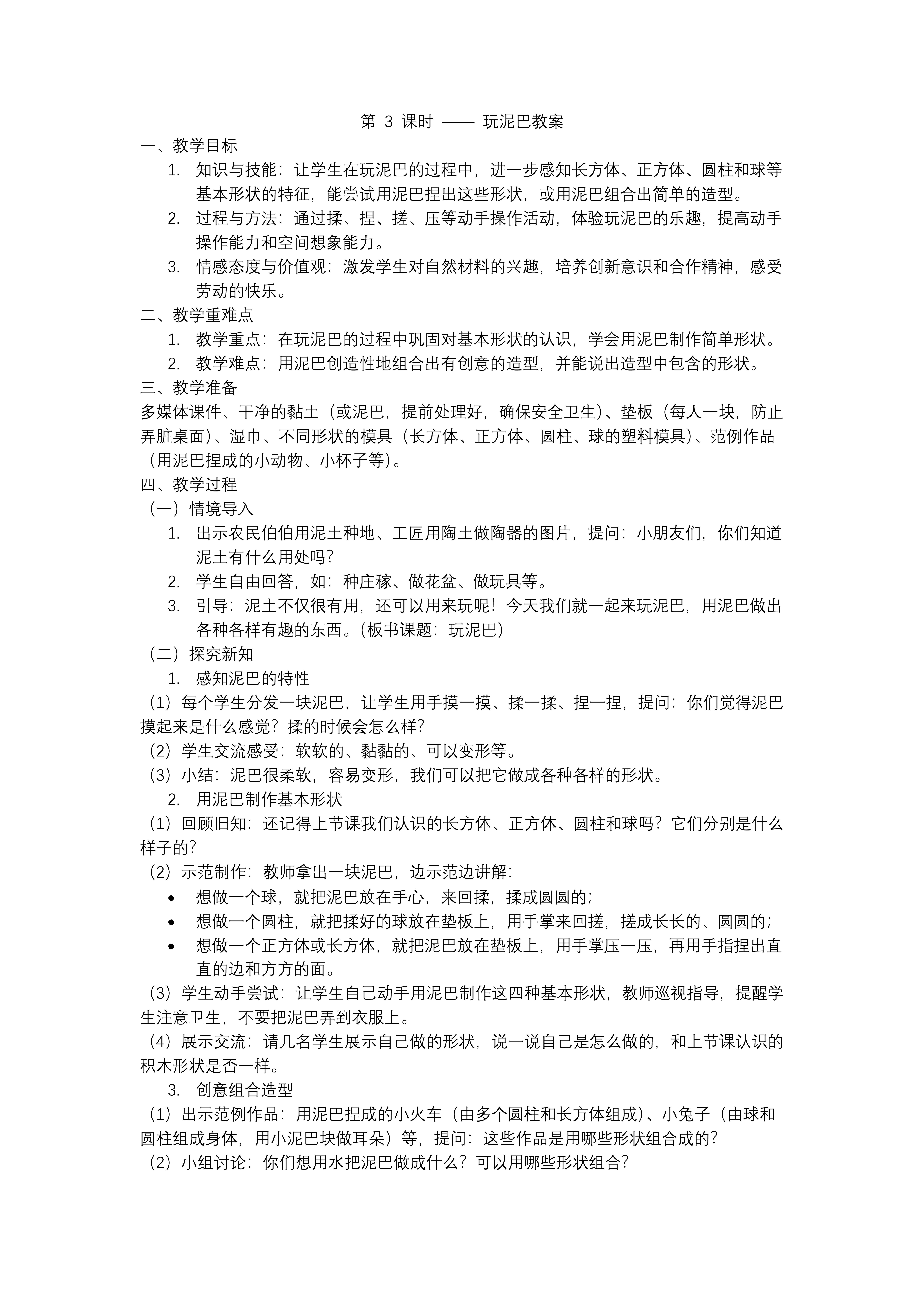 这套题为《2.3 玩泥巴》的一年级 PPT 课件共 28 张,以“亲近自然—手脑并用—创意表达—合作分享”为设计主线,把数学课堂搬到“泥土工坊”,让学生在真实的触摸、嗅闻、捏塑中,把长方体、正方体、圆柱、球等立体图形的抽象概念揉进软软的泥巴里。课件首页用“三级目标”为这趟泥香之旅导航:知识维度,学生要能借助泥巴模型说出立体图形的名称与核心特征,如“长长的长方体六个面都是长方形”“圆柱上下一样粗”等;技能维度,通过“团、压、搓、切、粘”等泥塑动作,发展精细动作、空间想象与观察比较能力;情感维度,在与同伴共用一块泥巴、共享一套工具的过程中,学会协商、轮流、互助,体验“自然材料+数学创意”带来的惊喜与成就。 “探究新知”环节分为三步推进。第一步“泥巴初体验”:教师播放 10 秒短视频——雨后的操场边,孩子们挖出湿润的黄泥,屏幕定格特写“泥巴像巧克力酱”,提问“泥巴能做什么?”激活生活经验后,老师示范安全取泥、加水调泥、桌面铺板三步法,强调“湿而不粘、软而不塌”的泥性标准。第二步“图形变变变”:每组领取一张“立体图形任务卡”,要求用泥巴分别捏出指定的长方体、正方体、圆柱和球。为了让形状更精确,学生借助塑料刀切出平面、用吸管戳出圆孔、用细绳勒出棱角,教师实时抓拍“圆柱歪了怎么办”“球滚走如何固定”等真实问题,投屏讨论,引导孩子发现“圆柱上下要一样粗”“球没有平面”的数学本质。第三步“创意泥哨秀”:在掌握基本立体形状后,教师示范“圆柱泥哨”的做法——把圆柱一端压扁切口做吹嘴,另一端挖空做音腔,再插上小圆球当装饰。孩子们自由组合图形,给泥哨加上长方体底座或正方体手柄,完成作品后统一晾晒,形成“泥巴立体图形博物馆”。 “课堂检测”采用游戏化方式。第一关“图形蹲”——老师随机举起一块泥巴模型,学生快速喊出名称并做出相应手势;第二关“找不同”——投影展示两张“泥巴聚会”照片,学生在 10 秒内圈出形状错误的作品;第三关“小小解说员”——每组派一名代表,用“数学语言”介绍本组最得意的一件泥哨,要求说出用到了哪些立体图形及其特征,同伴则用点赞贴为其打分。 “总结评价”阶段,学生把湿手在“泥点签到墙”上按下手印,围坐成圈,用“一句话接龙”回顾今天学到的知识和技巧;教师根据观察记录颁发“泥塑小巧手”“合作小明星”“创意小达人”三类奖章,并把优秀作品拍照上传学校公众号,让家长共享成长喜悦。 课后作业延续泥土芬芳:A 级“自然观察员”——在小区或乡村寻找三种不同颜色的泥土,记录颜色、气味和手感差异;B 级“家庭小工坊”——与家长合作完成一件“泥巴立体笔筒”,要求至少用到长方体、圆柱两种图形;C 级“故事小主播”——给泥哨写一张“出生证”,注明形状、用途和创意灵感,下节数学课带来展示。整节课让学生在泥土的清香与指尖的温度中,把数学图形从课本搬到掌心,从掌心延伸到生活,真正实现了“做中学、玩中悟、悟中创”。