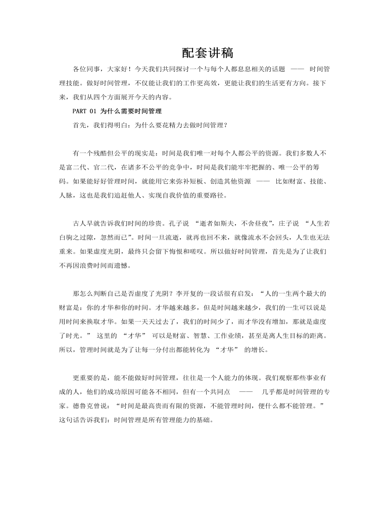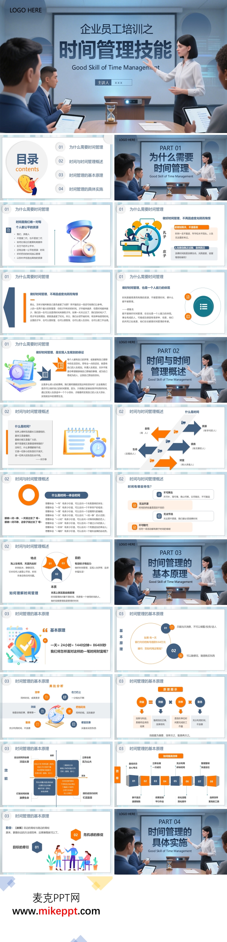 这是一套精心设计的时间管理技能培训PPT课件,共包含31张幻灯片。该课件旨在帮助学员掌握时间管理的技能,提升工作效率,优化生活品质。通过系统的讲解和实用的方法,学员可以更好地理解时间管理的重要性,并将其应用于实际生活中。 课件从四个方面展开时间管理技能培训的内容。第一部分是“为什么需要时间管理”,这部分着重阐述了时间管理的重要意义。通过引用孔子、庄子等古代智者的话语,引导学员深刻认识到时间的宝贵,避免因虚度光阴而后悔。古人云:“逝者如斯夫,不舍昼夜”,时间一旦流逝,便无法挽回。因此,学会管理时间,就是学会掌控自己的生活和未来。 第二部分是“时间与时间管理概述”,这部分详细介绍了时间和时间管理的定义,并深入探讨了时间的特性。时间具有不可再生性,一旦过去就无法重来;时间无法开源,每天只有24小时,无法增加;时间无法节流,无论我们如何节省,时间依然以固定的速度流逝;时间具有不可取代性,没有任何事物能够替代时间的价值。通过这些特性,学员可以更清晰地认识到合理管理时间的必要性。 第三部分是“时间管理的基本原理”,这部分指出时间管理的最终目标是追求效果与利益的最大化。时间管理不仅仅是安排日程,更是通过合理规划,确保每一分钟都能发挥最大的价值。通过优先处理重要且紧急的任务,合理安排时间和精力,学员可以提高工作效率,减少拖延,从而实现个人和职业目标。 第四部分是“时间管理的具体实施”,这部分提供了实用的时间管理方法。首先,学员需要制定事项清单,将每天需要完成的任务逐一列出。然后,按照重要性和紧急程度对事项进行排序,合理安排实施顺序。完成任务后,每天晚上进行回顾总结,反思当天的时间管理效果,找出不足之处并加以改进。通过这种循环往复的过程,学员可以不断提升自己的时间管理能力,逐步养成良好的时间管理习惯。 这套PPT课件内容丰富、结构清晰,既有理论知识的讲解,又有实用方法的指导。通过学习,学员不仅可以理解时间管理的重要性和基本原理,还能掌握具体的操作方法,从而在实际生活中更好地管理时间,提升生活和工作的质量。