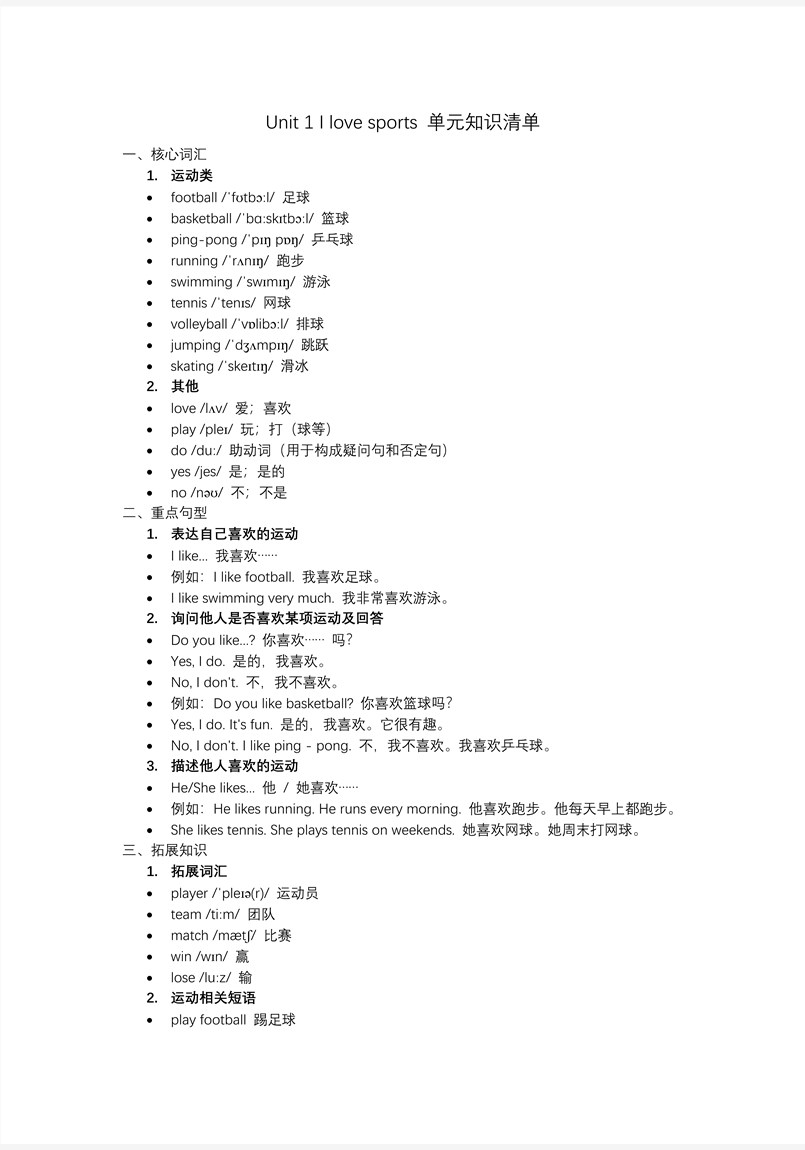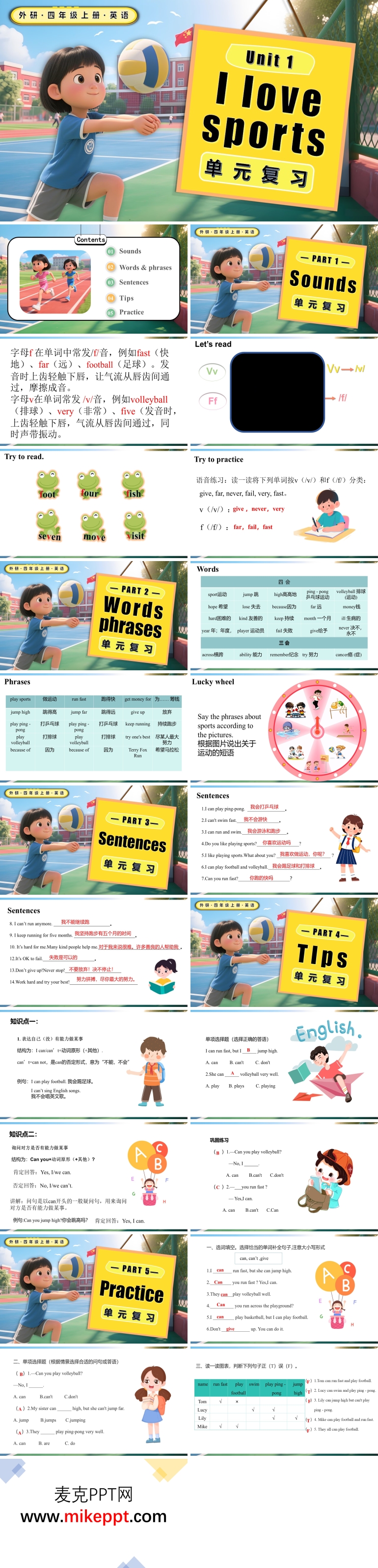 以下是一套专为外研版四年级英语上册Unit 1 “I love sports”复习课设计的演示文稿,共包含26张幻灯片。通过本节课的学习,学生将收获颇丰。他们不仅能熟练掌握本单元的核心词汇,尤其是运动类单词,还能运用重点句型回答与运动相关的问题,并学会表达自己及描述他人喜爱的运动。此外,本节课还注重学生的自我认知,引导他们了解自己的兴趣爱好,同时通过介绍不同国家受欢迎的运动,拓宽学生对世界文化的视野,培养他们的跨文化意识。 这份演示文稿精心设计了五个部分。第一部分聚焦于单词发音规则,通过播放视频的方式,引导学生观察、模仿并掌握单词的读音规则,帮助学生从根本上提升发音能力,为后续学习打下坚实基础。第二部分是重点单词和短语的学习。首先以表格形式清晰呈现本单元的重点词汇,方便学生对比和记忆;接着展示重点短语,通过例句帮助学生理解其用法;最后通过趣味词汇操练游戏,激发学生的学习兴趣,巩固词汇记忆。 第三部分围绕重点句型展开,主要通过句子翻译的方式,引导学生在理解的基础上掌握重点句子的结构和用法,提升学生的语言运用能力。第四部分则是重点语法点的讲解,通过简洁明了的讲解和实例分析,帮助学生梳理语法知识,加深对语法的理解和应用。 第五部分是练习与巩固环节,设计了多样化的练习题,包括填空、选择、问答等题型,帮助学生巩固所学知识,查漏补缺,确保学生能够熟练运用本单元的核心内容。通过本节课的学习,学生不仅能够提升英语语言能力,还能在情感和文化层面获得丰富的收获,实现知识与能力的全面发展。
