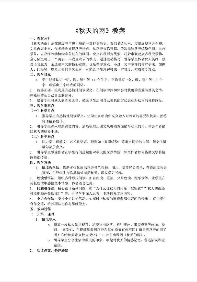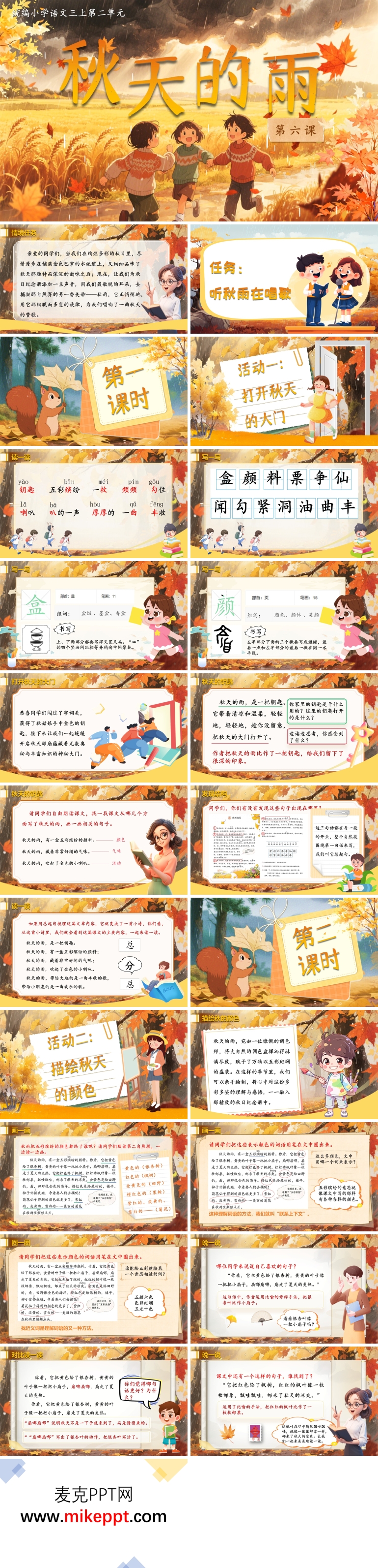 这套为部编版语文三年级上册《秋天的雨》量身打造的PPT课件共37页,以“秋之雨,秋之韵”为情感主线,用“情境任务—识字悟义—品色诵文—合作探究—拓展升华”四级阶梯,层层递进,引导学生在听、说、读、写、思、演的多元活动中,浸入式感受秋雨之美,体悟语言之妙,最终生成对自然与生命的细腻关怀。 开篇“情境任务”环节,先播放一段轻柔的秋雨声效,屏幕上同步出现雨丝滑落树叶、小径晕开水墨的动态画面,教师轻声提问:“你听见秋雨在唱什么歌?”学生在闭眼聆听中唤醒生活经验,带着好奇走进文本。随后“听秋雨在唱歌”任务单发放,要求用象声词记录听到的雨声,为后续朗读奠定情感基调。 进入“活动一:打开秋天的大门”,课件分两路并进:一路是“读一读”,借助高清田字格动画,重点指导“钥、匙、缤、扇、枚”等生字笔顺,学生书空、描红、互评;一路是“想一想”,教师将“钥匙”一词放大呈现,引导学生讨论“秋雨为什么是钥匙?它打开了谁的大门?”在图文对照中,学生初步感知秋雨的象征意味——它为大地启封,开启了色彩与丰收的盛宴。 “活动二:描绘秋天的颜色”聚焦课文第二自然段。学生用电子笔圈画“黄色、红色、金黄色、橙红色、紫红、淡黄、雪白”等颜色词,屏幕即时生成一条彩虹色带,直观呈现“五彩缤纷”。接着教师出示比喻句“黄黄的叶子像一把把小扇子”,引导学生用拖拽功能把图片(叶子、扇子、邮票、蝴蝶)与对应句子配对,再借助“句型魔盒”进行仿写练习:“像,________。”配乐朗读环节,轻柔的钢琴与雨声交织,学生打着节拍背诵,文字与旋律共融,记忆悄然扎根。 “活动三:金色的喇叭吹起来”采用四人小组合作模式。任务一“闻秋味”:学生点击屏幕上的果树图标,弹出“梨香、苹果甜、橘子酸”等气味词,组内闭眼想象并用一句话描述;任务二“动物过冬”:观看松鼠储粮、青蛙挖洞的微视频,补全句式“秋雨吹起金色的小喇叭,它告诉大家________。”随后各组用思维导图整理“秋雨带来的五种讯息”,并派代表上台用“小喇叭”道具进行角色播报,课堂瞬间成为秋日广播站。拓展阅读链接《听听,秋的声音》节选,学生对比两篇文本在声音、色彩、情感上的异同,最后以“秋雨是一首诗,一首________的歌”完成课堂小结,将感受凝练成诗性语言。 整份课件37页张弛有度,既关注字词书写的精准,又呵护审美体验的丰盈;既有独立静思,也有合作碰撞;既立足文本,又伸向生活。秋雨不再只是自然现象,而是打开孩子心灵的一把金钥匙,让他们在语言与自然的双重润泽中,学会观察、想象、表达与共情。
