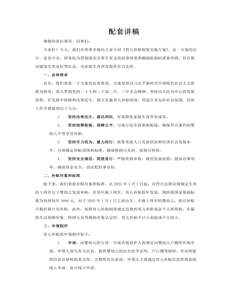 这套用于介绍《育儿补贴制度实施方案》的 PPT 模板,以 25 页的内容篇幅,搭建起一套涵盖政策全流程的清晰解读框架,六个核心章节环环相扣,构建了从顶层设计到落地执行的完整体系,充分展现了国家推动生育友好型社会建设的系统性部署。 第一章 “总体要求” 作为政策的纲领性部分,鲜明确立了以人民为中心的发展思想,将其贯穿于政策设计的始终。同时,明确提出降低生育成本、保障政策公平可持续等核心原则,为后续各项具体措施划定了方向和边界,让整个方案的制定有了坚实的思想基础和价值遵循。 第二章 “补贴对象和标准” 聚焦政策的核心受益群体与具体额度,作出了明确规定。自 2025 年起,3 岁以下婴幼儿将成为补贴发放的对象,每孩每年 3600 元的基础标准清晰可查,同时还配套了相应的税收优惠政策,从经济支持层面切实为家庭减轻养育负担,让政策红利直接惠及目标群体。 第三章 “申领程序” 致力于为群众提供便捷高效的办事指引,系统梳理了从线上平台或线下窗口提交申请,到经过社区、街道、区级部门三级审核确认的完整流程。尤其强调了对信息真实性的严格核查,既保障了符合条件的家庭能顺利申领,也维护了政策执行的严肃性。 第四章 “资金来源和补贴发放” 解决了政策实施的 “钱从哪里来” 和 “如何发下去” 的关键问题。明确划分了中央与地方财政的分担比例,确保资金来源稳定可靠;在发放渠道上,规范要求通过 “一卡通” 等便捷方式进行,保障补贴精准、及时地到达家庭手中。 第五章 “管理和监督” 为政策的规范运行保驾护航。重点介绍了全国统一信息管理系统的建设情况,通过信息化手段提升管理效率和精准度;同时构建了审计、纪检监察等多部门协同的监督机制,形成全方位的监管网络,严防违规行为,确保资金安全和政策公正执行。 第六章 “加强组织实施” 从落地执行层面作出部署,从省级统筹协调、与现有相关政策的有效衔接,到加强宣传引导优化服务等三个维度,提出了具体的落实措施,为政策的平稳落地和有效推进提供了有力的组织保障,确保各项制度安排能够真正转化为惠及民生的实际成效。 整套方案通过六个章节的系统设计,形成了从政策理念到执行监督的完整闭环,全面展现了国家在构建生育友好型社会进程中的制度创新与责任担当。