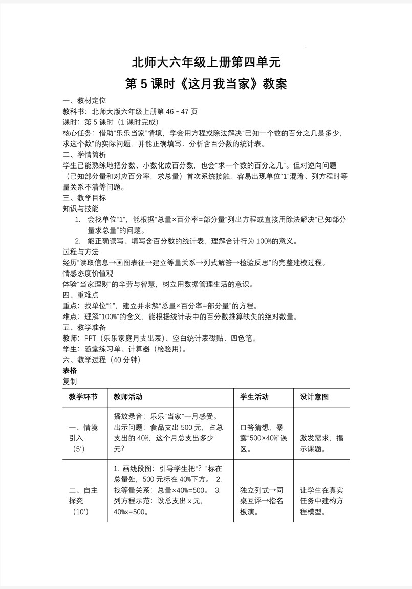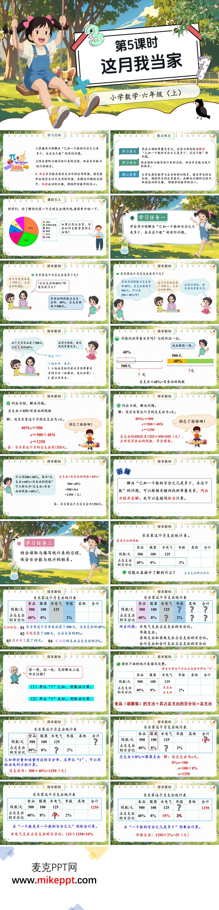这是一套为北师大版数学六年级上册第四单元第5课时“这月我当家”设计的PPT课件,共44张幻灯片。本课件旨在帮助学生掌握“已知部分量求总量”的解题方法,特别是通过百分数的应用。学生将学会在问题中识别单位“1”,并利用“总量×百分率=部分量”的关系,通过列方程或直接用除法来解决实际问题。通过本节课的学习,学生将经历从读取信息、画图表征、建立等量关系到列式解答和检验反思的完整建模过程,从而树立数据管理生活的意识。 课件内容分为三个主要部分。第一部分“用方程解决实际问题”,通过家庭月总支出的情境引入,帮助学生找到单位“1”。例如,家庭总支出为单位“1”,食品支出占总支出的30%。学生将通过画图、类比等方法,尝试寻找等量关系。例如,如果食品支出为300元,占总支出的30%,那么总支出是多少?学生将学会根据等量关系列出方程,如 0.30×总支出=300,并求解总支出。通过多个实际问题的练习,学生将增强应用能力。 第二部分“体会百分数与统计的联系”,结合读取与填写统计表的过程,帮助学生理解百分数在统计中的应用。通过家庭支出统计表,学生将读取和填写数据,计算各项支出占总支出的百分比,进一步理解百分数的意义。通过实际问题,学生将体会百分数在数据分析和决策中的作用,如根据支出百分比调整家庭预算。 第三部分“达标练习与知识巩固”,通过一系列基础和拓展练习题,帮助学生巩固“已知部分量求总量”的解题方法。练习题涵盖从基础计算到实际应用的多个层面,旨在帮助学生进一步熟练掌握所学知识,提高他们的解题能力和应用能力。通过练习,学生将能够更加自信地运用百分数进行数据分析和决策。 整套PPT课件设计注重学生的主动参与和实践操作。通过情境引入、直观探索、实例讲解和练习巩固的有机结合,学生将在实践中逐步掌握百分数的应用方法,发展他们的数学思维和应用意识。同时,本课还将引导学生关注数据管理,体会数学在日常生活中的实际价值。