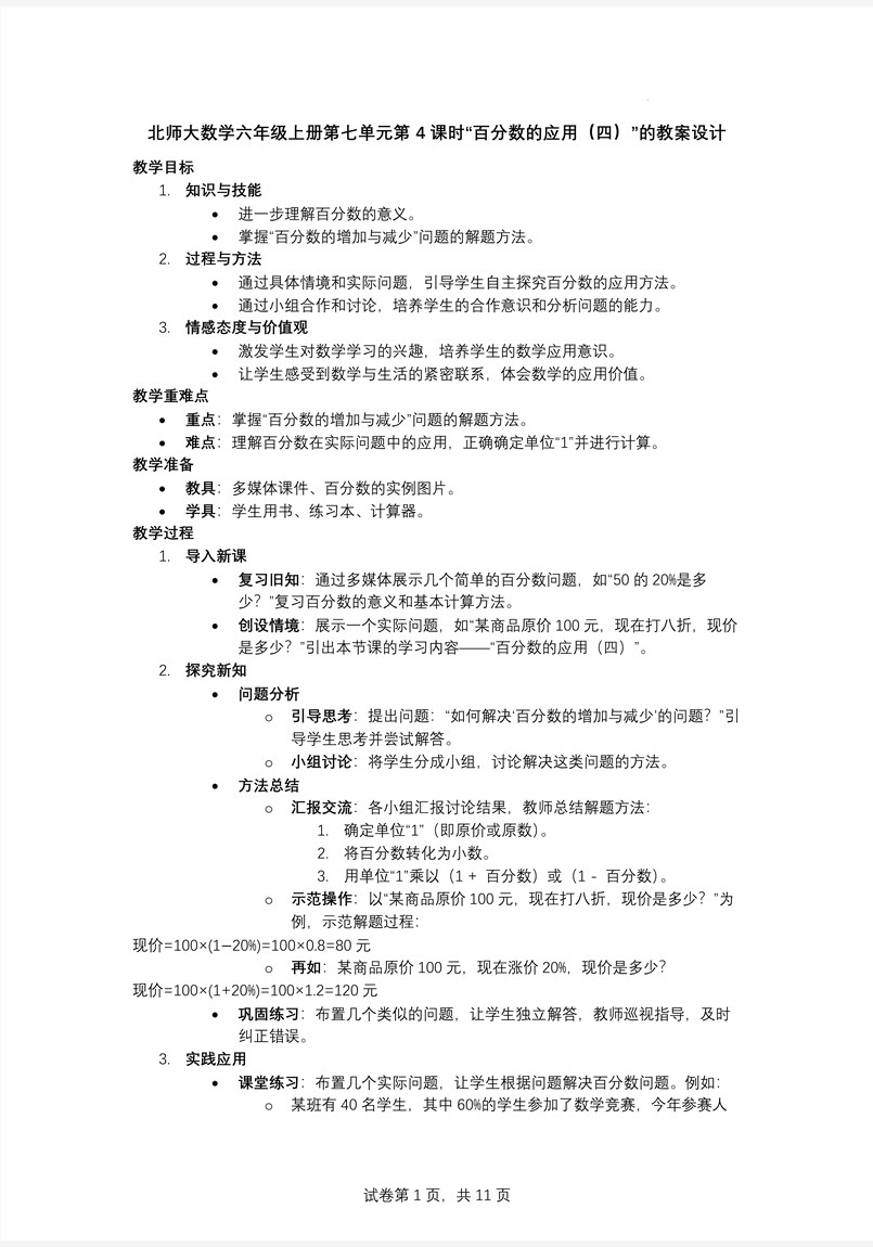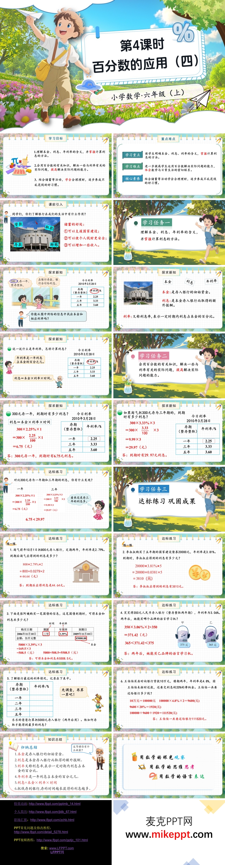 这套为北师大版六年级上册第七单元第4课时《百分数的应用(四)》量身定制的PPT课件模板共21页,围绕“金融里的百分数”这一主题,按照“目标—难点—探究—实践—提升”五个层层递进的板块展开,力求把抽象的百分数运算与真实的理财场景深度结合,让学生在解决实际问题的过程中自然习得金融数学知识。 开篇“学习目标”板块用简洁清晰的语言提出双重任务:知识层面要求学生准确理解本金、利息、利率三大核心概念,并能熟练运用“利息=本金×利率×时间”这一基本公式完成计算;能力层面则强调在银行存款、国债购买、贷款还款等真实情境中灵活运用所学,初步树立科学理财意识。 随后“重点难点”板块再次聚焦:将“利息的准确计算”确立为本课时的知识重点,把“用数学语言描述并解决实际金融问题”确定为能力难点,同时反复渗透“合理规划、风险意识”的理财观,引导学生用数学眼光审视日常经济活动。 进入“探求新知”板块,课件以“小明的压岁钱怎么存最划算”这一贴近生活的案例贯穿始终。教师先出示银行一年期与三年期定期存款的利率表,引导学生认识“年利率”“存期”对利息的影响;接着借助条形图动态演示不同存期的利息差异,让学生在比较中理解“时间越长,利息越多,但流动性降低”的理财权衡;最后归纳出通用公式,并特别提醒“本息合计=本金+利息”这一易错点。 “达标练习”板块设置了6组情境化任务:①计算1万元定期一年与三年的利息差;②比较购买三年期国债与同期定存的收益;③模拟贷款1万元分12个月等额还款的利息支出;④设计“压岁钱增值”最优存款方案;⑤根据通胀率评估实际收益;⑥为家庭旅行基金制订短中长期储蓄组合。每道题都配有“审题—建模—计算—反思”四步提示,帮助学生把课堂知识迁移到更宽广的金融实践中。 最后的“知识总结”板块用思维导图形式,把本金、利息、利率、时间、本息、年利率、月利率等关键概念及其关系一网打尽,并再次强化“利息=本金×利率×时间”的核心公式。学生在口头复述、同桌互评中完成知识固化,并带着“如何让钱生钱”的开放性问题走出课堂,实现数学知识、理财意识与综合素养的同步提升。