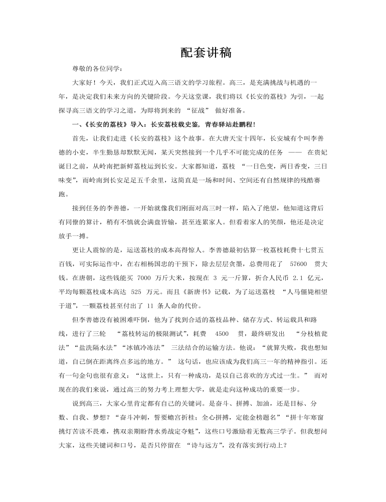 这套以 “一骑红尘起星辰,少年执笔赴青云” 为主题的高三语文秋季开学第一课 PPT 课件,通过 PowerPoint 精心制作,共计 50 张幻灯片,旨在点燃高三学子的学习斗志,明确语文学习的方向与路径。本节课的核心学习目标清晰而坚定:引导学生深刻认识到高三语文学习的重要性,以时不我待的紧迫感加速冲刺,在高考的战场上挥洒笔墨、实现梦想。 第一部分 “《长安的荔枝》的导入”,如同一颗投入湖心的石子,激起学生内心的层层涟漪。PPT 详细讲述了李善德这位唐朝小吏为完成运送新鲜荔枝的艰巨任务,历经千难万险、不断突破自我的故事。从岭南到长安,五千余里的征途上,他面临着荔枝保鲜的时限压力、沿途官场的层层阻碍、自然环境的残酷考验,却始终未曾放弃。课件通过细腻的文字与生动的插图,展现他如何在绝境中寻找方法、在失败中总结经验,最终创造奇迹。这不仅让学生沉浸在跌宕起伏的历史故事中,更巧妙地传递出深刻的启示:每个人的潜力都是无限的,正如李善德能突破看似不可能的极限,高三学子也能在学习的征途中挖掘潜能;无论遇到多少困难,办法总比困难多,只要敢于挑战、勇于探索,就能跨越障碍、抵达目标。 第二部分 “妃子笑中观隐喻,书山路上砺锋芒”,将故事与高三复习巧妙关联,实现了从历史到现实的自然过渡。PPT 以《长安的荔枝》中李善德的三轮运荔枝尝试为隐喻,引出高三语文的三轮复习规划。第一轮如同李善德初次尝试,侧重于全面覆盖知识点,夯实基础,就像他最初摸清路线、了解荔枝特性一样,学生需要系统梳理语文课本中的字词句篇、文学常识、阅读技巧等,构建完整的知识体系;第二轮恰似李善德的优化调整,着重于专题突破与能力提升,如同他针对保鲜方法和路线进行改进,学生要针对文言文阅读、现代文鉴赏、写作等重点模块进行专项训练,攻克薄弱环节;第三轮则好比李善德的最终冲刺,聚焦于模拟演练与查漏补缺,像他最后一次精准把控每一个细节确保荔枝新鲜抵达,学生需要通过大量真题模拟,熟悉考试节奏,调整答题策略,全面提升应试能力。这种隐喻式的讲解,让枯燥的复习规划变得生动易懂,让学生在故事的映照下,对三轮复习的意义与内容有了更清晰的认知。 第三部分 “岭南丹荔映卷帙,长安蹄声醒少年”,聚焦于高三语文学习方法的创新与指导,为学生提供切实可行的学习策略。PPT 结合李善德在运送荔枝过程中展现出的智慧 —— 如灵活运用不同的保鲜方法、借助沿途资源解决问题等,引导学生思考如何创新学习方法。课件强调要打破传统的死记硬背模式,倡导在理解的基础上记忆,例如通过思维导图梳理文言文虚词的用法,通过对比阅读分析不同文体的写作特点;鼓励学生将语文学习与生活实际相结合,像从新闻报道中积累作文素材,从影视作品中感受语言的魅力;同时,还介绍了小组合作学习、错题整理技巧、时间管理方法等实用内容,如同为学生配备了一套高效的 “运输工具”,帮助他们在书山文海中更顺利地前行。“长安蹄声” 的意象不断闪现,提醒着学生时间的紧迫,激励他们以清醒的头脑和高效的方法投入学习。 第四部分 “高三语文一日常规”,为学生勾勒出每日学习的清晰蓝图,让努力有章可循。PPT 详细列出了语文学习每天必须完成的任务:清晨的古诗文背诵,如同汲取第一缕阳光,滋养文学素养;课前的基础知识默写,像检查行囊,确保知识点无遗漏;课堂上的专注听讲与积极互动,如同紧跟向导的步伐,把握学习重点;课后的阅读理解训练,好比在文字的丛林中探险,提升分析能力;傍晚的作文素材积累与片段写作,宛如打磨兵器,为写作储备能量;睡前的错题回顾,如同整理一天的收获,巩固学习成果。这些具体而细致的安排,让学生明确每天的学习方向,将宏大的目标分解为日常的行动,在点滴积累中逐步靠近成功。 整套课件以《长安的荔枝》为线索,将历史故事与高三语文学习深度融合,既富有文学韵味,又具备极强的实用性。从激发斗志到规划复习,从方法指导到日常安排,层层递进、环环相扣,让 “一骑红尘起星辰,少年执笔赴青云” 的主题不仅仅是一句豪迈的口号,更成为高三学子语文学习路上的行动指南,激励他们以坚定的信念、科学的方法,执笔奋进,向着理想的彼岸勇往直前。