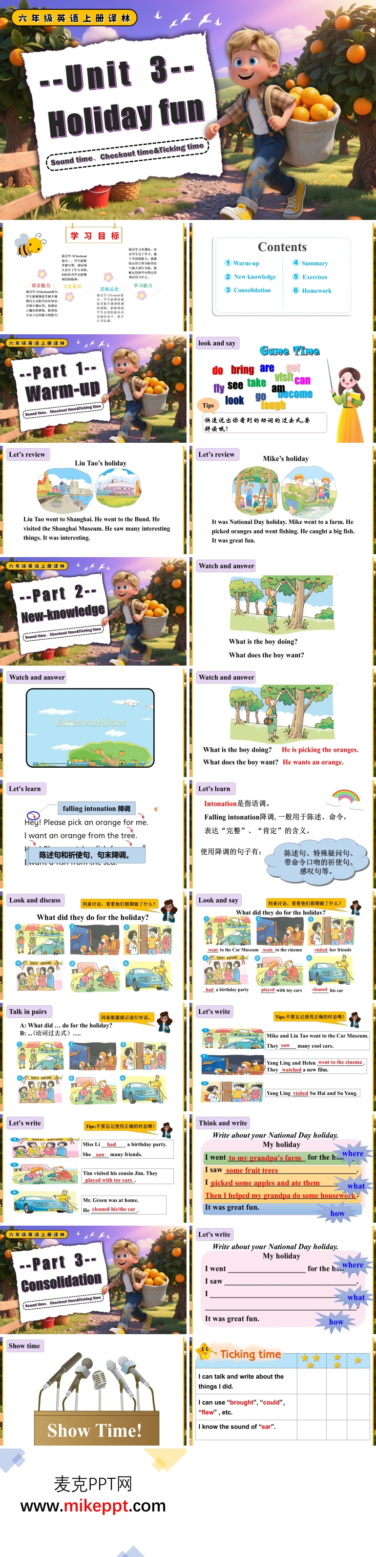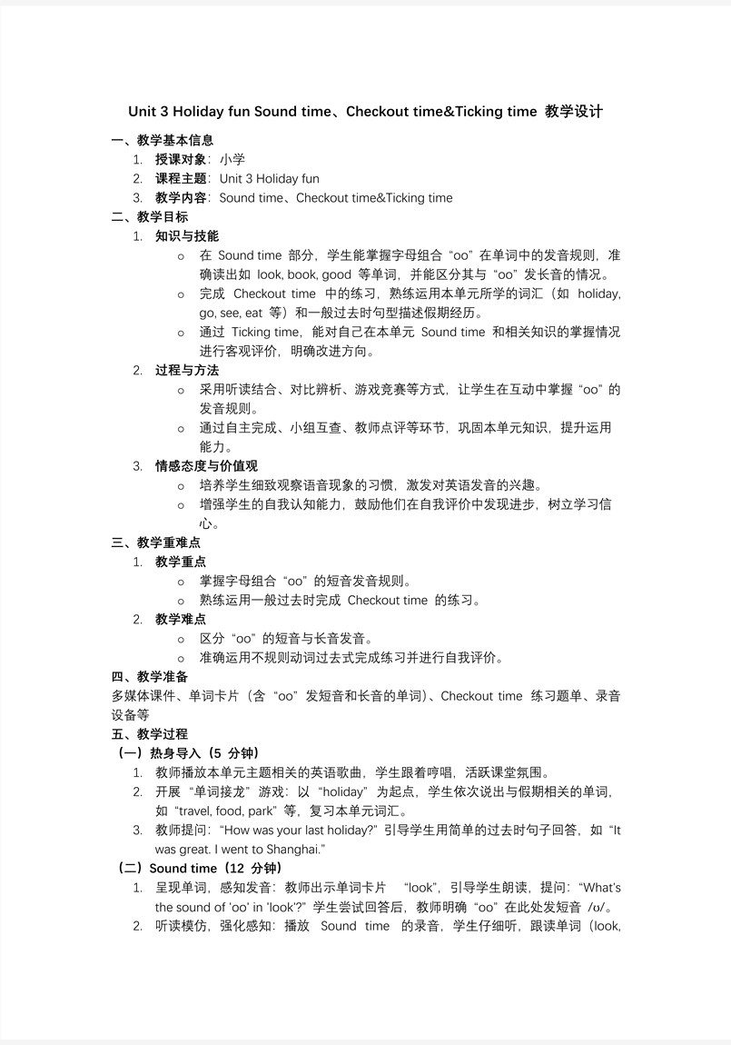 这是一套六年级英语上册译林版 Unit 3 Sound time、Check out time 和 Ticking time 的 PPT 课件,共包含 34 张幻灯片。本节课的学习目标主要是引导学生掌握字母组合 oo 在单词中的发音规则,能够准确读出含有这一组合的单词,并且能够区分 oo 发长音的情况。同时,本节课还旨在引导学生完成课本中的练习,熟练掌握本单元所学的词汇和一般过去时句型,以便能够流利地描述假期的经历。 课件内容介绍 第一部分:Warm up 课件的开篇是 Warm up 环节,旨在通过有趣的游戏和复习活动来激发学生的兴趣,为新知识的学习做好铺垫。在这一部分,教师可以通过设计一些与字母发音相关的游戏,如 “发音接龙” 或 “找朋友” 等,让学生在游戏中复习之前学过的字母组合的发音。此外,还可以通过快速问答的方式,复习本单元的重点词汇和句型,帮助学生快速进入学习状态,为接下来的内容做好准备。 第二部分:New knowledge 接下来是 New knowledge 环节,这是本节课的核心部分。首先,通过播放一段精心挑选的视频,引导学生观察和学习视频中的语音语调。视频内容可以是一段关于假期经历的对话,其中包含多个含有 oo 组合的单词。在观看视频后,教师提出一些与视频内容相关的问题,如 “What did the boy do last summer holiday?”“Where did he go?” 等,引导学生回答问题,同时注意语音语调的模仿。随后,教师对视频中的对话进行详细讲解,重点指出 oo 组合在不同单词中的发音差异,如在 “book” 中发短音 /ʊ/,而在 “food” 中发长音 /uː/。通过对比和举例,帮助学生更好地理解和掌握 oo 组合的发音规则。 第三部分:Consolidation 第三部分是 Consolidation 环节,这一部分通过写作活动来巩固学生对本节课知识点的掌握。教师可以设计一个写作任务,如让学生写一篇关于自己或他人假期经历的小短文,要求学生在写作中运用本节课所学的词汇和句型,特别是含有 oo 组合的单词。在写作过程中,教师可以巡视课堂,给予学生适当的指导和帮助。写作完成后,可以选取一些学生的优秀作品进行展示和点评,让学生在实践中进一步巩固所学知识,提高语言运用能力。 第四部分:Summary 第四部分是 Summary 环节,教师带领学生对本节课所学的内容进行总结。回顾字母组合 oo 在单词中的发音规则,包括短音和长音的发音特点,以及如何在实际语境中正确运用这些发音规则。同时,总结本单元的重点词汇和句型,特别是与一般过去时相关的内容,如 “visited”“went”“did” 等。通过总结,帮助学生梳理知识脉络,加深对重点知识的记忆,使学生对本节课的内容有一个清晰的、系统的认识。 第五部分:Exercise 第五部分是 Exercise 环节,设计了一系列与本节课内容相关的练习题。这些练习题包括选择题、填空题、语音练习题等多种类型。例如,语音练习题可以要求学生根据发音规则,将单词归类到正确的发音组别中;填空题可以考查学生在具体语境中运用一般过去时句型的能力。通过这些练习,学生可以在不同的情境中运用所学的语音知识和语法知识,进一步巩固和加深对本节课内容的理解和掌握。教师可以根据学生的练习情况,及时发现学生存在的问题,并进行针对性的指导和讲解,从而提高教学效果。 第六部分:Homework 最后是 Homework 环节,教师布置了适量的课后作业,以巩固课堂所学知识。作业内容可以包括抄写含有 oo 组合的单词,背诵本单元的重点句型,以及完成一些与语音和语法相关的练习题。此外,还可以布置一个口语作业,如让学生录制一段自己描述假期经历的小视频,上传到学习平台上,与其他同学分享。这样的作业不仅能够帮助学生巩固课堂所学知识,还能培养学生的自主学习能力和语言表达能力,同时也能让学生将所学知识运用到实际生活中,提高学生的英语综合素养。 总结 这套 PPT 课件内容丰富、结构合理,通过多种教学方法和活动设计,充分调动了学生的学习积极性,有助于学生更好地掌握字母组合 oo 的发音规则以及本单元的词汇和语法知识。通过 Warm up 环节的趣味导入,New knowledge 环节的视频学习和详细讲解,Consolidation 环节的写作实践,Summary 环节的系统总结,Exercise 环节的巩固检测,以及 Homework 环节的课后延伸,形成了一个完整的教学闭环,使学生能够在不同阶段和不同情境中反复接触和运用所学知识,从而达到熟练掌握和灵活运用的目的。