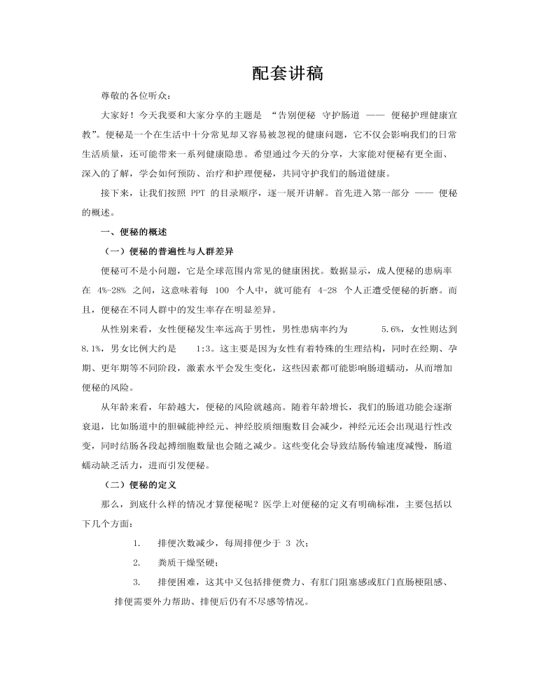本套便秘护理宣教 PPT 模板共 28 页,以科学严谨的逻辑架构和丰富实用的内容,构建起一套完整的便秘健康宣教体系,系统性地划分为六个核心部分,全方位覆盖便秘相关的认知、危害、成因、预防、治疗与护理,为医护人员开展健康宣教工作提供有力支撑,也能帮助受众全面深入地了解便秘护理知识。 第一部分 “便秘的概述” 作为整个宣教内容的基础,首先清晰界定了便秘的医学定义,让受众对便秘形成准确的初始认知。在此基础上,进一步详细列举了便秘的常见症状与体征,如排便次数减少、粪便干结、排便困难等,同时结合临床数据,深入分析了便秘在不同年龄群体(如老年人因肠道功能衰退发病率较高、儿童因饮食结构不合理易出现便秘)和性别群体(女性因生理结构及激素水平变化,便秘发生率相对男性更高)中的发病普遍性,使受众能充分认识到便秘并非个别现象,而是广泛存在的健康问题。 第二部分 “便秘的危害” 从多维度深入剖析了便秘对人体健康的不良影响,打破了 “便秘只是小问题” 的认知误区。在生活质量层面,便秘会导致患者出现腹胀、腹痛等不适,影响日常进食与睡眠,降低生活幸福感;在消化道方面,长期便秘易引发痔疮、肛裂等肛肠疾病,还可能导致肠道内毒素堆积,增加肠道疾病的发病风险;对于心血管系统,便秘患者在用力排便时,会使腹压升高,进而导致血压骤升、心率加快,容易诱发心绞痛、心肌梗死等严重心血管疾病;此外,长期便秘还可能对神经系统产生不良影响,引发焦虑、抑郁等情绪问题,形成恶性循环。 第三部分 “便秘的成因” 则从生理、习惯、活动、饮食、药物及社会心理等多个维度进行全面剖析,帮助受众找到自身便秘的潜在诱因。生理因素方面,随着年龄增长,肠道蠕动功能逐渐减弱,或存在肠道畸形、肠道肿瘤等器质性病变,都可能导致便秘;习惯因素上,长期忽视便意、排便时注意力不集中(如玩手机)等不良排便习惯,会使直肠对粪便的敏感性降低,进而引发便秘;活动因素中,长期缺乏运动,会导致肠道蠕动减慢,影响粪便的正常排出;饮食因素是引发便秘的常见原因,膳食纤维摄入不足、水分摄入过少,会使粪便体积减小、质地变硬,难以排出;药物因素方面,某些药物如抗抑郁药、抗组胺药、钙通道阻滞剂等,可能会影响肠道蠕动,导致便秘;社会心理因素也不容忽视,长期处于紧张、焦虑、压力过大的状态,会通过神经内分泌系统影响肠道功能,诱发便秘。 第四部分 “便秘的预防” 重点聚焦于通过日常干预手段远离便秘,具有极强的可操作性。在合理饮食方面,强调增加膳食纤维的摄入,如多吃蔬菜、水果、全谷物等,同时保证充足的水分摄入,每日饮水量建议在 1500-2000 毫升,以软化粪便,促进肠道蠕动;心理调适方面,指导受众通过适当的方式缓解压力、调节情绪,如听音乐、冥想、与人交流等,避免因不良情绪影响肠道功能;建立良好排便习惯是预防便秘的关键,建议受众每天固定时间排便(如晨起或餐后),排便时集中注意力,避免外界干扰,逐步形成规律的排便反射;适量运动也不可或缺,根据自身情况选择合适的运动方式,如散步、慢跑、瑜伽、太极拳等,每周坚持 3-5 次,每次运动 30 分钟左右,通过运动促进肠道蠕动,预防便秘。 第五部分 “便秘的治疗” 涵盖了从基础干预到专业医疗手段的综合治疗方案,为不同程度的便秘患者提供治疗指导。一般生活方式调整是治疗便秘的基础,与预防措施相呼应,通过优化饮食、运动、排便习惯等,改善肠道功能,缓解便秘症状;药物治疗是临床常用的治疗手段,根据便秘的类型和严重程度,医生会选择合适的药物,如容积性泻药(聚乙二醇、乳果糖等)、渗透性泻药、刺激性泻药(需在医生指导下短期使用)、促动力药等,同时详细说明各类药物的作用机制、使用方法、剂量及注意事项,避免受众自行用药带来的风险;生物反馈治疗作为一种非药物治疗手段,通过借助仪器将肠道蠕动、肛门括约肌收缩等生理信号转化为视觉或听觉信号,让患者直观了解自身肠道功能状态,进而通过训练学会控制肛门括约肌的收缩与放松,改善排便功能,适用于功能性便秘患者;对于经保守治疗无效、存在严重器质性病变(如肠道肿瘤、肠梗阻等)的患者,则可能需要采取外科手术治疗,PPT 中也对手术的适用情况、手术方式及术后护理要点进行了简要介绍,让受众对便秘的治疗有全面的认识。 第六部分 “便秘的护理” 提供了一系列实用的护理技巧,为便秘患者的日常护理提供具体指导。心理护理方面,关注患者因便秘产生的焦虑、烦躁等情绪,通过耐心沟通、心理疏导等方式,帮助患者树立治疗信心,积极配合护理与治疗;环境安排上,为患者营造舒适、安静、私密的排便环境,减少外界干扰,让患者在排便时能放松身心,顺利排便;排便训练需结合患者的生活习惯和身体状况,制定个性化的训练计划,逐步帮助患者建立规律的排便习惯;按摩通便则是一种简单有效的护理方法,指导受众掌握正确的按摩手法(如以肚脐为中心,顺时针方向轻柔按摩腹部,每次按摩 10-15 分钟,每天 2-3 次),通过按摩促进肠道蠕动,帮助粪便排出,同时强调按摩时的力度和注意事项,避免因操作不当造成不良影响。
