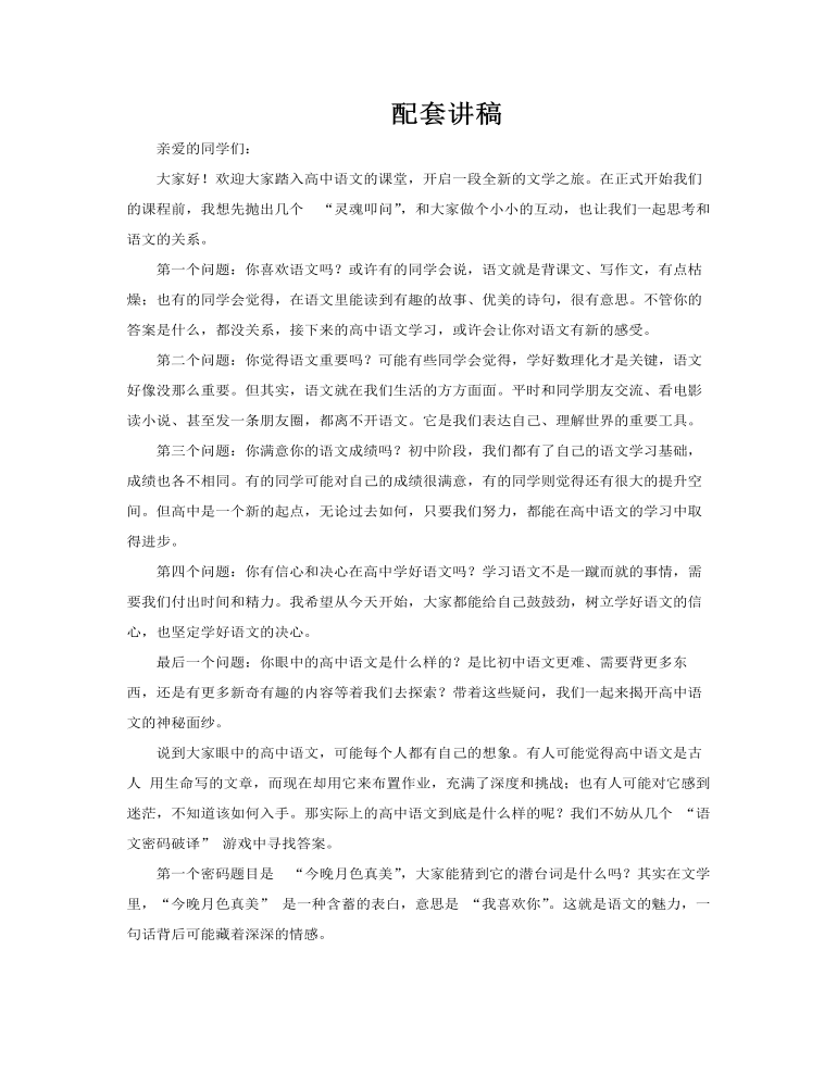 在初高中语文学习的衔接阶段,学生往往面临着学习难度陡升、能力要求提高的挑战。为帮助高一新生平稳过渡,快速适应高中语文学习节奏,一套精心设计的 19 张 PowerPoint 开学第一课课件应运而生,成为教师开展专题引导、为学生 “提前预热” 的重要工具。这套课件以 “明确方向、掌握方法、规范要求” 为核心逻辑,通过三个紧密关联的板块,构建起完整的高中语文入门指导体系,让学生在开学之初就能对高中语文学习形成清晰认知。 第一板块聚焦 “高中语文学什么”,以高一上学期的学习内容为核心,进行了细致且系统的梳理。课件不仅逐一呈现了八个单元的具体主题与课文安排,让学生清晰知晓学期内的学习脉络,还特别拓展了文中涉及的重点地点与人物背景介绍。例如,在讲解古代诗文单元时,会同步介绍相关历史事件发生的地域环境、文化氛围,以及文中人物的生平经历、思想境界,帮助学生跳出单纯的文本阅读,从更广阔的文化视角理解作品内涵,为后续深入学习奠定基础。这种 “内容 + 背景” 的双重呈现方式,有效降低了学生面对陌生知识的畏难情绪,让高中语文的学习框架变得直观可感。 第二板块围绕 “怎样学好高中语文” 展开,为学生提供了可操作、易落地的学习方法指导。课件没有停留在空泛的理论层面,而是聚焦 “积累” 这一核心能力,给出具体的实践路径:一是引导学生建立 “好词好句摘抄本”,不仅要求记录优美语句,还需标注出处、分析表达效果,并尝试仿写运用,将积累与实践结合;二是强调名言警句的整理,建议按主题分类(如 “理想信念”“家国情怀”“人生感悟” 等),既方便记忆,也为写作储备素材;三是梳理文学常识,从作家生平、作品背景到文学流派、文体特征,形成系统的知识网络,帮助学生构建扎实的语文知识基础。这些方法贴近学生学习实际,能有效提升学习效率。 第三板块则明确 “学习语文的要求与建议”,从课前、课中、课后三个环节规范学习行为,同时推荐优质读物拓宽学生视野。课前要求学生提前预习课文,标注生字词、梳理文章结构、提出疑问,带着问题进入课堂;课中强调专注听讲、积极参与课堂互动,包括小组讨论、发言分享、课堂笔记整理等,尤其提醒学生关注老师对文本深层解读的思路,学习分析问题的方法;课后则要求及时复习巩固,完成作业后进行反思总结,同时养成阅读习惯。在读物推荐方面,课件兼顾经典与实用,既包含《红楼梦》《三国演义》等古典文学名著,也有《乡土中国》《人类简史》等兼具思想性与可读性的现代著作,还推荐了《读者》《意林》等优质期刊,引导学生通过广泛阅读提升语文素养。 整套课件逻辑清晰、内容详实,既解决了学生 “学什么” 的困惑,也回答了 “怎么学” 的问题,更明确了 “要做到什么” 的要求,为高一新生开启高中语文学习之旅提供了全面且实用的指导,是开学第一课不可或缺的教学辅助工具。