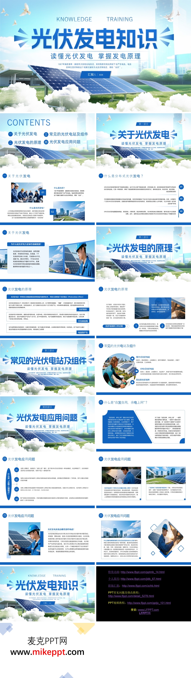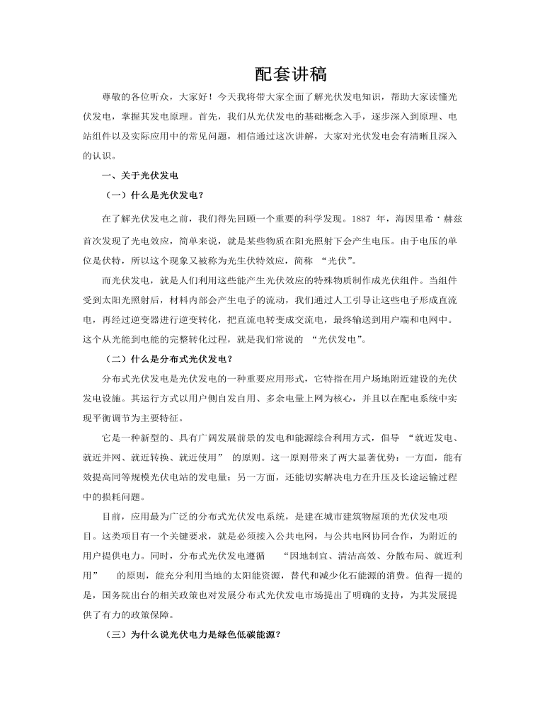这是一套关于光伏发电知识的PPT课件,共包含18张幻灯片,旨在全面介绍光伏发电这一绿色低碳能源技术。光伏发电是一种将太阳能转化为电能的高效技术,它不仅充分利用了可再生能源,还推动了我国科技的进步。 PPT分为四个主要部分。第一部分聚焦于光伏发电的基础知识,详细介绍了光伏发电的定义、分布式发电的原则,以及为什么光伏电力被视为绿色低碳能源。这部分为观众奠定了坚实的理论基础,帮助理解光伏发电的重要性和优势。 第二部分深入探讨了光伏发电的原理。这部分解释了光伏发电是如何利用太阳辐射能直接转换成电能的,包括半导体结构和电流产生的过程。通过详细的讲解,观众可以清晰地了解光伏发电的核心技术。 第三部分介绍了常见的光伏电站及其组件。这部分涵盖了集中式光伏电站和分布式光伏电站的特点和优势,同时详细介绍了常见的光伏组件,如太阳能电池板、逆变器等,帮助观众了解光伏电站的实际构成和运行方式。 第四部分则聚焦于光伏发电应用中可能遇到的问题。这部分不仅讨论了技术挑战,还涉及了政策、经济和环境等方面的问题,为观众提供了一个全面的视角,帮助他们更好地理解和应用光伏发电技术。 整体而言,这套PPT课件内容丰富、结构清晰,适合用于教学和科普,能够帮助观众深入了解光伏发电的各个方面。