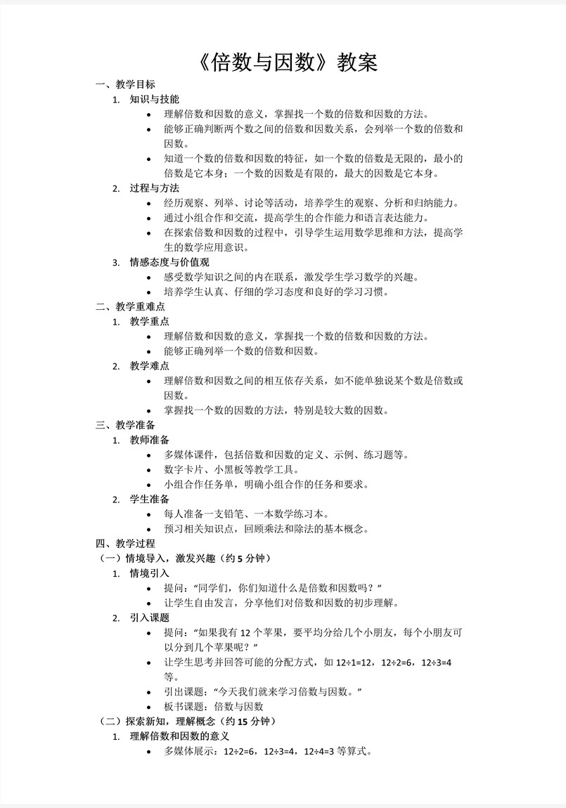 这是一套专为北师大版五年级上册数学第三单元第1课时“倍数与因数”设计的PPT课件模板,共29页。本套PPT课件在设计上注重教学目标的明确性和教学内容的系统性,旨在帮助学生深入理解倍数与因数的概念及其相互关系。 首先,PPT详细阐述了教学目标,重点在于建立倍数与因数关系的认知。同时,明确了教学的重点与难点,如理解倍数与因数的相互依存关系,为教学活动提供了清晰的导向。 在课前准备环节,PPT通过导入活动和知识链接,引导学生回顾乘法口算并思考乘数与积的关系。这种回顾与思考的方式能够迅速吸引学生的注意力,激发他们的学习兴趣,同时帮助学生建立知识与生活的联系。 新知探究部分系统地安排了三个学习任务。任务一“认识倍数与因数”通过具体情境,帮助学生认识倍数与因数的概念及其相互关系。任务二“找一个数的倍数的方法”通过探索找一个数的倍数的方法,发现倍数的特性规律。任务三“达标检测,巩固练习”设计了丰富多样的练习题型,全面巩固学生的学习成效,提升他们的应用能力。 在课程的最后部分,PPT通过知识总结,重点梳理了倍数与因数的核心概念。这种结构化的教学设计不仅有助于学生更好地理解和掌握倍数与因数的相关知识,还能培养他们的自主学习能力和创新思维。 整套内容注重培养学生的数学思维能力和解决实际问题的能力,通过循序渐进的教学设计帮助学生建立完整的倍数与因数知识体系。通过生动的导入、系统的知识讲解和多样化的练习,学生能够更好地理解和应用倍数与因数的相关知识,为后续的学习打下坚实的基础。