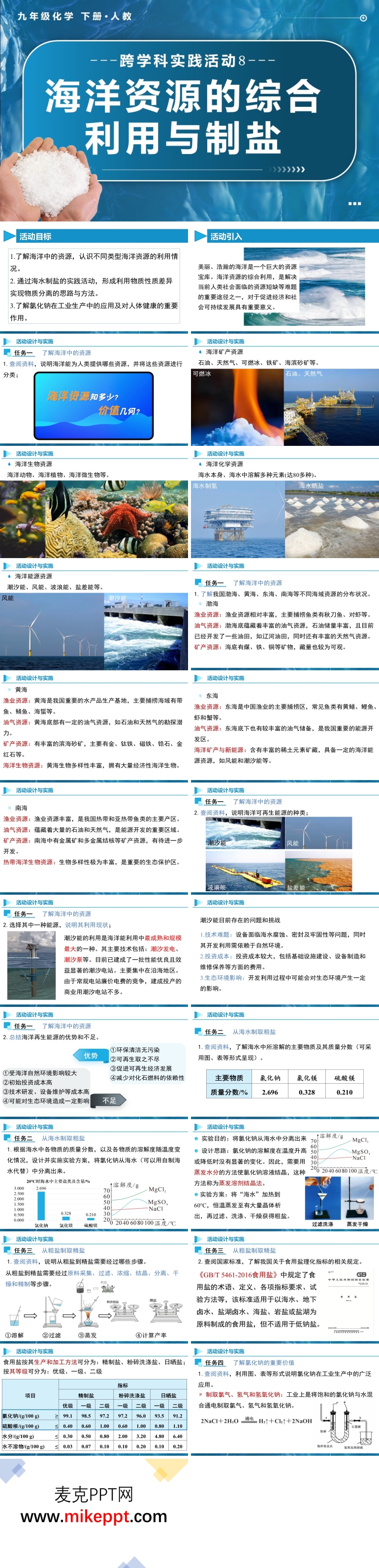 这是一套专为人教版化学九年级下册跨学科实践活动8设计的PPT课件,主题为“海洋资源的综合利用与制盐”,共包含33张幻灯片。本课程旨在通过跨学科知识整合,帮助学生深入了解海洋资源的丰富性及其综合利用的重要性。同时,通过模拟海水制盐实验和粗盐提纯实验的规范操作,提升学生的实验操作能力和现象分析能力。 课件内容从四个方面展开,系统地引导学生进行探究学习。第一部分聚焦于了解海洋中的资源。这一部分鼓励学生查阅相关资料,全面了解海洋中丰富的资源类型,包括海洋矿产资源、海洋生物资源、海洋化学资源和海洋能源资源。通过这一部分的学习,学生能够认识到海洋资源的多样性和重要性,为后续的学习奠定基础。 第二部分则是从海水制取粗盐。这一部分通过设计和实施实验,引导学生亲自动手操作,从海水中提取粗盐。通过具体的实验步骤和操作规范,学生不仅能够掌握实验技能,还能理解海水制盐的基本原理和过程。这种实践操作的方式,不仅增强了学生的动手能力,还培养了他们的科学思维和实验设计能力。 第三部分是粗盐的提纯。在这一部分,学生将学习如何通过科学的方法将粗盐中的杂质去除,制取精盐。通过这一过程,学生可以进一步理解化学实验中的分离和提纯技术,掌握相关的实验操作和数据分析方法。这一部分不仅巩固了学生对化学知识的理解,还提高了他们的实验操作能力和问题解决能力。 第四部分是了解氯化钠的重要价值。这一部分从氯化钠的工业价值和对人体健康的价值两方面展开。通过具体的案例和数据,学生可以了解到氯化钠在工业生产中的广泛应用,如化工、食品加工等领域,以及氯化钠在维持人体健康中的重要作用。这一部分内容不仅拓宽了学生的视野,还帮助他们理解化学知识在实际生活中的应用。 整套PPT课件内容丰富、结构合理,通过实验探究、数据分析和实际应用等多种教学方法,全面提升了学生的科学素养。通过学习这套课件,学生不仅能够掌握化学学科知识,还能将这些知识与生物学、地理学等其他学科相结合,深刻理解海洋资源的综合利用对国家发展的重要意义。同时,通过实践活动的设计,学生能够更好地理解和应用科学知识,为未来的科学学习和实践打下坚实的基础。