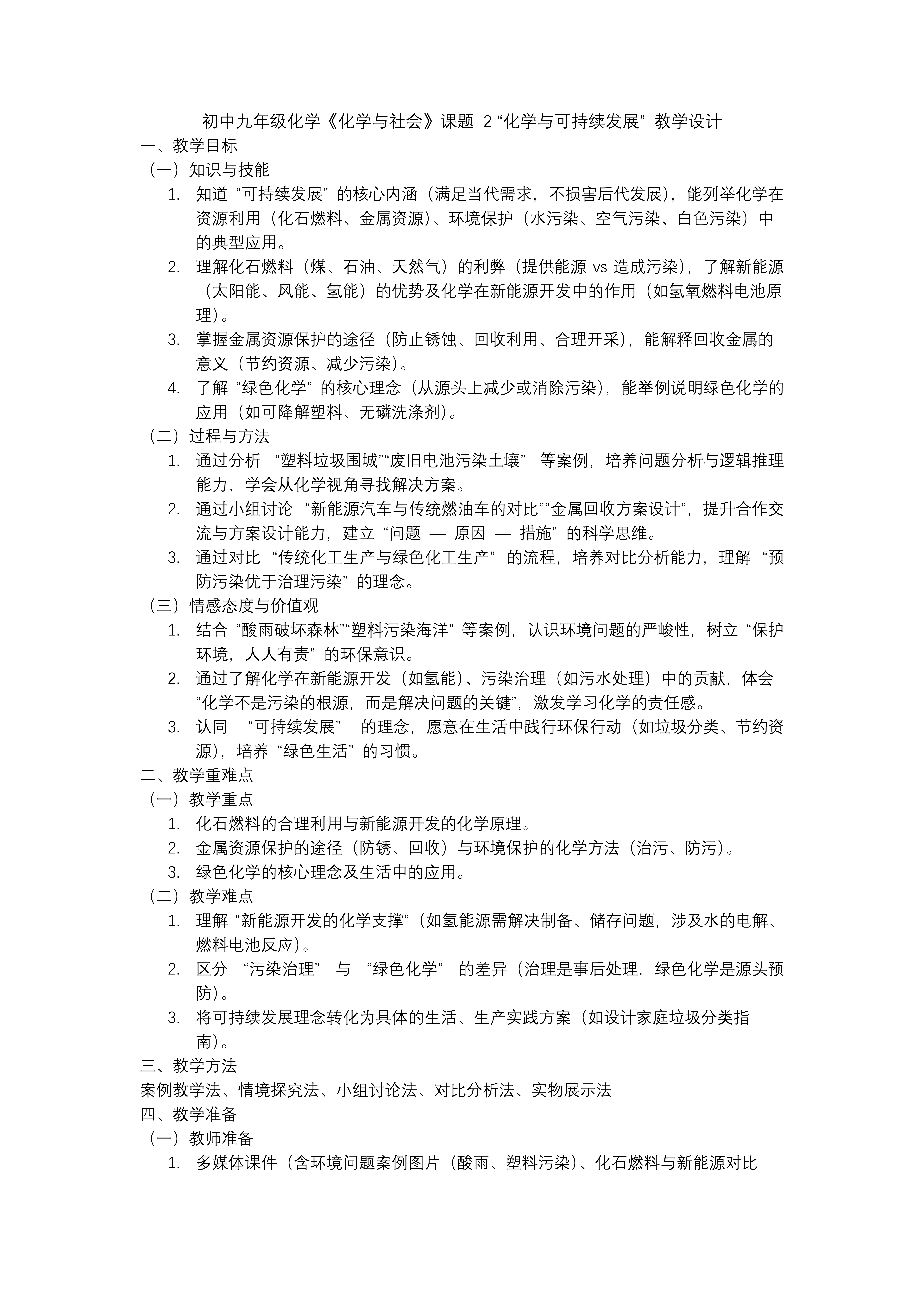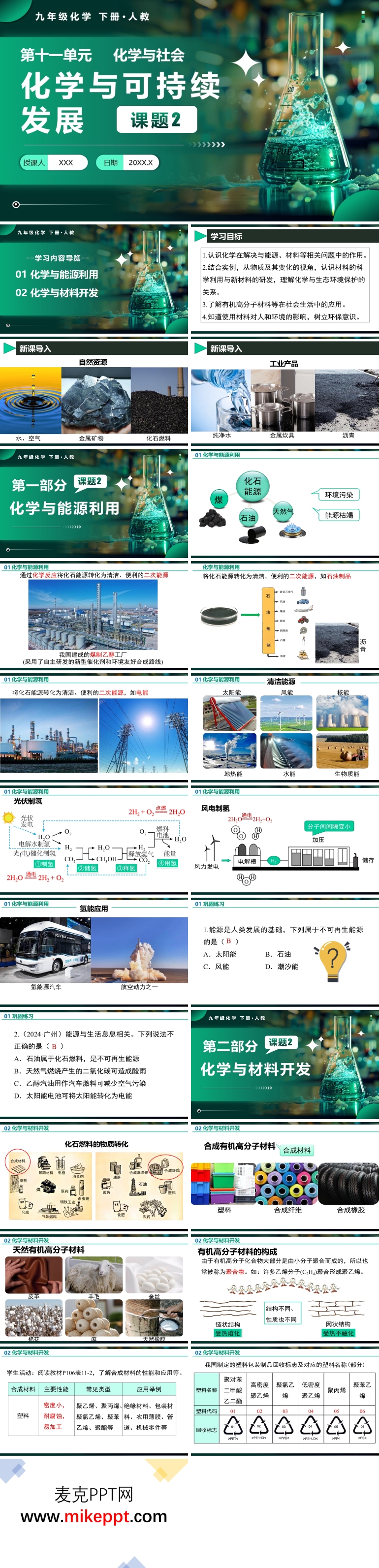 这是一套专为人教版化学九年级下册课题2 “化学与可持续发展” 设计的PPT课件,共包含34张幻灯片。本课程的核心目标是让学生深入理解“可持续发展”的核心内涵,全面认识化石燃料的利弊,了解新能源的优势以及化学在新能源开发中的关键作用。通过分析实际案例,课程旨在培养学生的逻辑推理能力,引导学生从化学角度寻找解决方案,激发他们的社会责任感,使他们认同并践行“可持续发展”的理念,培养“绿色生活”的习惯。 课件内容从两个主要方面展开。第一部分聚焦于化学与能源利用。这一部分首先介绍了化石能源,包括煤、石油和天然气,详细阐述了这些能源的形成过程、用途以及对环境的影响。接着,课程转向清洁能源,特别对光伏制氢和风电制氢进行了深入讲解。通过这些内容,学生可以清晰地看到传统能源与新能源的对比,理解新能源在实现可持续发展中的重要性。此外,通过具体案例的分析,学生能够学会如何从化学角度评估不同能源的优缺点,并探索可行的解决方案。 第二部分则是化学与材料开发。这一部分首先介绍了化石燃料的物质转化过程,解释了如何通过化学方法将化石燃料转化为有用的材料。接着,通过结合丰富的图片,课程详细介绍了合成有机高分子材料和天然有机高分子材料的特点和应用。最后,对新型材料进行了讲解,包括它们的性能、优势以及在现代科技中的应用。通过这一部分内容,学生可以了解到化学在材料科学中的重要作用,以及如何通过化学创新来开发更环保、更高效的材料。 整套PPT课件内容丰富、结构清晰,通过理论讲解、案例分析和实际应用等多种教学方法,全面提升了学生的科学素养。通过学习这套课件,学生不仅能够掌握化学学科知识,还能将这些知识与环境保护、能源利用等实际问题相结合,深刻理解化学在可持续发展中的关键作用。同时,通过实践活动的设计,学生能够更好地理解和应用科学知识,培养他们的创新思维和实践能力,为未来的科学学习和生活实践打下坚实的基础。