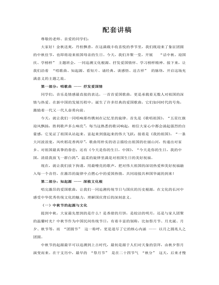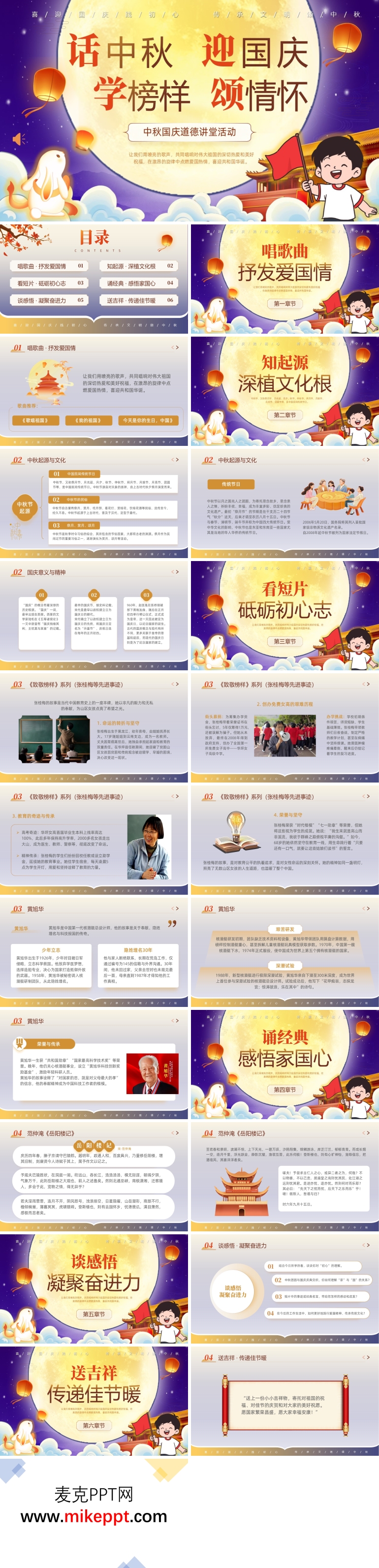 这是一套精心制作的关于“话中秋迎国庆学榜样”主题班会的PPT模板,采用PowerPoint软件完成,共包含25张幻灯片。今年的中秋节与国庆节相隔甚近,这两个节日在我国都是极为重要的盛大节日。学校借此契机,通过一次主题班会将中秋与国庆融合为共同主题,以此来开展一次意义非凡的教育活动,而这份演示文稿便是围绕中秋国庆道德讲堂活动展开的,主要分为六个部分。 第一部分是“唱歌曲,抒发爱国情”。在这一环节,旨在引导学生们用嘹亮的歌声,共同唱响对伟大祖国的深切热爱以及美好祝福。通过熟悉的旋律和激昂的歌词,激发学生们内心深处的爱国热情,让他们在歌声中感受祖国的伟大与繁荣,增强民族自豪感和凝聚力。 第二部分是“知起源,深植文化根”。这里主要介绍了中秋节的起源与文化内涵,以及国庆节的意义与精神。让学生们了解中秋节的古老传说、传统习俗,感受这一传统节日所蕴含的深厚文化底蕴;同时,深入阐述国庆节的由来,回顾新中国成立的艰难历程,深刻领会国庆节所承载的民族精神和时代意义,从而在学生们心中深植文化根基,传承和弘扬中华民族优秀传统文化与爱国主义精神。 第三部分是“看短片,砥砺初心志”。在这一部分,主要引导学生们观看有关张桂梅等先进人物的感人事迹短片。通过观看这些短片,让学生们从张桂梅等榜样人物的一生中汲取精神力量,获得人生感悟。学习他们无私奉献、坚守初心、勇于担当的高尚品质,激励学生们在今后的学习和生活中,以榜样为引领,坚定理想信念,砥砺奋进,努力成为对社会有用的人才。 第四部分是“诵经典,感悟家国心”。此环节主要展示了范仲淹的《岳阳楼记》。通过诵读这篇经典古文,让学生们在品味古文韵味的同时,深刻感悟其中所蕴含的家国情怀。体会“先天下之忧而忧,后天下之乐而乐”的崇高思想境界,引导学生们树立正确的价值观和人生观,将个人的命运与国家的命运紧密相连,培养他们的社会责任感和使命感。 第五部分是“谈感悟,凝聚奋进力”。在经历了前面几个环节的学习与感悟之后,学生们在这一部分畅所欲言,分享自己的感悟与体会。通过交流讨论,学生们能够相互启发、共同进步,进一步凝聚奋进的力量。将从活动中汲取的精神养分转化为实际行动的动力,激励他们在今后的学习和生活中不断努力,为实现自己的梦想和国家的发展贡献自己的力量。 第六部分是“送吉祥,传递佳节暖”。在班会的最后,这一部分主要引导学生们对祖国送上一份小小的吉祥物和美好的祝愿。学生们可以亲手制作一些富有创意和寓意的吉祥物,如手工剪纸、绘画作品等,通过这些吉祥物表达对祖国母亲的热爱与祝福。同时,也让学生们在亲手制作和赠送吉祥物的过程中,感受到佳节的温暖与喜悦,增强班级的凝聚力和向心力,让这份温暖和祝福在班级中传递,营造出浓厚的节日氛围。 总之,这套“话中秋迎国庆学榜样”主题班会PPT模板内容丰富、形式多样,通过六个精心设计的部分,将中秋与国庆的文化内涵、爱国情怀以及榜样力量有机融合,旨在通过主题班会这一形式,对学生进行一次全方位、深层次的思想教育和文化熏陶,让学生们在活动中感受节日的喜悦,传承优秀文化,弘扬爱国精神,学习榜样力量,凝聚奋进力量,为他们的成长之路注入强大的精神动力。