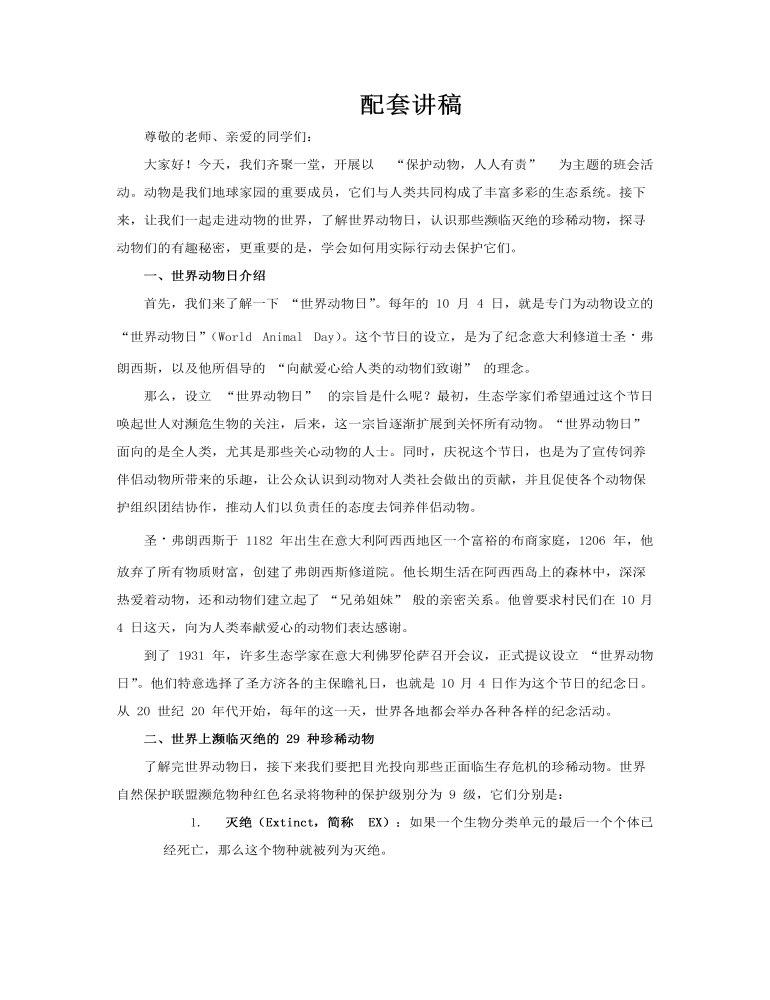 这是一份精心制作的、与 10 月 4 日世界动物日 “保护动物,人人有责” 主题班会紧密相关的演示文稿,它包含了 35 张内容丰富、形式多样的幻灯片。通过此次主题班会活动,同学们将有机会深入了解保护野生动物的诸多知识,并且在心中树立起保护野生动物的坚定意识。 野生动物不仅是人类的朋友,更是大自然中不可或缺的重要组成部分。只有通过进一步普及保护野生动物的相关知识,同学们才能真正意识到保护野生动物的重要性。这种重要性不仅体现在它与人类的息息相关上,更在于它对于维护自然生态系统的平衡发挥着至关重要的作用。而这份 PowerPoint 演示文稿正是为了达到这样的教育目的而设计的,它由四个精心编排的部分构成。 第一部分是关于世界动物日的详细介绍。该模板首先深入阐述了世界动物日的设立宗旨,让同学们明白这个特殊日子背后所承载的意义。紧接着,又对世界动物日的节日起源进行了详细的追溯,通过讲述它的起源故事,让同学们对这个节日有更加深刻的认识和理解,从而在源头上把握住保护动物这一主题的核心。 第二部分聚焦于世界濒临灭绝的二十九种珍稀动物。这一部分的内容安排条理清晰、层次分明。首先,它介绍了濒临灭绝的珍稀动物所设立的不同保护级别,让同学们了解到根据动物的濒危程度,人类采取了不同等级的保护措施。然后,分别对野外灭绝和极危动物进行了详细的介绍,通过展示这些动物的现状和面临的困境,引起同学们的关注和重视。最后,又对濒危和易危动物进行了系统的介绍,让同学们全面了解目前野生动物所面临的严峻形势,从而增强保护它们的紧迫感。 第三部分是 “这些有趣的动物你知道吗”,这一部分的内容更加贴近同学们的生活,也更具趣味性。它主要涵盖了大象、河马、小狗、猫咪和公狮子等动物。通过对这些动物的生活习性、特点等进行生动有趣的介绍,让同学们在轻松愉快的氛围中了解这些动物,进而激发他们对动物的喜爱之情,为后续的保护意识培养奠定情感基础。 第四部分则是 “保护动物,人人有责”,这是整个演示文稿的核心和落脚点。在这一部分,通过各种生动的案例、有力的论证以及具体的行动倡议,呼吁同学们将保护动物的意识落实到实际行动中,让同学们明白每个人都可以为保护动物贡献自己的一份力量,从而在班级中营造出一种积极向上、共同保护动物的良好氛围。 这份演示文稿通过精心设计的四个部分,将知识性、趣味性和教育性有机结合,旨在通过主题班会的形式,让同学们在学习中感受保护动物的重要性,在活动中增强保护动物的意识,最终将保护动物的理念融入到日常生活中,共同为保护野生动物、维护自然生态平衡贡献自己的一份力量。