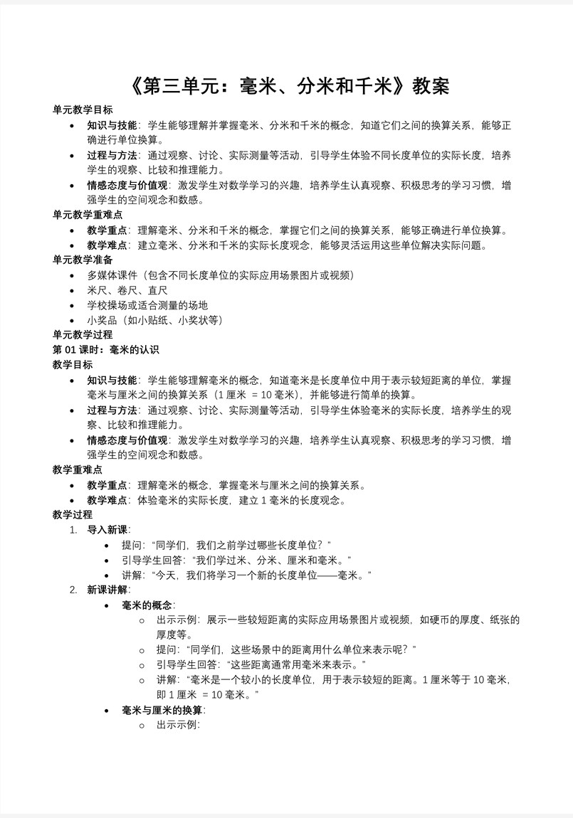 这是一套专为人教版小学数学三年级上册第三单元“毫米、分米和千米”的复习课而设计的PPT课件,通过PowerPoint精心制作而成,共包含37张幻灯片。本节课的核心目标是引导学生对毫米、分米和千米这些长度单位进行深入复习,使学生能够熟练掌握它们之间的换算关系,并能够准确无误地进行换算。通过四个部分的内容展开,帮助学生系统地复习和巩固所学知识。 课件内容概述 第一部分:单元知识框架 在第一部分,通过思维导图的方式,将本单元所学的具体知识点进行全面展示。思维导图是一种非常有效的学习工具,它可以帮助学生将零散的知识点进行整合,形成一个清晰的知识体系。通过展示思维导图,学生可以直观地看到本单元的主要内容和各个知识点之间的联系,从而更好地理解和记忆所学知识。例如,思维导图可以将毫米、分米和千米的定义、换算关系以及应用场景等知识进行分类和归纳,帮助学生建立起系统的知识框架。这一部分不仅帮助学生回顾了本单元的主要内容,还培养了他们良好的学习习惯。 第二部分:知识点梳理 第二部分主要帮助学生梳理毫米、分米和千米的认识。这一部分详细展示了毫米、分米和千米的定义、换算方法以及它们在日常生活中的应用。例如,通过展示尺子、卷尺等测量工具,帮助学生直观地理解毫米和分米的实际长度;通过展示千米在测量较长距离时的应用,如公路里程、铁路长度等,帮助学生理解千米的概念。同时,通过具体的换算例子,如1千米=1000米、1分米=10厘米、1厘米=10毫米等,帮助学生掌握这些长度单位之间的换算关系。这一部分通过系统的梳理,帮助学生巩固对毫米、分米和千米的认识,为后续的学习打下坚实的基础。 第三部分:重难点题型精讲 第三部分是重难点题型的精讲。在这一部分,教师通过展示一些典型的重难点题型,引导学生更好地掌握本单元的内容。例如,对于一些涉及多个长度单位换算的复杂问题,教师会通过详细的分析和讲解,帮助学生理解解题思路和方法。通过逐步引导学生分析问题,先确定需要换算的单位,再按照正确的换算关系进行计算,帮助学生突破这些难点。此外,教师还会通过一些实际应用题,如计算一段路程的长度、测量物体的尺寸等,帮助学生将所学知识应用到实际问题中。通过反复讲解和练习,学生可以更好地掌握这些重难点题型,提高他们的解题能力。 第四部分:变式巩固练习 第四部分是变式巩固练习。通过一系列精心设计的练习题,帮助学生巩固所学知识,提高他们的计算能力和解题技巧。这些练习题不仅包括基础题,还包含一些变式题,旨在帮助学生灵活运用所学知识,解决不同形式的长度单位换算问题。例如,练习题可以包括不同长度单位之间的换算、实际应用题等,让学生在练习中熟悉各种换算关系和解题方法。通过变式练习,学生可以更好地理解和掌握毫米、分米和千米的换算关系,提高他们的数学思维能力和解决问题的能力。 通过这四个部分的系统复习和练习,学生将能够全面掌握毫米、分米和千米这些长度单位的知识点,熟练掌握它们之间的换算关系,并能够准确无误地进行换算。这不仅有助于学生在数学学习中取得更好的成绩,还能培养他们的逻辑思维能力和实际应用能力,为今后的数学学习打下坚实的基础。