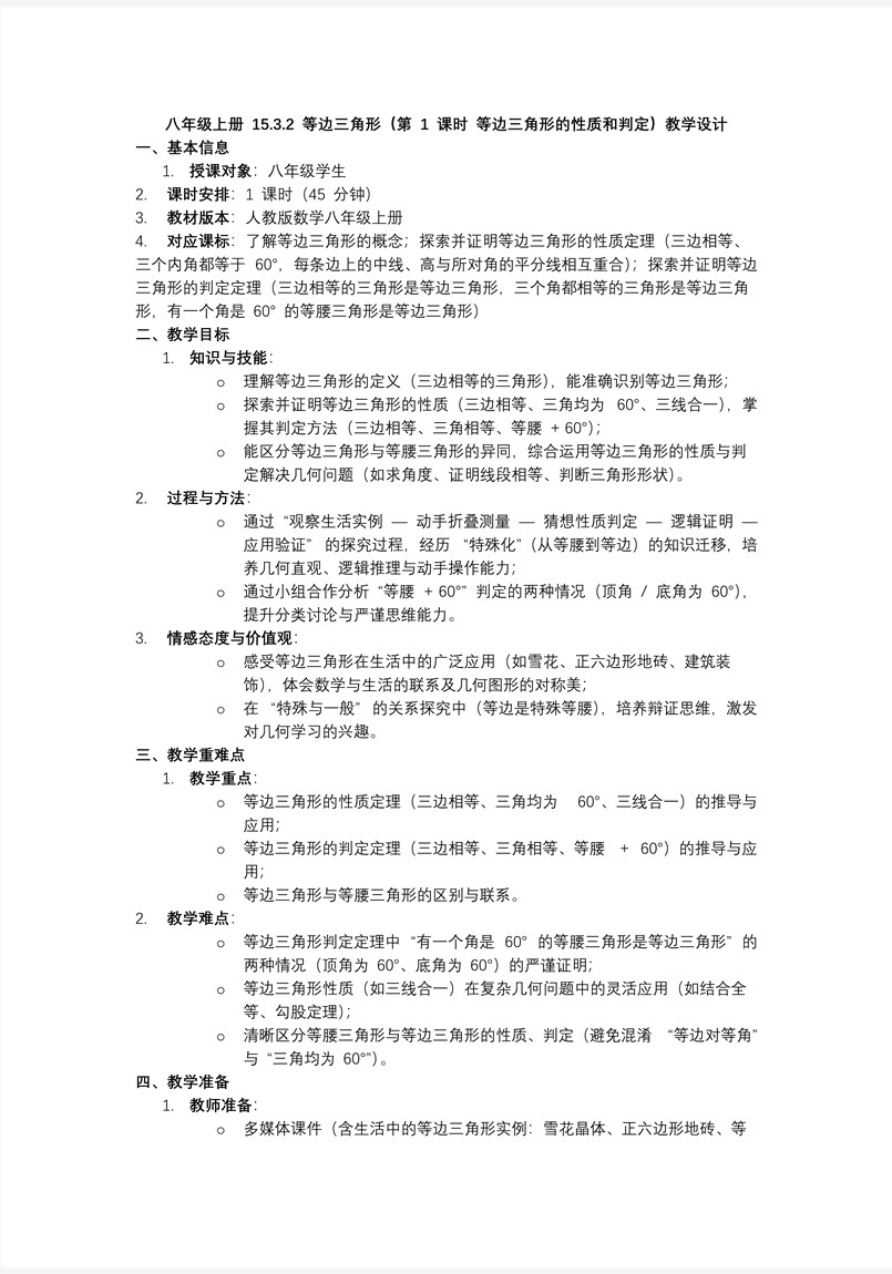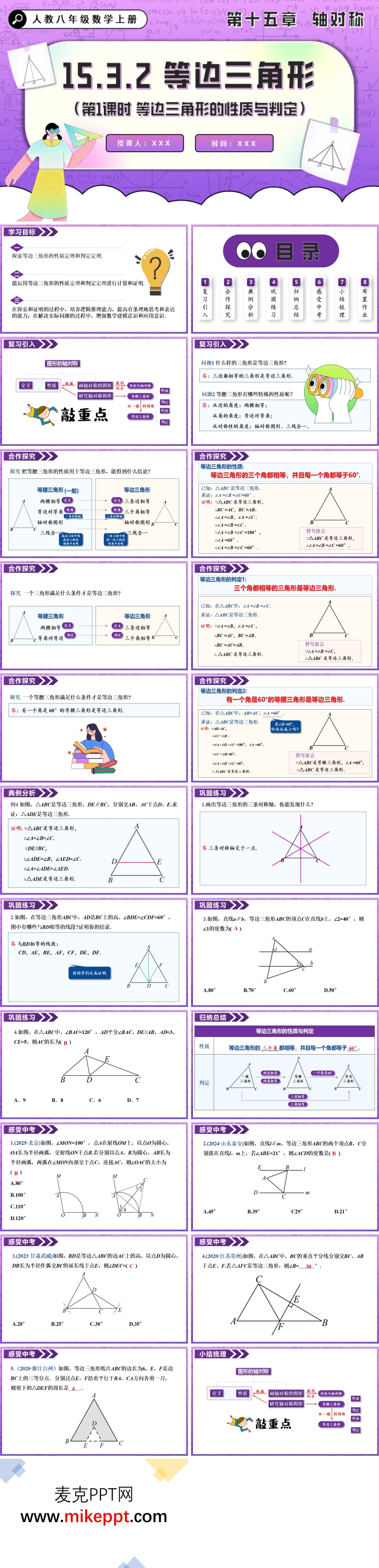 本套 PPT 课件是针对人教版数学八年级上册 15.3.2 节“等边三角形(第 1 课时等边三角形的性质与判定)”精心设计的,共包含 24 张幻灯片。其核心目标是助力学生深入理解等边三角形的定义,引导学生自主探索并严谨证明等边三角形的性质,牢固掌握其判定方法。在此过程中,着重培养学生的几何直观能力,使其能够通过图形直观感知等边三角形的特点;锻炼学生的逻辑推理能力,帮助他们学会运用已学知识进行推理论证;同时通过动手操作活动,增强学生的实践能力,促进学生多方面能力的协同发展。 PPT 从八个板块展开教学内容。第一板块为复习引入,通过回顾旧知,为新课学习做好铺垫,帮助学生建立起知识的联系。第二板块是合作探究,着重引导学生将等腰三角形的性质迁移应用到等边三角形中,通过小组合作的形式,让学生在交流讨论中发现等边三角形的独特性质,激发学生的学习兴趣和探究欲望。第三板块为典例分析,选取经典例题进行详细剖析,帮助学生深入理解知识点,掌握解题思路和方法,从而更好地运用所学知识解决实际问题。第四板块是巩固练习,通过多样化的练习题,让学生在实践中巩固新知,提高解决实际问题的能力,进一步加深对等边三角形性质与判定的理解。第五板块为归纳总结,引导学生对本节课所学内容进行梳理和总结,帮助学生构建完整的知识体系,强化记忆。第六板块是感受中考,精心挑选具有代表性的中考题型进行讲解和练习,让学生提前感受中考难度,熟悉中考题型,增强应试能力,为中考做好充分准备。第七板块为小结梳理,再次对本节课的重点内容进行回顾和梳理,帮助学生巩固记忆,加深理解。第八板块为布置作业,通过布置适量的课后作业,让学生在课后继续巩固和深化所学知识,培养学生的自主学习能力。 整套 PPT 课件内容丰富,结构清晰,教学方法多样,注重学生能力的培养,能够有效帮助学生掌握等边三角形的性质与判定,提升学生的数学素养。
