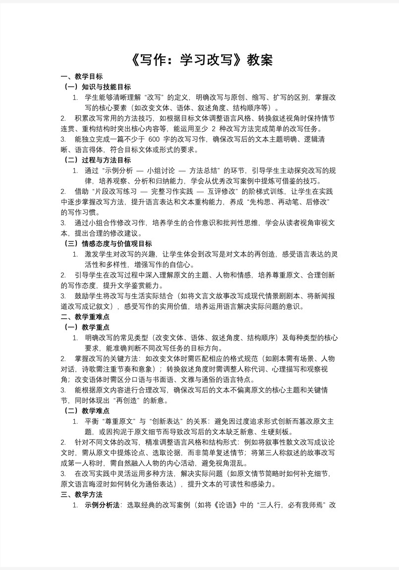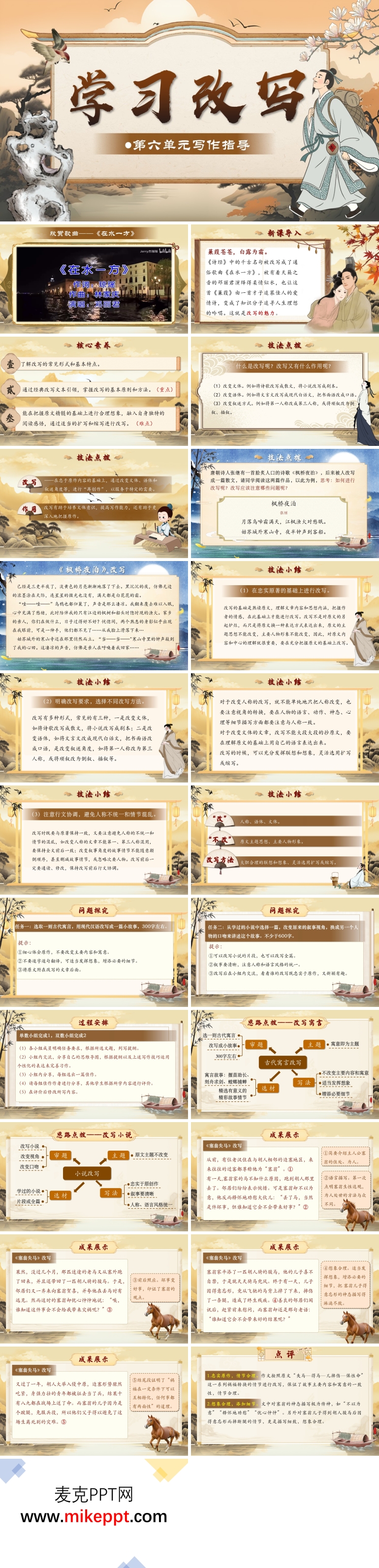 这是一套专为部编版语文九年级上册第六单元《写作:学习改写》设计的PPT课件,通过PowerPoint精心制作而成,共包含34张幻灯片。改写文章是一种重要的写作技巧,它允许我们在保持原文核心内容的基础上,根据自己的理解和需求对文章进行重新创作。然而,改写并非随意为之,而是需要遵循一定的技巧和原则。本套PPT课件通过五个部分的详细讲解,帮助学生掌握改写的要点和方法,提升他们的写作能力。 课件内容概述 第一部分:技法点拨 在第一部分,通过技法点拨,帮助学生理解改写的定义和作用。改写不仅仅是对原文的简单复制,而是在保留原文核心思想的基础上,通过重新组织语言、调整结构等方式,使文章更符合特定的写作目的或读者需求。这一部分还强调了改写过程中需要注意的几个关键问题。首先,改写必须忠实于原著,不能歪曲原文的意思;其次,要明确改写的具体要求,比如字数、风格、受众等;再次,根据不同的写作目的,选择合适的改写方法,如缩写、扩写、改编等;最后,注意行文的协调性,确保改写后的文章语言流畅、结构合理。通过这些点拨,学生可以对改写有一个清晰的认识,为后续的写作实践打下坚实的基础。 第二部分:问题探究 第二部分是问题探究环节,主要引导学生选取一篇文章,运用所学的改写技法进行实际操作。这一部分通过具体的写作任务,让学生在实践中体会改写的要点和技巧。教师可以提供一些示例文章,让学生尝试从不同的角度进行改写,如改变文章的叙述视角、调整文章的结构顺序等。在学生完成改写后,组织小组讨论,分享各自的改写思路和成果,通过交流和反馈,帮助学生进一步完善自己的改写作品。这一环节不仅培养了学生的写作能力,还增强了他们的合作意识和批判性思维。 第三部分:改写思路展示 第三部分主要展示了改写寓言和小说的具体思路。寓言和小说是两种常见的文学体裁,它们在结构、语言和表达方式上各有特点。对于寓言的改写,可以重点引导学生关注寓言的寓意和故事框架,通过改变故事的背景、人物形象或情节发展,赋予寓言新的时代意义。对于小说的改写,则可以着重从人物塑造、情节设置和环境描写等方面入手,帮助学生理解如何在保持原作精神的基础上进行创新。通过展示具体的改写思路和示例,学生可以更直观地了解不同文体的改写方法,为自己的写作提供参考和借鉴。 第四部分:改写成果展示与点评 第四部分是改写成果的展示和点评环节。在这一部分,学生将自己改写的作品进行展示,教师和其他同学对这些作品进行点评。点评时,可以从改写是否忠实于原著、是否符合改写要求、语言表达是否流畅、结构是否合理等多个角度进行评价。通过展示和点评,学生不仅可以获得他人的反馈和建议,还能从其他同学的作品中学习到不同的改写方法和技巧,进一步提升自己的写作水平。这一环节不仅增强了学生的自信心,还培养了他们的审美能力和评价能力。 第五部分:课堂小结与家庭作业布置 在第五部分,教师对本节课的重点内容进行总结回顾,帮助学生梳理改写的要点和技巧,形成完整的知识体系。同时,根据课堂上的学习情况,布置相应的家庭作业,如要求学生对一篇指定的文章进行改写,或者对课堂上的改写作品进行进一步修改和完善。通过家庭作业的布置,学生可以在课后继续巩固所学知识,深化对改写技巧的理解和运用。 通过这五个部分的系统学习和实践操作,学生将能够全面掌握改写的要点和方法,提升他们的写作能力和创新思维。这不仅有助于学生在语文学习中取得更好的成绩,还能培养他们的文学素养和人文精神,为今后的学习和成长打下坚实的基础。
