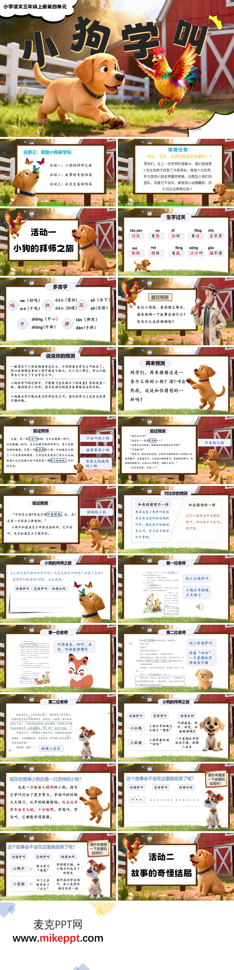 这是一套专为语文三年级上册第 14 课《小狗学叫》设计的 PPT 课件,共包含 39 张幻灯片。本节课的核心目标是帮助学生认识生字,能够正确、流利、有感情地朗读课文。通过小组讨论、角色扮演、猜想预测等活动,培养学生的阅读理解能力、逻辑思维能力和创意表达能力。同时,通过本节课的学习,引导学生理解故事蕴含的道理:不要盲目模仿他人,要找到适合自己的“声音”,接纳自我价值。 该套 PPT 课件从三个主要部分展开《小狗学叫》的教学内容。 第一部分:小狗的拜师之旅 这一部分首先聚焦于帮助学生掌握本篇课文的生字词,通过趣味识字、组词造句等互动环节,让学生在轻松的氛围中学会生字。接着,引导学生对课文的题目进行预测,激发学生的好奇心和阅读兴趣。随后,带领学生初读课文,验证他们的预测结果。这一环节旨在培养学生的信息提取能力和逻辑梳理能力,让学生在阅读过程中学会主动思考和验证。 第二部分:故事的奇怪结局 这一部分将课文内容与学生的预测进行对比,引导学生思考哪种结局更好。通过小组讨论和全班交流,学生可以分享自己的观点,培养批判性思维和逻辑表达能力。这一环节不仅帮助学生深入理解课文内容,还鼓励他们从不同角度思考问题,提升思维的灵活性和深度。 第三部分:补充完善新结局 在这一部分,学生将发挥自己的创意,补充和完善故事的新结局。通过角色扮演和小组合作,学生可以将自己的想法融入故事中,进一步提升创意表达能力。这一环节不仅激发学生的想象力和创造力,还帮助他们在实践中学会合作与分享。 整套 PPT 课件内容丰富,结构合理,教学方法多样,注重学生能力的培养。通过小狗的拜师之旅、故事的奇怪结局和补充完善新结局三个环节,课件全面覆盖了《小狗学叫》的教学目标,能够有效帮助学生掌握相关知识,提升语文素养。同时,通过趣味互动和小组合作,激发学生的学习兴趣,培养他们的自主学习能力。