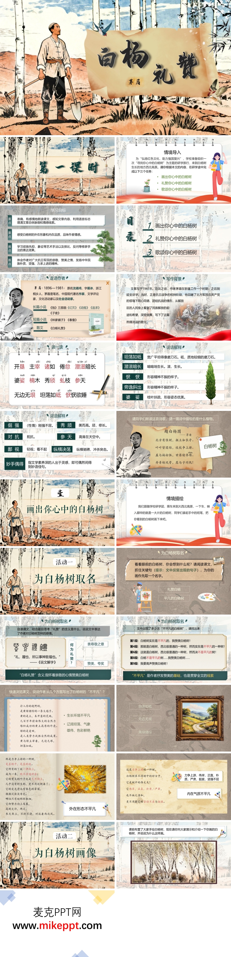 这是一套关于部编版语文八年级上册第四单元《白杨礼赞》的PPT课件,共包含60张幻灯片。本节课的设置旨在引导学生把握托物言志的手法,理解白杨树的象征意义;让学生体会革命年代的精神内核,培养家国情怀;同时提升学生的散文赏析能力与文本解读素养。该套PPT从三个方面展开本节课程的学习。 课程设计与实施 第一部分:画出你心中的白杨树 这一部分首先引导学生阅读课文,抓住关键词,为白杨树取名。通过这一活动,学生能够初步感知白杨树的形象,并激发他们的创造力和想象力。接着,引导学生从外在形态介绍自己所画的白杨树,并结合课文内容对白杨树的外形进行分析。这一环节不仅帮助学生理解白杨树的外在特征,还培养了他们的观察和分析能力。 第二部分:礼赞你心中的白杨树 这一部分通过课文中的具体句子,引导学生结合句子分析白杨树的精神品质。通过具体的语句分析,学生能够深入理解白杨树所代表的坚韧、正直、团结等精神品质。这一环节旨在帮助学生把握托物言志的手法,理解白杨树的象征意义,同时培养他们的文本解读能力。 第三部分:歌颂你心中的白杨树 这一部分通过一首《白杨之歌》赞颂白杨树的精神品质。通过诗歌的形式,学生能够更加直观地感受到白杨树的伟大精神,进一步深化对白杨树象征意义的理解。这一环节不仅提升了学生的文学鉴赏能力,还通过歌颂的形式,激发学生的情感共鸣,培养他们的家国情怀。 PPT内容结构 第一部分:画出你心中的白杨树 阅读课文,抓住关键词:引导学生阅读课文,找出描述白杨树的关键语句,为白杨树取一个贴切的名字。 绘制白杨树:学生根据自己的理解,绘制出自己心中的白杨树。 介绍白杨树的外在形态:学生从外在形态介绍自己所画的白杨树,并结合课文内容对白杨树的外形进行分析,如树干、树枝、树叶等特征。 第二部分:礼赞你心中的白杨树 分析具体句子:选取课文中的具体句子,引导学生分析白杨树的精神品质。 讨论与分享:学生分组讨论,分享自己对白杨树精神品质的理解,如坚韧、正直、团结等。 总结托物言志手法:通过分析和讨论,总结托物言志的手法,理解白杨树的象征意义。 第三部分:歌颂你心中的白杨树 欣赏《白杨之歌》:播放或展示《白杨之歌》,引导学生欣赏诗歌,感受诗歌中对白杨树的赞颂。 讨论诗歌内容:学生讨论诗歌中白杨树的精神品质,进一步深化对白杨树象征意义的理解。 情感升华:通过歌颂白杨树,激发学生的情感共鸣,培养他们的家国情怀。 总结 这套PPT课件内容丰富,结构清晰,通过三个部分的系统学习,能够有效地帮助学生理解《白杨礼赞》的深刻内涵。通过画出白杨树、分析白杨树的精神品质、歌颂白杨树,学生不仅能够提升散文赏析能力和文本解读素养,还能深刻体会到革命年代的精神内核,培养家国情怀。这种系统化的学习方式有助于学生在学习过程中形成完整的知识体系,为后续的学习打下坚实的基础。同时,通过具体的活动和讨论,学生能够更好地内化所学知识,提升综合素质。