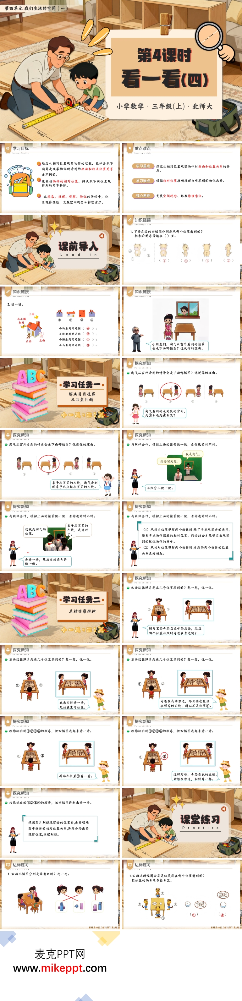 这是一套为小学三年级数学上册北师大版第四单元第 4 课时 “看一看” 量身定制的 PPT 模板,借助 PowerPoint 软件精心制作而成,涵盖了 27 张幻灯片。本节课的核心学习目标是引导学生深入探究从相对位置观察物体时,画面与位置之间所呈现出的独特关系和特点,进而有效发展学生的空间观念,培养学生的推理意识以及抽象思维能力,为学生今后的数学学习奠定坚实的基础。 该演示文稿内容丰富、结构严谨,主要从五个部分展开对本课时的详细讲解。第一部分是课前导入环节,这一部分通过巧妙设计的情境和提示,引导学生积极思考并准确选择从不同方位所观察到物体的图片。这种导入方式能够迅速激发学生的学习兴趣,使学生在轻松愉快的氛围中进入学习状态,为后续的学习内容做好充分的铺垫。 第二部分聚焦于解决贝贝观察礼盒的问题。该部分通过贝贝观察礼盒的情境,引导学生学会从不同的角度观察多个物体,并且重点分析不同物体之间的左右关系。通过这一过程,学生能够逐步建立起空间方位的概念,学会运用所学知识解决实际问题,提高学生的观察力和分析能力。 第三部分是总结观察规律。在这一部分,教师通过精心设计的练习题,引导学生自主地总结出观察物体时的规律。这种以学生为主体的教学方式,能够充分调动学生的积极性和主动性,让学生在实践中总结经验,掌握知识,提高学生的自主学习能力和思维能力。 第四部分是达标练习和知识总结部分。通过一系列有针对性的练习题,检验学生对本节课知识的掌握程度,帮助学生巩固所学内容。同时,对本节课的重点知识进行系统总结,让学生对所学内容有一个清晰、完整的认识,强化记忆,为后续的学习打下坚实的基础。 此外,该演示文稿还注重培养学生的抽象思维能力。通过引导学生从相对位置观察物体,让学生学会从具体的事物中抽象出数学概念和规律,培养学生的抽象思维能力,提高学生的数学素养。
