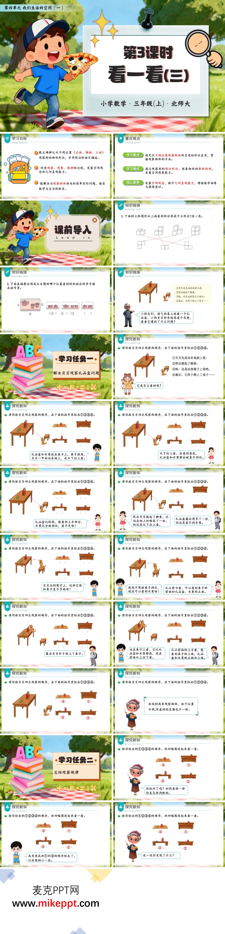 这是一套专为北师大版小学数学第四单元第 3 课时 “看一看” 设计的教学课件 PPT 模板,采用 PowerPoint 制作,包含 35 张幻灯片。本节课的学习目标是引导学生在前两节课学习的基础上,更深入地学会用语言描述从不同位置观察到的物体形状,进一步提升学生的空间观念和语言表达能力。 该演示文稿从五个部分展开对 “我们生活的空间” 第三课时的讲解。第一部分是课前导入环节,通过复习前两个课时的内容,帮助学生巩固已学知识,为本节课的学习做好铺垫。这一环节通过提问和回顾,激活学生的思维,让学生快速进入学习状态。 第二部分是解决贝贝观察礼品盒的问题。这一部分展示了贝贝从不同角度观察礼品盒的图片,引导学生根据观察顺序标出所看到的内容。通过这一活动,学生不仅能够加深对观察顺序的理解,还能学会如何准确地描述观察到的形状和细节。这一环节通过具体的案例,让学生在实践中学习和应用知识。 第三部分是总结观察规律。在这一部分,教师通过引导学生分析和讨论,帮助学生形成初步的推理意识。学生将通过观察和思考,总结出从不同位置观察物体时形状变化的规律。这一环节旨在培养学生的逻辑思维能力和归纳总结能力,让学生能够从具体的现象中抽象出规律。 第四部分是交流生活中的观察经验。通过引导学生分享生活中的观察经验,让学生明白观察位置的高低对观察范围的影响。例如,位置越高,观察到的范围越大;位置越低,观察到的范围越小。这一环节将数学知识与生活实际相结合,让学生在熟悉的生活中发现数学规律,增强学生对数学知识的理解和应用能力。 第五部分是达标练习和知识总结。通过一系列精心设计的练习题,检验学生对本节课知识的掌握程度,帮助学生巩固所学内容。同时,对本节课的重点知识进行系统总结,让学生对所学内容有一个清晰、完整的认识,强化记忆,为后续的学习打下坚实的基础。 这套 PPT 模板通过精心设计的教学环节,不仅帮助学生巩固了前两节课的知识,还进一步提升了学生的空间观念、语言表达能力和逻辑思维能力。通过生活化的教学内容和互动性强的教学设计,让学生在轻松愉快的氛围中学习数学,感受数学与生活的紧密联系。