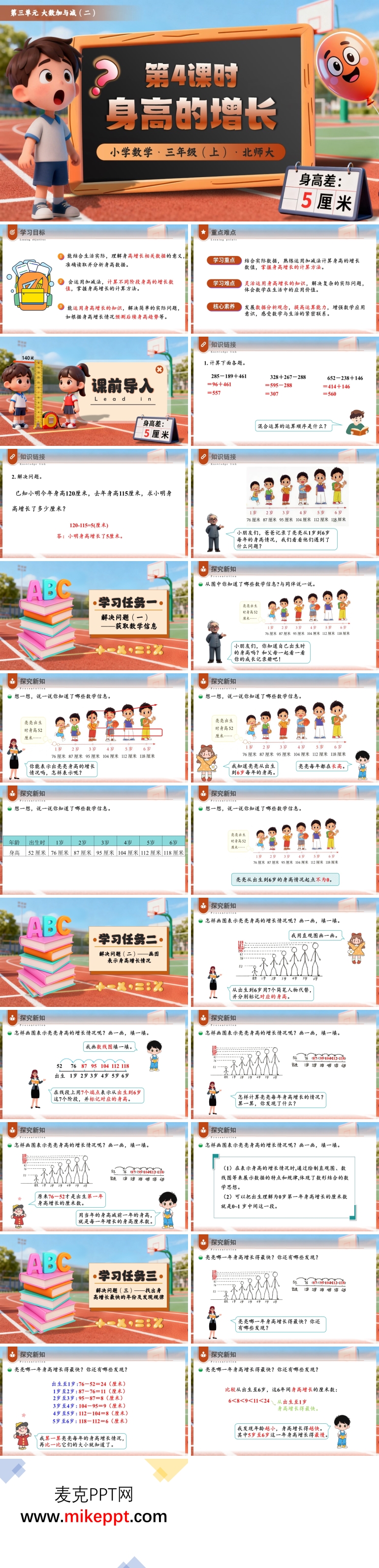 这是一套专为北师大版小学数学三年级上册第三单元第 4 课时 “身高的增长” 设计的教学课件 PPT 模板,通过 PowerPoint 制作,包含 35 张幻灯片。本课时的学习内容是小学数学中重要的加与减部分的延伸,旨在帮助学生在掌握个位和十位数加减法的基础上,进一步学习大数的加减法,并能够运用这些知识解决生活中的实际问题。 该演示文稿从五个部分展开对 “身高的增长” 这一课时的讲解。第一部分是课前导入环节,通过复习混合运算的顺序并完成相关练习题,帮助学生巩固已学知识,为本节课的学习做好准备。这一环节通过复习和练习,激活学生的思维,让学生快速进入学习状态。 第二部分是解决问题,获取数学信息。这一部分通过具体的身高增长问题,引导学生学会从题目中提取正确的信息。通过提问和引导,帮助学生理解问题的关键点,培养学生的阅读理解和信息提取能力。这一环节旨在帮助学生学会如何从复杂的情境中筛选出有用的信息,为后续的计算和分析打下基础。 第三部分是画图表示身高的增长情况。通过绘制图表,学生可以更加直观地观察到身高的变化。这一方法不仅帮助学生理解数据的变化趋势,还培养了学生的数据可视化能力。通过图表,学生可以更清晰地看到身高的增长过程,从而更好地理解数据的意义。 第四部分是找出身高增长最快的年份及发现规律。这一部分引导学生学习较大数据的加减法,并通过计算和分析,找出身高增长最快的年份。通过这一过程,学生不仅能够巩固大数加减法的技能,还能学会如何从数据中发现规律。这一环节旨在培养学生的数据分析能力和逻辑思维能力,帮助学生学会从数据中提取有价值的信息。 第五部分是达标练习和知识总结。通过一系列精心设计的练习题,检验学生对本节课知识的掌握程度,帮助学生巩固所学内容。同时,对本节课的重点知识进行系统总结,让学生对所学内容有一个清晰、完整的认识,强化记忆,为后续的学习打下坚实的基础。 这套 PPT 模板通过精心设计的教学环节,不仅帮助学生巩固了混合运算的顺序和大数加减法的技能,还通过实际问题的解决和数据的分析,提升了学生的数学应用能力和数据分析能力。通过直观的图表和互动性强的教学设计,让学生在轻松愉快的氛围中学习数学,感受数学与生活的紧密联系。