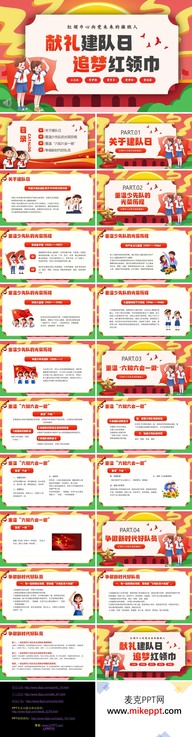 这是一套庆祝少先队建队76周年的PPT课件,共包含21张幻灯片。该课件从四个主要方面展开对少先队建队76周年的学习和庆祝活动,旨在引导少先队员们深入了解少先队的历史与精神,激发他们的荣誉感与使命感,鼓励他们在新时代中积极进取,争做优秀少先队员。 课件的第一部分聚焦于“建队日”这一重要主题。这部分详细介绍了中国少先队建队日的背景知识。中国少年先锋队是在中国共产党的创立和领导下成立的,是一个由共青团直接领导的中国少年儿童群团组织。1949年10月13日,中国少年先锋队正式成立,这一天被确立为建队日。这部分内容通过丰富的历史资料和生动的讲解,帮助少先队员们理解少先队的起源和发展,增强他们对少先队组织的认同感和归属感。 第二部分是“重温少先队的光荣历程”。这一部分通过时间线的方式,详细回顾了中国少年先锋队在不同历史时期的存在形式和名称。从1924年至1927年的劳动童子团,到1927年至1936年的共产主义儿童团,再到1937年至1945年的抗日儿童团,以及1946年至1948年的儿童团和地下少先队,直至1949年10月13日发布《在全国建立中国少年儿童队的决议》,正式成立中国少年先锋队。这部分内容通过历史的脉络,展示了少先队在不同历史阶段的使命和贡献,让少先队员们感受到少先队的光荣传统和历史担当。 第三部分是“重温‘六知六会一做’”。这一部分对少先队的基本知识和技能进行了系统的回顾和讲解。“六知”包括知道少先队的名称、队旗、队徽、队歌、队礼和呼号;“六会”则是会戴红领巾、会敬队礼、会唱队歌、会背入队誓词、会写入队申请书和会呼号;“一做”则是要求少先队员在日常生活中做好事,践行少先队的宗旨。这部分内容通过生动的讲解和实际操作演示,帮助少先队员们巩固对少先队基本知识和技能的理解和掌握,增强他们的组织纪律性和集体荣誉感。 第四部分是“争做新时代好队员”。这一部分着重强调了少先队员在新时代的责任和使命。通过引导少先队员们学习一定的理论知识,树立良好的奉献精神和带头精神,明确是非观,鼓励他们积极向上,努力学习,为实现中华民族伟大复兴的中国梦贡献力量。这部分内容通过具体的行动指南和榜样故事,激励少先队员们在学习和生活中不断进步,成为新时代的优秀少先队员。 这套PPT课件通过精心设计的内容和生动的讲解,不仅让少先队员们深入了解了少先队的历史和精神,还激发了他们的荣誉感和使命感。通过重温少先队的光荣历程和基本知识,少先队员们更加明确了自己在新时代的责任和使命。通过引导他们树立正确的价值观和积极的生活态度,这套课件为培养新时代的优秀少先队员提供了有力的支持和指导。