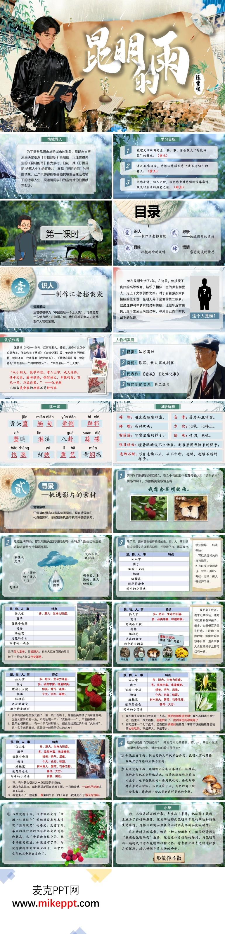 这是一套关于部编版语文八年级上册第四单元《昆明的雨》的PPT课件,共包含43张幻灯片。本节课的设置旨在帮助学生梳理文章脉络,理清作者围绕“昆明的雨”所描写的景物、事件,把握文章“形散神不散”的特点。同时,通过本节课程的学习,培养学生合作学习能力与文本分析的能力,激发学生对地方风土人情的关注,培养学生对传统文化与生活之美的感知力。该套PPT从四个方面展开本节课程的学习。 课程设计与实施 第一部分:识人——制作汪老档案袋 这一部分首先通过一段人生经历,引导学生认识作者汪曾祺,并对其籍贯、身份、代表作与昆明的关系进行整理。通过这种档案袋的形式,学生可以更系统地了解作者的背景知识,为深入理解课文内容打下基础。同时,该部分还对本篇课文的生字、词语进行了详细学习,帮助学生扫清阅读障碍,确保他们能够准确理解课文内容。 第二部分:寻景——挑选影片的素材 这一部分主要针对本篇课文中的景、物、人、事进行特点概括。通过具体的例子和分析,引导学生找出文中所描写的景物、事件,并概括其特点。这一环节旨在帮助学生提高文本分析能力,理解作者如何通过这些景物和事件来表达对昆明的深厚情感。通过小组合作的方式,学生可以相互讨论,分享各自的见解,培养合作学习能力。 第三部分:品味——拍摄雨中的风味 这一部分通过具体的句子和段落,引导学生品味文中所描写的雨中景物和风味。通过分析文中的细节描写,学生可以更好地感受昆明的雨带来的独特美感和生活情趣。这一环节不仅帮助学生理解文章的语言美,还培养了他们的审美能力和情感感知力。 第四部分:悟情——感受淡淡的情思 这一部分主要引导学生感受文中所表达的淡淡情思。通过分析作者对昆明的描写,学生可以理解作者对昆明的深厚情感,以及这种情感如何贯穿全文。这一环节旨在帮助学生理解文章的主旨,感受作者对地方风土人情的热爱,激发学生对传统文化和生活之美的感知力。 PPT内容结构 第一部分:识人——制作汪老档案袋 认识作者汪曾祺:通过一段人生经历,引导学生认识作者汪曾祺,了解其籍贯、身份、代表作与昆明的关系。 制作档案袋:学生整理作者的背景知识,形成一个系统的档案袋,帮助他们更好地理解作者的创作背景。 学习生字词语:详细学习课文中的生字和词语,确保学生能够准确理解课文内容。 第二部分:寻景——挑选影片的素材 概括景物和事件:引导学生找出文中所描写的景物、事件,并概括其特点。 小组合作分析:通过小组讨论,学生可以相互帮助,分享各自的见解,提高文本分析能力。 理解文章脉络:通过分析景物和事件,学生可以更好地理解文章的脉络,把握“形散神不散”的特点。 第三部分:品味——拍摄雨中的风味 分析细节描写:通过具体的句子和段落,引导学生品味文中所描写的雨中景物和风味。 感受语言美:通过分析文中的细节描写,学生可以更好地感受昆明的雨带来的独特美感和生活情趣。 培养审美能力:通过品味语言,学生可以提升自己的审美能力和情感感知力。 第四部分:悟情——感受淡淡的情思 分析情感表达:通过分析作者对昆明的描写,引导学生感受文中所表达的淡淡情思。 理解文章主旨:通过讨论和分析,学生可以更好地理解文章的主旨,感受作者对昆明的深厚情感。 激发情感共鸣:通过感受作者的情感,激发学生对地方风土人情的热爱,培养对传统文化和生活之美的感知力。 总结 这套PPT课件内容丰富,结构清晰,通过四个部分的系统学习,能够有效地帮助学生深入理解《昆明的雨》的内涵和艺术特征。通过识人、寻景、品味和悟情,学生不仅能够梳理文章脉络,理解“形散神不散”的特点,还能提升文本分析能力和合作学习能力。这种系统化的学习方式有助于学生在学习过程中形成完整的知识体系,为后续的学习打下坚实的基础。同时,通过具体的分析和讨论,学生能够更好地感受作者对昆明的深厚情感,激发对传统文化和生活之美的感知力,提升综合素质。