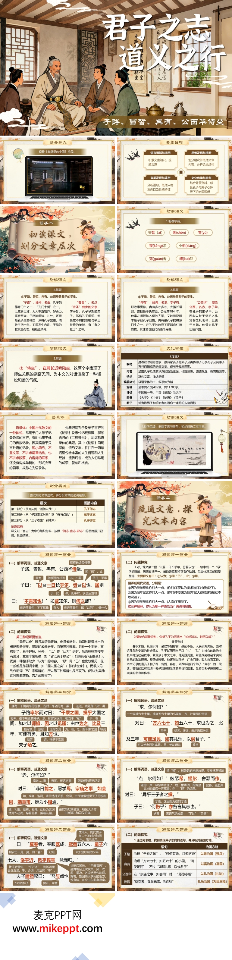 这是一套关于中职语文上册第6单元《子路曾皙冉有公西华侍坐》的PPT课件,共包含53张幻灯片。本节课的设置旨在帮助学生理清文章思路,把握孔子与四位弟子对话的内容脉络,明确每位弟子的志向特点。同时,通过本节课程的学习,引导学生逐步深入理解文本,掌握文言文阅读的基本方法,培养学生合作学习能力和批判性思维。该套PPT从五个方面展开本节课程的学习。 课程设计与实施 第一部分:初读课文,划分文章层次 这一部分的主要目标是帮助学生明确字音、了解题目意思,初步感悟文本内容。通过聆听范读,学生可以初步感受文本的韵律和节奏。接着,引导学生尝试划分文章层次,概括每部分的主要内容。这一环节不仅帮助学生初步理解文章的结构,还培养了他们的分析和概括能力。 第二部分:疏通文意,探究文本内容 这一部分主要引导学生结合课文注释,解释词语,疏通文意。通过小组合作的方式,学生可以相互讨论,解决翻译中的难点问题。这一环节旨在帮助学生深入理解课文内容,掌握文言文的翻译技巧,同时培养他们的合作学习能力。 第三部分:分析语句,鉴赏人物形象 这一部分主要针对四位弟子的对话,引导学生分析人物的性格以及塑造方法。通过具体的句子和段落分析,学生可以深入理解子路、曾皙、冉有、公西华的性格特点和志向,感受孔子对不同弟子的评价和引导。这一环节不仅帮助学生理解人物形象,还培养了他们的文学鉴赏能力。 第四部分:见微知著,探求文章主题 这一部分主要引导学生从细节入手,探求文章的深层主题。通过分析孔子与四位弟子的对话,学生可以理解孔子的思想和教育理念,如“因材施教”“循循善诱”等。这一环节旨在帮助学生理解文章的主旨,提升他们的思辨能力和文本分析能力。 第五部分:巩固提升 这一部分通过练习题和总结的方式,帮助学生巩固所学知识。通过复习重点字词、翻译句子、分析人物形象等练习,学生可以进一步加深对课文内容的理解,提升他们的文言文阅读能力。 PPT内容结构 第一部分:初读课文,划分文章层次 明确字音:通过范读,帮助学生读准文中的生字和多音字。 了解题目意思:介绍《子路曾皙冉有公西华侍坐》的背景知识,帮助学生理解文章的写作背景。 初步感悟文本内容:通过范读,引导学生初步感受文本的韵律和节奏。 划分文章层次:引导学生尝试划分文章层次,概括每部分的主要内容,培养学生的分析和概括能力。 第二部分:疏通文意,探究文本内容 结合注释翻译课文:学生结合课文注释,逐句翻译课文,解决翻译中的难点问题。 小组合作学习:通过小组讨论,学生可以相互帮助,解决翻译中的疑难问题,提升合作学习能力。 理解课文内容:通过翻译和讨论,学生深入理解课文内容,掌握文言文的翻译技巧。 第三部分:分析语句,鉴赏人物形象 分析四位弟子的对话:引导学生分析子路、曾皙、冉有、公西华的对话,理解他们的性格特点和志向。 探讨人物塑造方法:通过具体的句子和段落分析,学生可以深入理解作者如何通过对话和描写塑造人物形象。 感受孔子的评价:通过分析孔子对四位弟子的评价,学生可以理解孔子的思想和教育理念。 第四部分:见微知著,探求文章主题 从细节入手:引导学生从对话中的细节入手,探求文章的深层主题。 理解孔子的思想:通过分析孔子与弟子的对话,学生可以理解孔子的教育理念,如“因材施教”“循循善诱”等。 讨论文章主旨:通过讨论和分析,学生可以进一步理解文章的主旨,提升思辨能力和文本分析能力。 第五部分:巩固提升 练习题:通过练习题,帮助学生巩固所学知识,加深对课文内容的理解。 总结复习:通过总结复习,帮助学生梳理重点字词、翻译句子、分析人物形象等知识,提升文言文阅读能力。 总结 这套PPT课件内容丰富,结构清晰,通过五个部分的系统学习,能够有效地帮助学生深入理解《子路曾皙冉有公西华侍坐》的内涵和艺术特征。通过初读课文、疏通文意、分析语句、探求文章主题和巩固提升,学生不仅能够掌握文言文的翻译技巧,理解课文内容,还能深入体会孔子的思想,提升他们的文学鉴赏能力和思辨能力。这种系统化的学习方式有助于学生在学习过程中形成完整的知识体系,为后续的学习打下坚实的基础。同时,通过小组合作和讨论等教学手段,学生能够更好地参与课堂活动,提升综合素质。