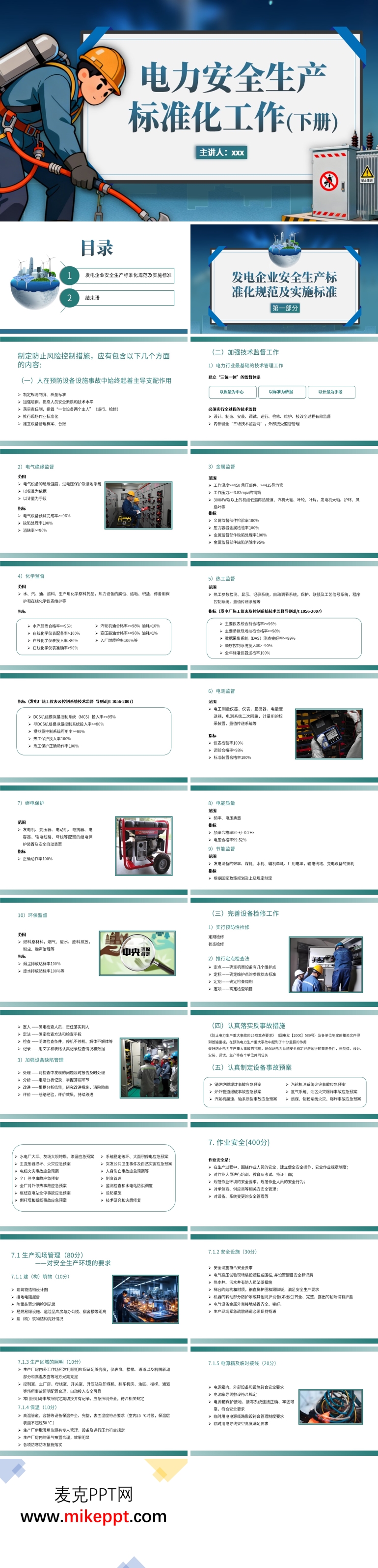 这是一套关于电力安全生产标准化工作下册的 PPT 课件,总共包含 58 张幻灯片,从两个主要方面深入剖析电力安全生产标准化工作,为电力行业的安全生产提供全面且系统的指导。 第一部分聚焦于发电企业安全生产标准化规范及实施标准,这是整个课件的核心内容。该部分首先深入探讨了发电企业在安全生产过程中如何制定有效的风险控制措施。强调了人在预防设备设施事故中的关键作用,指出人始终是主导和支配因素,通过提升人员的安全意识和操作技能,可以有效降低事故风险。同时,强调了加强技术监督工作的重要性,通过完善的技术监督体系,确保设备运行的稳定性和可靠性。此外,还提出了完善设备检修工作的要求,包括制定科学的检修计划、规范检修流程、提高检修质量等,以保障设备的正常运行。认真落实反事故措施也是该部分的重点之一,通过总结以往事故经验,制定针对性的防范措施,防止类似事故再次发生。最后,详细介绍了设备事故预案的制定和实施,包括预案的编制原则、内容、演练和评估等环节,以提高企业在面对设备事故时的应急处置能力。 在详细阐述风险控制措施的基础上,该部分还深入介绍了“作业安全”的定义及其涵盖的详细内容。明确了作业安全不仅包括作业人员的个人安全,还涉及到作业环境、作业设备、作业流程等多方面的安全因素。通过对作业安全的全面解读,为电力企业规范作业行为、加强安全管理提供了明确的指导方向。 第二部分为结束语,这部分在总结前文的基础上,进一步强调了电力行业开展安全生产标准化达标活动的重要性和紧迫性。明确指出,电力行业应以广泛开展安全生产标准化达标活动为有效载体,全面加强电力安全生产管理标准、技术标准和工作标准建设。通过建立健全的标准体系,规范电力生产从业人员的作业行为,确保每一个环节都符合安全生产的要求。同时,从管理层面和执行层面提出了详细的要求。在管理层面,要求电力企业建立健全安全生产责任制,明确各级管理人员的职责和权限,加强安全生产的监督和考核,确保安全生产工作的有序开展。在执行层面,要求一线员工严格按照操作规程进行作业,落实各项安全措施,提高自身的安全意识和操作技能,确保安全生产工作的有效执行。 整套 PPT 课件内容丰富、逻辑清晰,既涵盖了电力安全生产标准化工作的理论知识,又提供了具体的实施方法和要求。通过这套课件的学习,电力行业的从业人员可以全面了解电力安全生产标准化工作的重要性和具体内容,为电力行业的安全生产提供有力的保障。