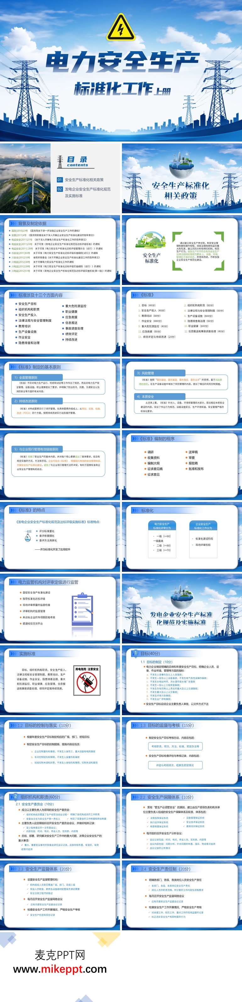 这是一套关于电力安全生产标准化工作上册的 PPT 课件,共包含 65 张幻灯片。开展这一主题的学习,对于规范电力生产流程、防控安全风险、保障供电的稳定性和人员的安全至关重要。通过系统的学习,能够提升电力行业整体的安全管理水平,为电力行业的可持续发展奠定坚实的基础。 该套 PPT 从两个主要方面展开对电力安全生产标准化工作的学习。第一部分聚焦于安全生产标准化相关政策。开篇深入探讨了相关政策的背景及制定依据,帮助学习者理解政策出台的必要性和紧迫性。随后,对“安全生产标准化”的定义进行了详细讲解,明确了其内涵和外延,为后续内容的理解提供了基础。接着,对《标准》所涉及的 13 个方面内容进行了全面梳理,包括但不限于安全管理、生产流程、设备设施等关键领域,确保学习者对标准的全面性有清晰的认识。此外,还详细讲解了标准制定的基本原则,如科学性、实用性、可操作性等,这些原则是确保标准有效实施的重要保障。在编制程序方面,详细阐述了从调研、起草、征求意见到最终审核发布的全过程,让学习者了解标准的严谨性和权威性。最后,对标准的特点进行了总结,如系统性、规范性、动态性等,这些特点使得标准能够适应电力行业的不断发展和变化。 第二部分则专注于发电企业安全生产标准化规范及实施标准。这部分详细介绍了实施标准的具体内容,从目标设定入手,明确了发电企业在安全生产标准化工作中的总体目标和阶段性目标,为企业的安全生产工作指明了方向。在组织机构和职责方面,详细阐述了企业内部各级组织机构的设置及其在安全生产标准化工作中的职责分工,确保责任明确、落实到位。安全生产投入是保障安全生产的重要基础,该部分对安全生产投入的范围、标准和管理进行了详细说明,强调了企业应如何合理安排资金,确保安全生产所需资源的充足。法律法规与安全管理制度是安全生产的基石,这部分详细介绍了与电力安全生产相关的法律法规,以及企业应如何根据这些法律法规制定和完善自身的安全管理制度,确保企业运营的合法性和安全性。教育培训是提升员工安全意识和操作技能的关键环节,该部分详细讲解了教育培训的内容、方式和考核机制,强调了持续教育的重要性。生产设备设施是电力生产的物质基础,这部分对生产设备设施的管理、维护、更新等进行了详细规范,确保设备设施的安全运行,为电力生产的稳定提供保障。 整套 PPT 课件内容丰富、结构严谨,既涵盖了政策理论,又提供了具体的实施指导。通过学习这套课件,电力行业的从业人员能够全面掌握电力安全生产标准化工作的相关内容,提升自身的专业素养,为电力行业的安全生产贡献力量。