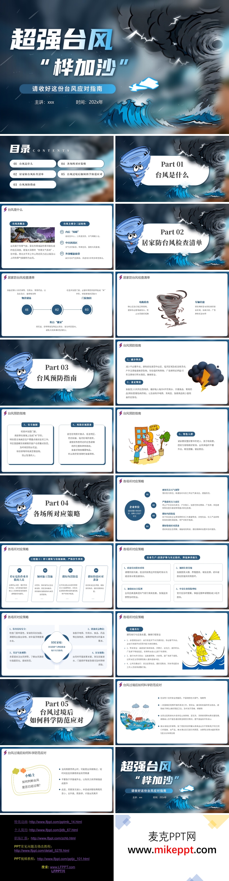 这是一套极具实用价值的超强台风“桦加沙”应对指南 PPT 课件,共包含 21 张幻灯片,从五个关键方面为大众提供全面、系统的台风应对知识,助力人们在台风来袭时能够沉着冷静、科学应对,最大限度地保障自身生命财产安全。 课件的开篇部分聚焦于“台风是什么”,深入浅出地讲解了台风的概念,明确其属于热带气旋这一气象现象范畴,并细致剖析了台风主要的三层结构。通过这部分内容的学习,人们可以对台风的本质有清晰的认知,从而在面对台风时保持理性,摒弃不必要的恐慌,以更加平和、积极的心态迎接挑战,为后续的应对措施做好充分的心理准备。 紧接着,第二部分着重介绍了居家防台风检查清单。在台风来临前,做好充分的居家防护准备至关重要。课件从三个方面展开详细说明:首先,要提前准备充足的物资,如食物、饮用水、药品、手电筒等,确保在台风期间能够满足基本生活需求;其次,将阳台上的易坠物品及时移至室内,防止这些物品被强风吹落,造成意外伤害或财产损失;最后,仔细检查并加固门窗,同时对电路进行全面检查,避免台风期间因电线短路引发火灾等安全事故。这份清单为居民提供了清晰、实用的居家防护指引,帮助大家筑牢家庭安全防线。 第三部分是台风预防指南,这是整个课件的核心内容之一。当台风真正来临时,人们需要遵循一系列关键的预防措施。课件将其归纳为五个要点:一是尽量减少外出,避免前往高空作业区、临河区域以及低洼易涝点等危险地带,降低遭遇危险的风险;二是备足物资,确保在台风期间能够维持正常生活;三是对房屋等重要设施进行安全加固,增强其抵御台风的能力;四是针对风险区域做好充分准备,居住在地质灾害点、低洼地区、危旧房屋、临河区域的居民要提前熟悉附近的应急避难场所位置和转移路线,以便在紧急情况下能够迅速、安全地撤离;五是关注特殊人群,提前妥善安置好家中的老人、孩子和病患,确保他们在台风期间得到充分的照顾和保护。这些预防指南涵盖了台风应对的各个环节,为人们提供了全面、细致的行动指引,有助于最大限度地减少台风可能带来的危害。 第四部分针对不同场所的应对策略进行了详细阐述。在超强台风“桦加沙”来袭时,企业单位、工程施工现场、农业生产区域以及交通出行等方面都面临着不同的风险和挑战。课件分别从这四个方面入手,为各场所提供了针对性强、可操作性高的应对策略。企业单位需要提前做好设备防护、人员疏散等准备;工程施工要暂停高空作业,加固施工现场设施;农业生产要采取措施保护农作物和养殖设施;交通出行则要关注路况信息,选择安全的出行方式。这些策略的制定充分考虑了不同场所的特点和需求,能够有效指导各行业在台风期间有序开展工作,降低损失。 最后一部分着眼于台风过境后的科学防范与应对。台风过后,虽然危险看似暂时解除,但仍可能存在诸多安全隐患。课件提醒大家在台风过境后要保持警惕,继续做好防范工作。例如,检查房屋受损情况,及时修复受损设施;清理道路障碍物,恢复交通秩序;关注卫生防疫,防止疾病传播等。通过这部分内容的学习,人们可以了解到台风过后的应对工作同样重要,只有科学、规范地完成后续工作,才能真正保障生活恢复正常,避免次生灾害的发生。 整套 PPT 课件内容详实、结构合理、重点突出,通过生动形象的图文展示和清晰易懂的文字说明,将超强台风“桦加沙”的应对知识传递给大众。无论是居民、企业还是相关行业从业者,都能从这套课件中获取到实用、有效的应对信息,从而在台风来袭时有条不紊地采取行动,共同抵御自然灾害的侵袭,守护家园的安宁。
