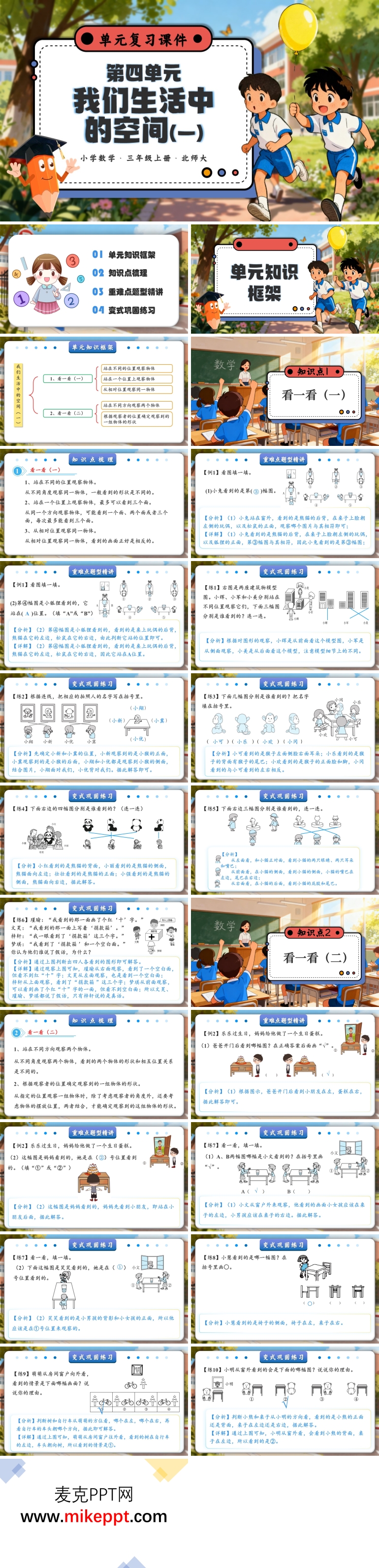 这是一套精心设计的新教材第四单元“我们生活中的空间(一)”单元复习课件,共包含 25 张幻灯片。本套课件的核心目标是助力学生构建清晰的空间观念,深刻理解同一个物体从不同角度观察会呈现出不同的视觉效果。为此,课件从四个关键部分展开,全方位、系统化地引导学生复习本单元内容。 课件的第一部分聚焦于“单元知识框架”。这一部分旨在引导学生回顾本单元的核心知识点,并借助思维导图的形式将这些知识点有机整合。思维导图以其直观、清晰的特点,能够帮助学生快速梳理知识脉络,将零散的知识点串联成完整的知识体系。在这一过程中,学生的归纳总结能力也将得到显著提升,为后续的深入学习奠定坚实基础。 第二部分是“知识点梳理”。该部分对本单元的各个知识点进行了细致入微的讲解,确保学生对每一个概念、每一个原理都了然于心。通过对知识点的逐一剖析,学生可以更加准确地把握本单元的重点和难点,填补知识漏洞,进一步巩固对空间观念的理解。 第三部分为“重难点题型精讲”。在这一部分,课件精选了具有代表性的例题,通过详细分析解题思路和步骤,帮助学生深入理解“从不同角度观察物体”这一关键知识点。通过对具体题目的剖析,学生能够更好地将理论知识与实际问题相结合,从而提高解决实际问题的能力。这一部分不仅注重知识的传授,更注重解题技巧的培养,帮助学生在面对复杂问题时能够灵活运用所学知识。 第四部分是“变式巩固练习”。该部分对知识点进行了拓展与延伸,通过多样化的练习题,引导学生从不同角度思考问题,进一步深化对知识点的理解。这些练习题不仅有助于学生巩固复习,更能够加强学生对知识点的应用能力,使学生在不同的情境下都能熟练运用所学知识,真正做到学以致用。 整套课件内容丰富、结构严谨、逻辑清晰,通过图文并茂的形式和层层递进的教学设计,充分调动了学生的学习积极性和主动性。无论是教师的教学还是学生的学习,这套课件都具有极高的实用价值。它能够帮助学生在复习过程中系统地回顾知识,提升思维能力,增强空间观念,为学生在数学学习中进一步探索空间世界提供了有力支持。