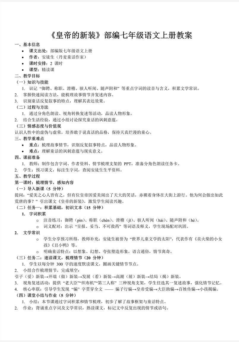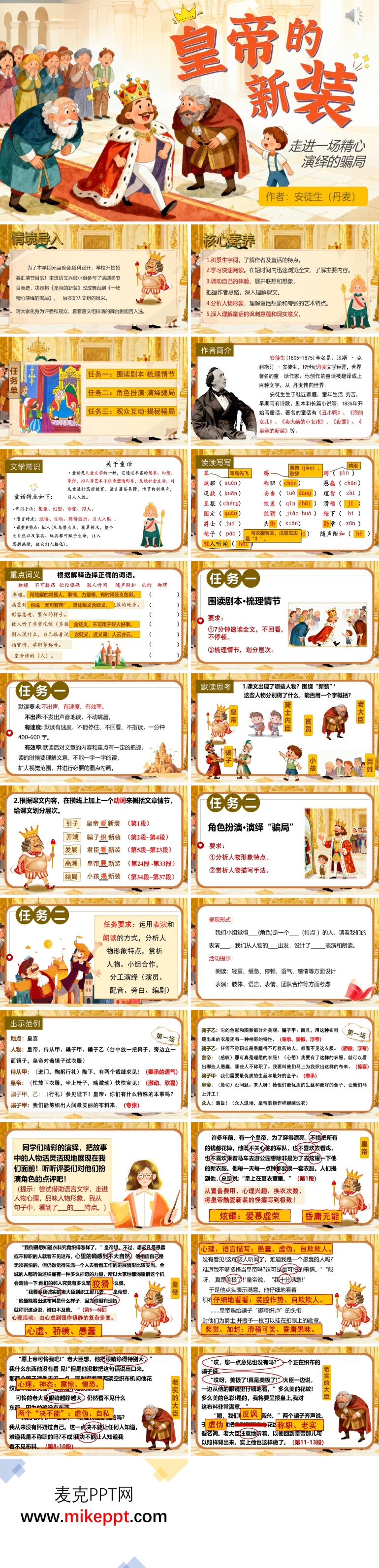 这是一套部编版七年级语文上册《皇帝的新装》的PPT课件,通过PowerPoint精心制作而成,共包含39张幻灯片。《皇帝的新装》是丹麦著名童话作家安徒生的经典作品,通过学习这篇文章,能够有效引导学生掌握快速阅读的方法,梳理故事情节,并进行生动的复述。同时,学生还能识别童话中反复叙事的特点,理解其独特的表达效果。 这份演示文稿主要从四个部分展开对《皇帝的新装》的讲解。第一部分是情景导入和核心素养介绍。通过创设情境,激发学生的学习兴趣,并明确本节课的学习目标和核心素养要求。 第二部分是围读剧本,梳理情节。这一部分不仅详细介绍了作者安徒生的生平和创作背景,还涵盖了童话的文学常识以及文中的一些生字难词。通过引导学生快速阅读课文,梳理故事情节,划分层次,并对具体问题进行深入思考,帮助学生更好地理解文章内容。 第三部分是角色扮演,演绎“骗局”。这一部分通过表演和朗读的方式,引导学生分析人物特点,赏析人物形象。通过小组合作分工演绎,让学生更深入地理解人物性格和故事内涵。同时,教师还对课文中的细节进行了详细讲解,帮助学生更好地把握文章的精髓。 第四部分是观众互动,揭秘骗局。这一部分主要引导学生结合故事背景发表自己的看法,鼓励学生积极思考,大胆表达自己的观点,培养学生的批判性思维和独立思考能力。 通过这四个部分的精心设计,这份PPT课件能够有效引导学生深入学习《皇帝的新装》,提升他们的阅读能力、文学素养和思维能力。