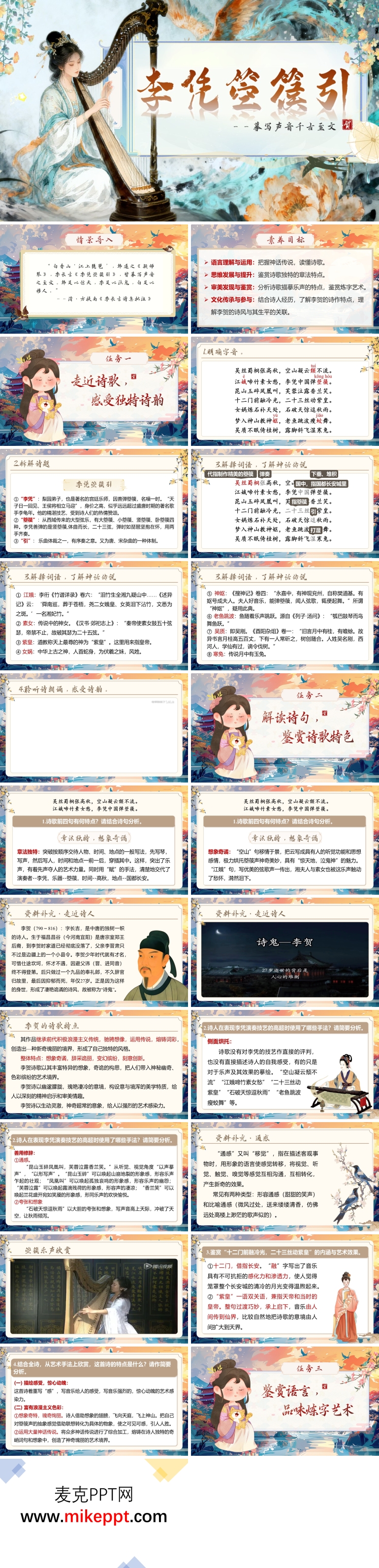 这是一套中职语文上册《李凭箜篌引》的PPT课件,通过PowerPoint精心制作,共包含32张幻灯片。本节课的学习目标是引导学生通过学习了解李贺的生平以及诗歌的特点,同时感受诗歌语言的音乐美和意境美。 这份演示文稿主要从五个部分展开对《李凭箜篌引》的讲解。第一部分是情境导入和素养目标的介绍。通过创设情境,激发学生的学习兴趣,并明确本节课的学习目标,为学生的学习奠定基础。 第二部分是走进诗歌,感受独特诗韵。这一部分主要帮助学生认识本节课的生字,分析文章题目的意义,同时解释文章中的难词。通过这一环节,学生能够更好地理解诗歌的基本内容,为后续的深入学习做好准备。 第三部分是解读诗句,鉴赏诗歌特色。这一部分主要引导学生结合诗句进行分析,深入探讨诗歌每一部分的特点。通过逐句解读,学生能够更好地理解诗歌的结构和内容,感受李贺诗歌的独特魅力。 第四部分是鉴赏语言,品味炼字艺术。这一部分通过具体问题提问的方式,引导学生更深入地思考文章中的妙处。通过对诗歌语言的细致分析,学生能够更好地体会李贺诗歌的炼字艺术,感受诗歌语言的精妙之处。 第五部分是对比阅读。通过与其他相关作品的对比,进一步加深学生对《李凭箜篌引》的理解和感悟。这种对比阅读的方式能够帮助学生拓宽文学视野,提升文学鉴赏能力。 通过这五个部分的精心设计,这份PPT课件能够有效引导学生深入学习《李凭箜篌引》,提升他们的语文素养和文学鉴赏能力,同时培养他们对古典文学的热爱和对传统文化的尊重。