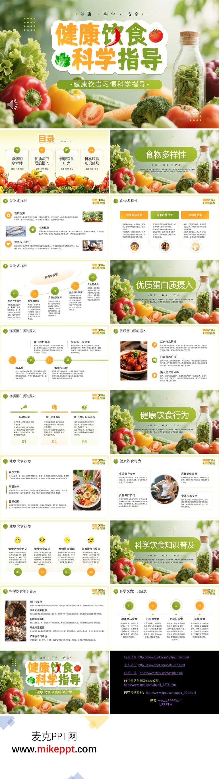 饮食是维持人体正常运转的基础,与每个人的身体健康息息相关。健康的饮食能为身体精准供给所需的各类营养物质,如蛋白质、维生素、矿物质等,助力构建强健的体魄,增强免疫力,降低疾病风险;然而,如何科学搭配饮食以实现健康目标,却是一门需要系统学习的学问。为此,这套通过 PowerPoint 制作、包含 18 张幻灯片的健康饮食科学指导 PPT 模板,从四个关键维度出发,为大众提供了全面且实用的健康饮食解决方案,无论是普通人群日常饮食规划,还是特定需求下的饮食调整,都能从中获取专业指导。 第一部分聚焦 “食物多样性”,这是健康饮食的核心原则之一。模板首先围绕肉类食物选择展开,明确提出 “优选瘦肉、适量摄入禽肉、控制红肉比例” 的原则,例如推荐鸡胸肉、鱼肉等低脂高蛋白肉类,同时提醒减少五花肉、加工肉制品的食用,帮助人们在满足口腹之欲的同时兼顾健康;接着对蛋类营养进行深度分析,详细解读鸡蛋中蛋白质、卵磷脂、维生素 A、维生素 D 等营养成分的含量与作用,破除 “吃鸡蛋会升高胆固醇” 的误区,给出 “健康成年人每天 1 个鸡蛋” 的科学建议;最后系统介绍奶制品种类,涵盖纯牛奶、酸奶、奶酪等,分别说明不同奶制品的营养特点与适用人群,比如乳糖不耐受者可选择无乳糖牛奶或酸奶,为不同需求的人群提供多样化的奶制品选择方向。 第二部分重点讲解 “优质蛋白的摄入”,深入剖析优质蛋白相关营养素对人体的益处。模板先介绍氨基酸的重要性,指出优质蛋白含有人体必需的 8 种氨基酸,且氨基酸模式与人体接近,更容易被人体吸收利用,是构成身体细胞、修复组织、增强免疫力的关键;随后强调蛋白质含量高的食物优势,列举瘦肉、鱼虾、蛋类、奶制品、豆制品等优质蛋白来源,说明充足摄入这类食物能维持身体正常生理功能,促进生长发育,尤其对儿童青少年、老年人、术后恢复人群至关重要;同时,还介绍了不饱和脂肪酸的益处,指出深海鱼、坚果、橄榄油等食物中的不饱和脂肪酸,能调节血脂、保护心血管健康,减少心血管疾病的发生风险;最后提及低脂肪低热量食物的价值,说明在摄入优质蛋白的同时,选择低脂肪低热量的食物,既能满足营养需求,又能控制体重,避免因热量过剩导致肥胖及相关并发症。 第三部分围绕 “健康饮食行为” 展开,为大众提供可落地的日常饮食操作指南。模板首先明确每天的餐次安排,推荐 “三餐规律、定时定量” 的模式,强调早餐要营养丰富,包含主食、优质蛋白、蔬果,为一天提供充足能量;午餐要均衡搭配,保证主食、肉类、蔬菜的合理比例;晚餐则需清淡易消化,避免过量进食影响睡眠与消化功能,同时提醒可根据个人需求在两餐之间适量加餐,选择水果、坚果等健康零食;接着讲解分量控制的方法,通过具体例子说明每餐主食、肉类、蔬菜的建议摄入量,比如每餐主食约一拳大小,肉类约一掌大小,蔬菜约两拳大小,帮助人们直观掌握饮食分量,避免暴饮暴食或营养不足;最后介绍量杯的使用,说明量杯可精准测量油、盐、糖等调味品的用量,助力控制每日油盐糖摄入,符合《中国居民膳食指南》中 “每日烹调油不超过 25-30 克、食盐不超过 5 克、添加糖不超过 50 克” 的建议,培养健康的饮食习惯。 第四部分致力于 “科学饮食知识普及”,重点关注特殊人群的饮食调理。模板针对患有不同疾病的人群,提供个性化的饮食指导方案:对于高血压患者,建议减少钠盐摄入,增加钾元素丰富的食物,如香蕉、菠菜、海带等,同时控制脂肪和胆固醇摄入,避免食用腌制食品、油炸食品;糖尿病患者则需注重主食粗细搭配,选择低升糖指数的食物,如燕麦、糙米、杂豆等,控制总热量摄入,定时定量进餐,避免血糖大幅波动;高血脂患者应减少饱和脂肪和反式脂肪摄入,增加不饱和脂肪酸摄入,多吃蔬菜、水果、全谷物,适量食用鱼类和坚果;胃肠道疾病患者需选择易消化、温和的食物,避免辛辣、生冷、油腻食物,规律进餐,细嚼慢咽,减轻胃肠道负担。通过这些针对性的饮食建议,帮助患病人群通过科学饮食辅助疾病治疗与康复,提高生活质量,同时也让大众了解不同疾病的饮食禁忌与调理方法,增强对特殊人群饮食需求的认知。