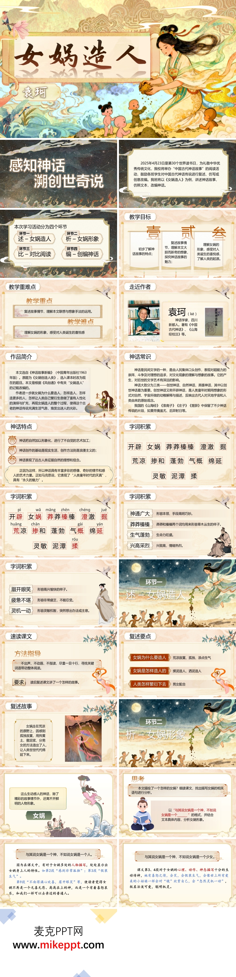 这是一套部编版语文七年级上册《女娲造人》的PPT课件,包含38张幻灯片。本节课旨在帮助学生梳理文章脉络,概括女娲造人的起因、经过和结果,把握故事的主要情节。同时,通过本节课的学习,学生将初步了解神话的特点,学会从情节、形象、主题等角度赏析神话故事,体会想象在神话创作中的重要作用。 该套PPT从四个方面展开本节课程的学习。课程伊始,首先带领学生初步了解本篇课文的作者、神话常识及特点等知识,为后续学习做好铺垫,引出本节课的学习主题。 第一部分为“述—女娲造人”。该部分主要引导学生速读课文,通过快速浏览和提取关键信息,掌握故事的整体内容及要点,帮助学生对女娲造人的故事形成初步的整体认知,为深入分析奠定基础。 第二部分为“析—女娲形象”。该部分聚焦于女娲这一核心人物形象,引导学生结合文中描写女娲的相关语句,深入分析女娲的性格特点和形象内涵。通过对具体语句的分析和讨论,学生能够更深刻地理解女娲作为创世神的形象特征,感受其在神话故事中的独特魅力和象征意义。 第三部分为“比—对比阅读”。通过与其他相关神话故事的对比,引导学生发现不同神话在情节、人物形象、主题等方面的异同点。这种对比阅读的方式能够帮助学生拓宽视野,加深对神话故事的理解,培养他们的比较分析能力和批判性思维。 第四部分为“编—创编神话”。该部分鼓励学生发挥自己的想象力,创编女娲造人的其他方法。通过创编活动,学生不仅能够进一步加深对原文的理解,还能激发他们的创造力和想象力,提高他们的语言表达能力和思维能力。 通过这四个部分的精心设计,这份PPT课件能够有效引导学生深入学习《女娲造人》,提升他们的语文素养和文学鉴赏能力,同时培养他们对传统文化的兴趣和尊重。