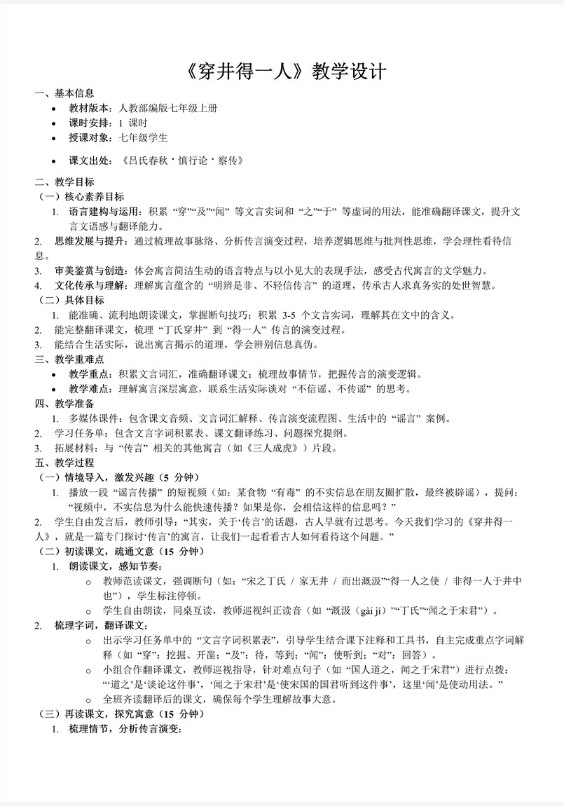 这是一份与部编版七年级语文上册课文《穿井得一人》相关的演示文稿,共包含30张幻灯片。在本节课的教学过程中,教师首先会播放一段视频,以此来向学生提出问题,引导学生自由发言,从而顺利地引入课堂主题。接下来,教师会组织学生朗读课文,让学生在朗读中初步感知课文的结构。随后,教师会向学生明确本堂课的学习任务,引导学生结合课文内容来梳理故事情节,并深入分析传言的演变过程。在课程的最后阶段,教师会结合生活实际,引导学生深入思考相关问题,提炼出寓言所蕴含的道理,让学生学会理性看待信息、辨别信息的真伪。 这份演示文稿由五个部分组成。第一部分是教学目标和重难点的阐述,主要引导学生对“得一人”的内涵进行深入分析,并探究其背后的原因。第二部分是“我是大侦探之查事件”,在这一部分中,首先会介绍与课文相关的作品知识,然后通过读懂故事来还原事情的真相,最后对故事的过程进行清晰的梳理和准确的复述。第三部分是“我是大侦探之侦流言”,这一部分主要探讨流言产生的原因,引导学生寻根究底,最终使真相大白于天下。第四部分是“我是大侦探之究其理”,引导学生深入探究课文所蕴含的道理。第五部分是文言积累,主要包括一词多义、古今异义和词类活用等内容,帮助学生更好地理解和掌握文言文知识。
