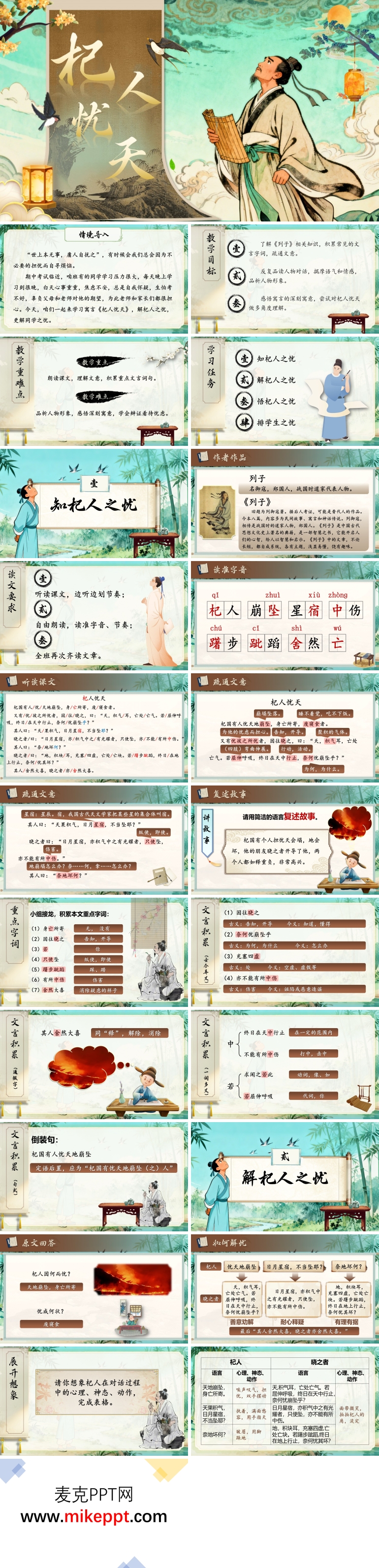 这是一套与部编版七年级语文上册课文《杞人忧天》相关的演示文稿,共有34张幻灯片。通过本节课的学习,学生不仅能够准确地朗读课文,掌握文言断句的技巧,还能有效提升文言文阅读理解能力。教师通过引导学生梳理杞人担忧的内容以及他人劝解的逻辑,进一步培养学生的逻辑思维和辩证思维能力,帮助他们学会区分合理担忧与过度焦虑,从而树立理性的处世态度和积极健康的心态。 这份演示文稿由四个部分组成。第一部分是“知杞人之忧”。在这一部分中,教师首先对列子及其作品《列子》进行详细介绍,帮助学生了解课文的背景知识。接着,展示文章中的重点字音和字词,引导学生正确读音和理解词义。最后,通过疏通课文大意,引导学生复述故事内容,加深对课文的理解。 第二部分是“解杞人之忧”。这一部分首先要求学生通过对话内容来完成表格,梳理杞人担忧的具体内容和他人劝解的过程。接着,教师引导学生分析杞人和劝解者的语言、心理和神态动作,帮助学生深入理解角色的性格特点和行为动机。最后,通过角色扮演活动,增强学生的参与感和体验感,进一步加深对课文内容的理解。 第三部分是“悟杞人之忧”。在这一部分中,教师引导学生深入思考杞人担忧的合理性,分析其背后的心理因素,帮助学生理解杞人的行为是一种典型的过度焦虑。通过这一环节,学生能够更好地理解课文的寓意,学会从多个角度分析问题。 第四部分是“排学生之忧”。这一部分主要引导学生将课文内容与生活实际相结合,正确看待生活中的忧虑。教师通过讨论和引导,帮助学生学会区分合理担忧和过度焦虑,培养他们理性思考和积极面对问题的能力,从而树立积极健康的心态,更好地应对生活中的各种挑战。