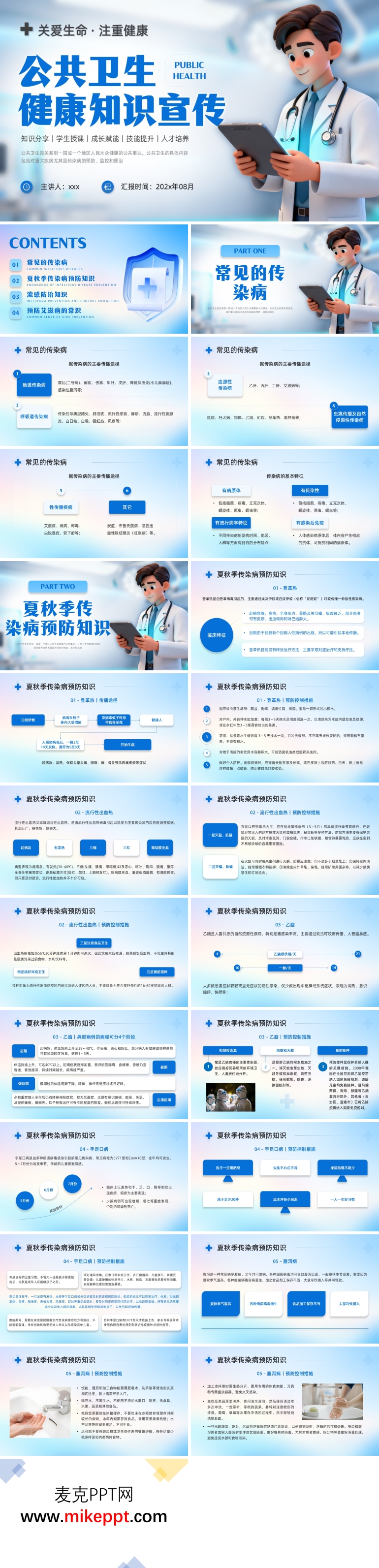 这是一套精心制作的公共卫生健康知识 PPT 课件,通过 PowerPoint 制作,共包含 36 张幻灯片。该课件以重大疾病,尤其是常见传染病的认识、预防和治疗为核心内容,旨在帮助公众更好地掌握健康知识,提升公共卫生意识。 课件内容结构 第一部分:常见传染病介绍 这一部分详细介绍了几种主要的传染病类型,包括肠道传染病、呼吸道传染病和血源性传染病。通过具体案例和科学数据,帮助公众了解这些传染病的传播途径、常见症状和危害性。例如,肠道传染病主要通过污染的食物和水传播,而呼吸道传染病则通过飞沫传播。了解这些基本知识,有助于公众在日常生活中采取有效的预防措施。 第二部分:夏秋季传染病预防知识 夏秋季节是多种传染病的高发期,因此这部分内容尤为重要。详细介绍了登革热、流行性出血热、乙脑、手足口病、腹泻病和流感等常见传染病的定义、传播途径和预防措施。例如,登革热主要通过蚊虫叮咬传播,预防措施包括使用蚊帐、驱蚊剂和清理积水等。通过这些具体而实用的知识,公众可以更好地保护自己和家人免受传染病的侵害。 第三部分:流感防治知识 流感是一种常见的呼吸道传染病,尤其在冬季高发。这一部分深入介绍了流感的病因、症状、传播途径以及预防和治疗方法。强调了接种流感疫苗的重要性,以及在流感季节保持良好个人卫生习惯的必要性。通过这些知识,公众可以更好地应对流感疫情,减少流感对健康的影响。 第四部分:预防艾滋病的常识 随着全球艾滋病感染人数的不断上升,艾滋病预防已成为公共卫生领域的重点科普内容之一。这一部分详细介绍了艾滋病的传播途径、危害性以及预防措施。通过科学、客观的讲解,帮助公众消除对艾滋病的误解和恐惧,增强自我保护意识。例如,强调安全性行为、避免共用针具等预防措施,以及定期进行艾滋病检测的重要性。 课件特点 内容丰富:涵盖了多种常见传染病和公共卫生问题,信息量大,覆盖面广。 科学实用:以科学数据和实际案例为基础,提供实用的预防和治疗建议。 图文并茂:通过生动的图片和图表,使复杂的医学知识更易于理解和接受。 互动性强:设计了问答和讨论环节,鼓励公众积极参与,增强学习效果。 通过学习这套 PPT 课件,公众可以全面了解公共卫生健康知识,掌握常见传染病的预防和治疗方法,增强自我保护能力,为维护个人和社区的健康做出贡献。