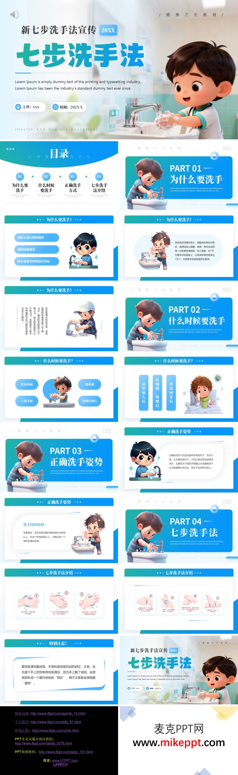 这套聚焦七步洗手法的PPT课件共包含17张幻灯片,以逻辑清晰的四大模块层层递进,系统传递科学洗手的核心知识,兼具专业性与实用性,尤其适合面向学生群体开展健康科普教育。 第一模块“为什么要洗手?”直击核心,深入阐释洗手的重要意义。手部作为人体与外界接触最频繁的部位,极易成为细菌、病毒的“传播载体”,而规范洗手能有效清除手部污物与病原微生物,从源头切断传播链条。该部分重点强调,正确洗手不仅可预防手足口病、诺如病毒感染等接触性传染病,还能降低流感、肺炎等呼吸道疾病的传播风险,是维护个人健康和公共卫生的关键防线,让学习者充分认识到洗手并非简单的卫生习惯,更是保障健康的“第一道屏障”。 第二模块“什么时候要洗手?”精准梳理关键洗手时间点,为日常行为提供明确指引。课件明确列出多个必须洗手的场景:餐前餐后、便前便后、擤鼻涕、打喷嚏或咳嗽后,处理生肉、蛋类等食材前后,接触垃圾、宠物或其排泄物后,以及外出归来、接触公共物品后等。这些具体场景的列举,让学习者能快速对应自身生活,将洗手意识融入日常细节,避免因遗漏关键节点而增加感染风险。 第三模块“正确洗手姿势”聚焦操作规范,详解洗手的核心要素。除了演示流动水冲洗、使用肥皂或洗手液等基础步骤,还特别强调洗手的时长——每次洗手应持续不少于20秒,确保充分揉搓手部各个部位,避免“走过场”式洗手。该部分通过清晰的动作指引,纠正学习者可能存在的误区,让大家明白只有姿势正确、时间充足,才能达到理想的清洁效果。 第四模块“七步洗手法”是课件的核心内容,采用图文结合的方式直观呈现操作流程。从“掌心相对,手指并拢相互揉搓”,到“手心对手背沿指缝相互揉搓”,再到“弯曲手指使关节在另一手掌心揉搓”等七个步骤,每一步都配有清晰的图示和详细的文字说明,帮助学习者准确掌握动作要领。这种可视化的呈现方式,能有效提升学习兴趣和记忆效果,确保学生在实际操作中能规范执行七步洗手法,彻底清除手部细菌,切实守护自身健康。整套课件结构完整、重点突出,为开展科学洗手教育提供了优质的教学资源。
