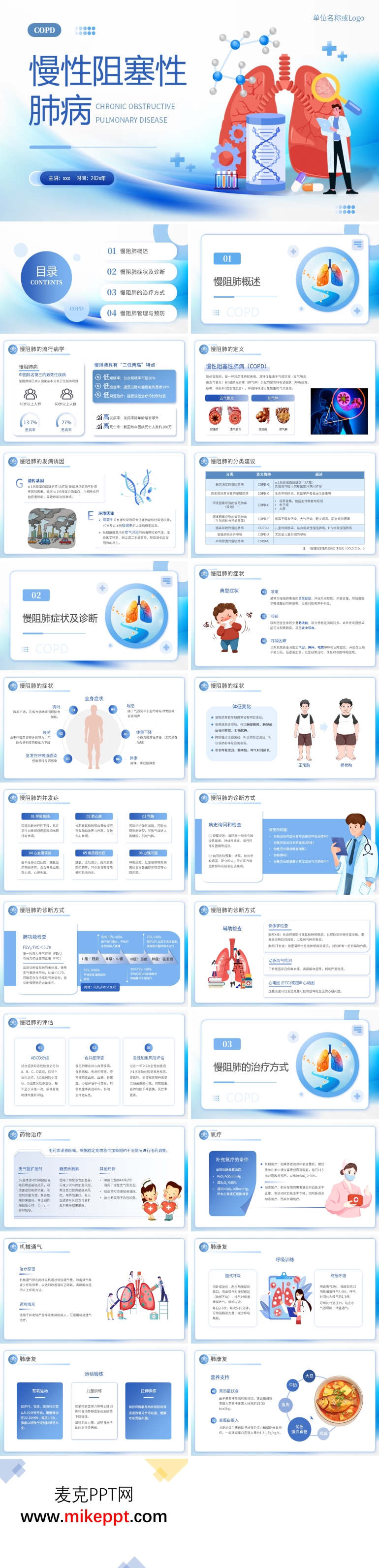 这是一套精心制作的关于慢性阻塞性肺病(慢阻肺)的PPT模板,通过PowerPoint软件制作而成,共包含33张幻灯片。慢阻肺作为一种严重的呼吸系统疾病,在中国的致死性疾病中排名第三,仅次于心脏病和中风。鉴于其对公众健康的巨大威胁,慢阻肺已被纳入国家基本公共卫生服务项目,国家正通过各种渠道积极推广相关知识,以提高公众对这一疾病的认知,帮助人们根据自身情况采取有效的预防和治疗措施。 这份演示文稿从四个主要部分对慢阻肺进行了全面而详细的讲解: 第一部分:慢阻肺概述 这部分首先对慢阻肺的定义进行了清晰的阐述,帮助观众理解这一疾病的本质。接着,深入探讨了慢阻肺的发病诱因,包括长期吸烟、空气污染、职业暴露、反复呼吸道感染等,这些因素都可能增加患慢阻肺的风险。此外,还对慢阻肺的分类进行了介绍,帮助观众更好地理解不同类型的慢阻肺及其特点。 第二部分:慢阻肺症状及诊断 这一部分详细介绍了慢阻肺的典型症状,如持续的咳嗽、咳痰以及逐渐加重的呼吸困难。除了这些主要症状外,患者还可能出现一系列并发症,如肺心病、呼吸衰竭等。在诊断方面,通过肺功能检查、影像学检查(如X光、CT)、动脉血气检测、心电图或超声心电图等多种检查手段,可以准确地诊断慢阻肺,并评估其严重程度。这些检查方法对于早期发现和治疗慢阻肺至关重要。 第三部分:慢阻肺的治疗方式 这部分全面介绍了慢阻肺的多种治疗方式。药物治疗是基础,包括使用支气管扩张剂、糖皮质激素等药物来缓解症状和控制炎症。氧疗对于改善患者的缺氧状况非常有效,可以提高生活质量。在病情严重时,机械通气可以提供必要的呼吸支持。肺康复则通过一系列的训练和指导,帮助患者增强呼吸功能。手术治疗在某些特定情况下也是可行的选择,如肺减容手术或肺移植。此外,对于慢阻肺急性加重期的处理也进行了详细说明,这对于控制病情进展和减少住院次数至关重要。 第四部分:慢阻肺管理与预防 这部分强调了慢阻肺的管理与预防的重要性。首先,介绍了如何控制危险因素,如戒烟、减少空气污染暴露等,这些措施可以有效降低患病风险。其次,强调了定期筛查与评估的重要性,通过早期发现和及时治疗,可以延缓疾病进展。最后,还介绍了家庭照护的重要性,包括如何为患者提供一个良好的生活环境、如何进行日常护理等,这对于患者的康复和生活质量的提升具有重要意义。 通过这份演示文稿,观众可以系统地了解慢阻肺的相关知识,包括其定义、症状、诊断、治疗以及管理与预防。这对于提高公众对慢阻肺的认知水平,促进早期发现和治疗,以及改善患者的生活质量具有重要的意义。
