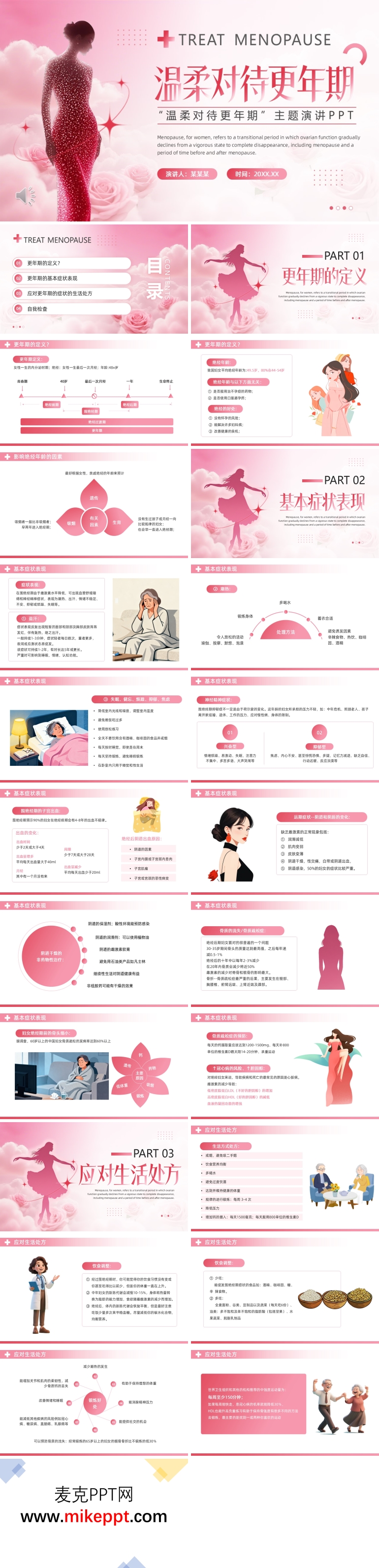 这是一套关于如何温柔对待更年期的演示文稿,共包含31张幻灯片。更年期是女性生命中一个重要的转折点,它标志着女性从生育期逐渐过渡到非生育期。在这个过程中,女性会经历一系列复杂的生理和心理变化,这些变化可能会给她们的生活带来诸多不便和困扰。因此,开展更年期相关课程,帮助女性了解更年期的保健知识,对于她们平稳度过这一关键阶段至关重要。这份演示文稿从饮食、运动、心理调适和医疗护理等多个方面,为女性提供了全面的更年期保健指导。 演示文稿由四个部分组成。第一部分聚焦于更年期的定义。该部分首先对更年期的含义进行了详细的介绍,帮助观众理解这一生理阶段的本质。接着,探讨了绝经的平均年龄以及绝经可能带来的好处,如减少某些妇科疾病的风险。最后,分析了影响绝经的因素,包括遗传、生活方式和环境等,让女性能够更好地了解自己身体的变化。 第二部分深入探讨了更年期的基本症状表现。这一部分首先列举了常见的生理症状,如盗汗、潮热、失眠和健忘等,这些症状可能会严重影响女性的生活质量。接着,讨论了更年期可能出现的神经精神症状,如情绪波动、焦虑和抑郁等。最后,特别强调了骨质疏松症的预防,这是一种在更年期女性中较为常见的疾病,通过合理的饮食和适当的运动可以有效预防。 第三部分提供了应对更年期症状的生活处方。这一部分主要从生活方式调整、饮食调整和锻炼身体三个方面入手。生活方式的调整包括保持良好的作息习惯、减少压力和保持积极的心态。饮食调整则建议增加富含钙、维生素D和植物雌激素的食物摄入,同时减少咖啡因和酒精的摄入。锻炼身体方面,推荐进行有氧运动和力量训练,以增强体质和改善骨密度。 第四部分是自我检查。这一部分教导女性如何进行自我检查,以便及时发现身体的异常变化。包括定期检查乳房、关注月经变化和监测情绪波动等。通过自我检查,女性可以更好地了解自己的身体状况,及时寻求医疗帮助,从而更好地管理更年期带来的各种挑战。 通过这份演示文稿,女性可以获得关于更年期保健的全面知识,从而更好地应对这一生命阶段带来的各种变化。无论是通过调整生活方式,还是通过合理的饮食和适当的运动,亦或是通过心理调适和医疗护理,这些方法都有助于女性在更年期保持健康和活力,享受生活的每一个阶段。