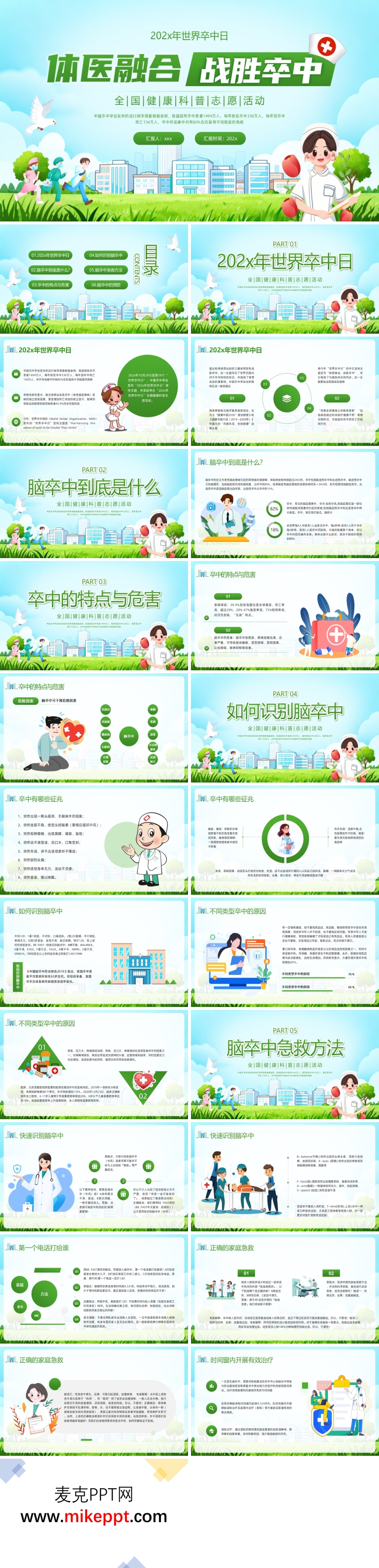 这是一套关于2025年世界卒中日的演示文稿,共包含32张幻灯片。世界卒中组织的研究显示,高达90%的卒中是可以有效预防的。因此,设立世界卒中日的目的在于提高公众对卒中危险因素的认识,增强对脑卒中的了解,并学习预防卒中的方法。通过这些努力,公众可以在日常生活中积极采取预防措施,构建起防控卒中的健康防线,从而减轻这一疾病对个人、家庭和社会造成的沉重负担。 这份演示文稿由六个部分组成: 第一部分:世界卒中日的设立目的 这部分详细阐述了世界卒中日的确立目的。通过设立这一特殊的日子,旨在提高公众对卒中这一严重疾病的认知,普及卒中预防知识,鼓励人们在生活中采取积极的预防措施,以减少卒中的发生率。 第二部分:脑卒中的概念 这一部分首先介绍了脑卒中的定义,即脑血管破裂或阻塞导致脑部血液循环障碍,引发脑组织损伤的疾病。接着,对脑卒中进行了分类,包括缺血性脑卒中(如脑梗塞)和出血性脑卒中(如脑出血)。最后,简要说明了脑卒中的发病过程,帮助观众理解这一疾病的发展机制。 第三部分:卒中的特点与危害 这部分强调了脑卒中的高发病率和严重危害。脑卒中不仅会导致身体功能障碍,如肢体瘫痪、语言障碍等,还会对患者的精神状态产生影响,如引发抑郁和焦虑等心理问题。这些后果不仅严重影响患者的生活质量,还给家庭和社会带来了沉重的负担。 第四部分:识别脑卒中的方法 这部分介绍了如何快速识别脑卒中的症状。通过“FAST”口诀(Face:面部表情,是否一侧歪斜;Arms:双臂平举,是否一侧无力;Speech:说话是否口齿不清;Time:时间,一旦发现上述症状,应立即就医),公众可以迅速判断是否可能发生脑卒中,并及时采取行动。 第五部分:脑卒中急救方法 这部分详细介绍了脑卒中发生时的急救措施。强调了在发现脑卒中症状后,应立即拨打急救电话,并在等待救护车到来的过程中,尽量让患者保持安静、平卧,避免不必要的移动。同时,介绍了在医院中可能采取的急救措施,如溶栓治疗和手术干预等。 第六部分:脑卒中的预防 这部分是演示文稿的核心内容,提供了全面的脑卒中预防策略。包括控制高血压、高血脂和糖尿病等基础疾病,戒烟限酒,保持健康的体重,进行适量的体育锻炼,以及保持健康的饮食习惯等。通过这些综合措施,可以显著降低脑卒中的发生风险。 通过这份演示文稿,观众可以获得关于脑卒中的全面知识,包括其定义、分类、发病过程、识别方法、急救措施和预防策略。这些信息对于提高公众的健康意识,减少脑卒中的发生,以及减轻其对社会和家庭的影响具有重要意义。