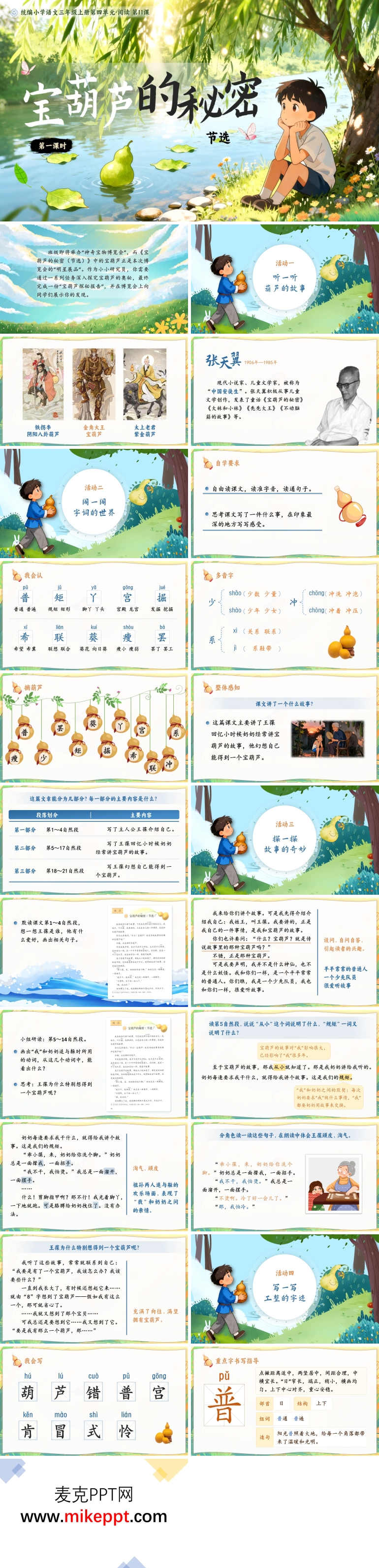 这是一套专为部编版语文三年级上册《宝葫芦的秘密(节选)》设计的PPT课件,共包含40张幻灯片。本节课的目的是帮助学生认识生字、读准字音,理清课文的叙事脉络,同时通过学习体会主人公淘气、爱幻想的童真形象,感受童话的奇妙魅力,激发学生的阅读兴趣。 该PPT从四个方面展开本节课程的学习。第一部分是“听一听葫芦的故事”。在这一部分中,通过结合图片,教师向学生介绍了铁拐李的阴阳八卦葫芦、金角大王的宝葫芦以及太上老君的紫金葫芦。这些生动的图片和故事背景不仅激发了学生的学习兴趣,还为他们理解课文内容提供了丰富的文化背景。 第二部分是“闯一闯字词的世界”。在这一部分中,教师帮助学生读准课文中的字音,认识多音字,并引导学生初读课文,掌握课文的大概内容。此外,教师还指导学生尝试对文章进行分段,帮助他们更好地理解课文的结构。这一环节不仅巩固了学生的字词知识,还为后续的深入学习打下了坚实的基础。 第三部分是“探一探故事的奇妙”。在这一部分中,教师针对课文内容进行详读,带领学生深入了解故事中的主人公王宝。通过分析王宝的性格特点和行为动机,学生能够更好地体会主人公淘气、爱幻想的童真形象,感受童话的奇妙魅力。这一环节通过互动式教学,帮助学生深入理解课文内容,激发他们的想象力和创造力。 第四部分是“写一写工整的字迹”。在这一部分中,教师针对重点生字进行书写指导,帮助学生掌握生字的部首、结构、组词和造句。通过规范的书写训练,学生不仅能够正确书写生字,还能提高他们的书写能力和语文素养。 通过这四个部分的学习,学生不仅能够认识生字、读准字音,还能理清课文的叙事脉络,深入理解主人公的形象和童话的魅力。这种由浅入深、循序渐进的教学设计,不仅符合三年级学生的认知特点,还能有效提升他们的语文能力和阅读兴趣,使他们在学习中获得知识的同时,也能在思想上得到启发。